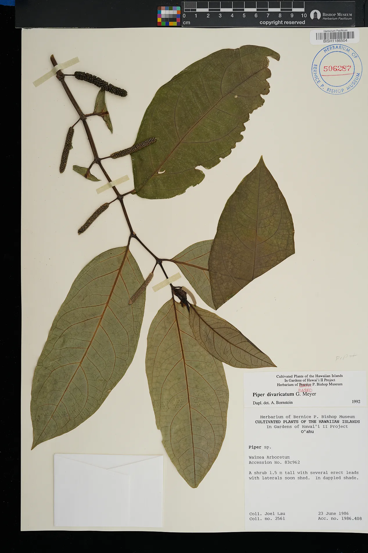 | 3 | Piper divaricatum | waimea arboretum | Supported by trellis; in full sun. | PRESERVED_SPECIMEN | lau, j. | collector number: 2561 | Oahu | BISH | 6/23/1986 |