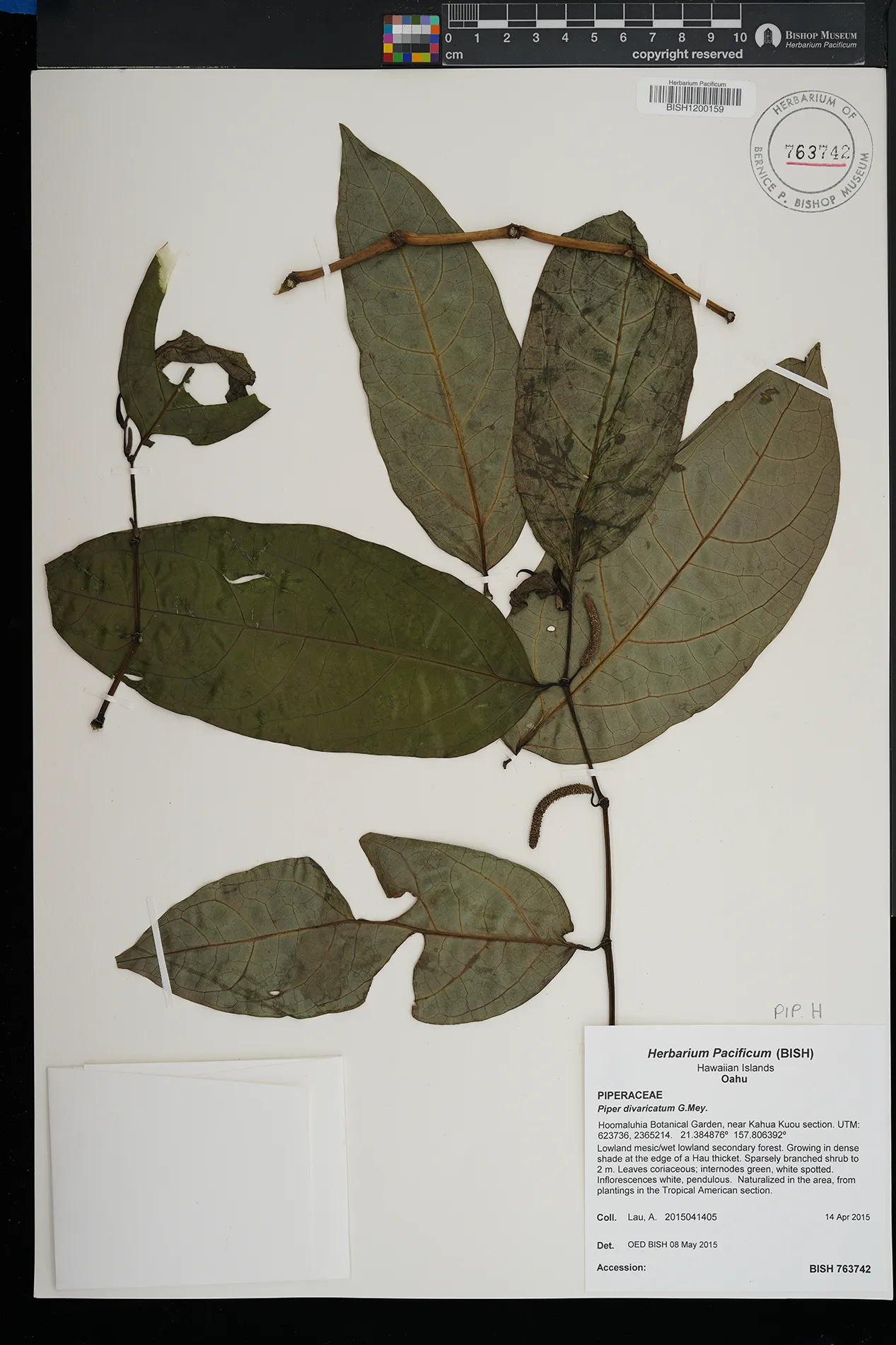 | 5 | Piper divaricatum | wahiawa botanic garden | PRESERVED_SPECIMEN | lau, j. cory, c. | collector number: 2248 | Maui | BISH | 4/14/1986 | |