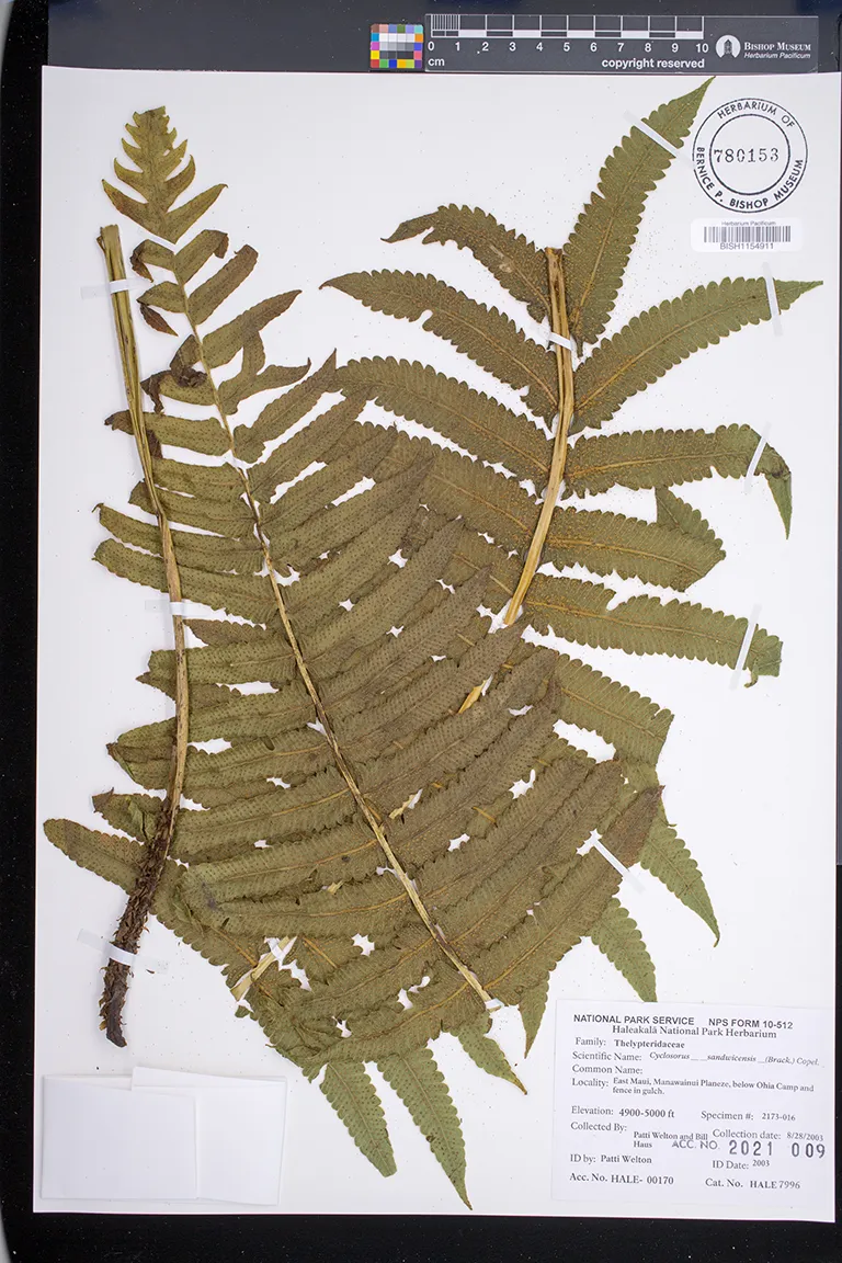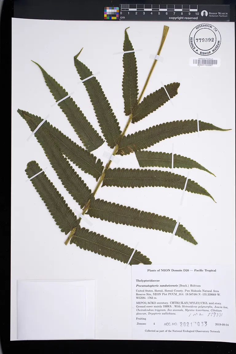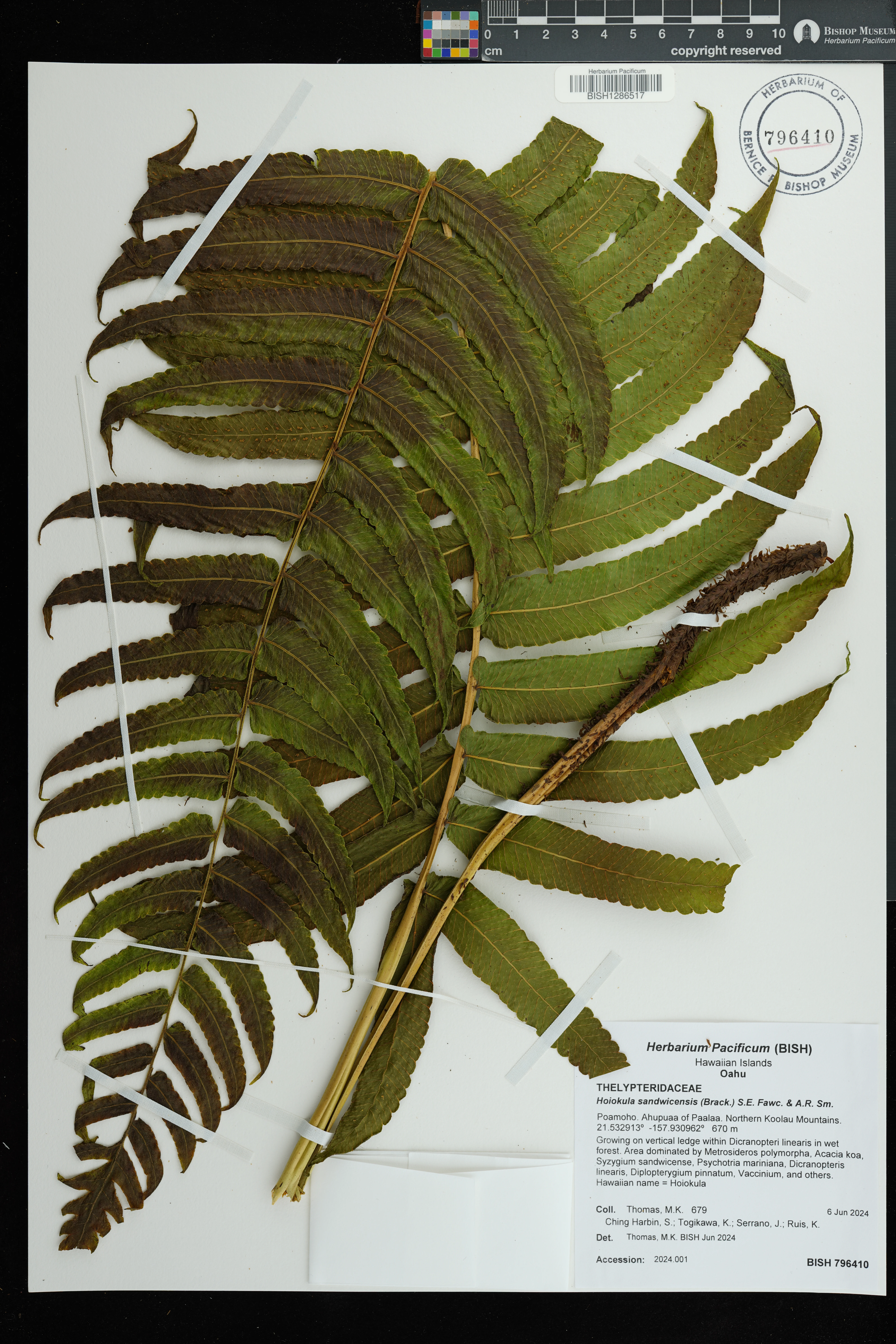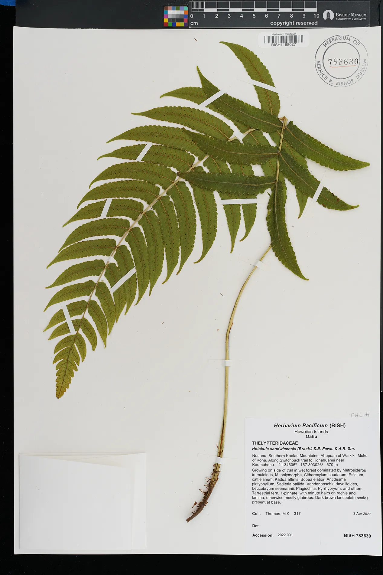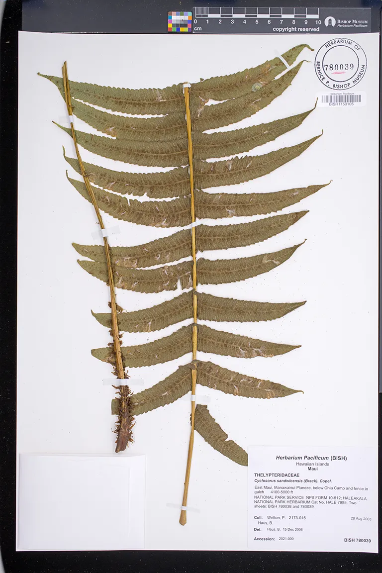 Palmer 2003:214 (K, O, Mo, L, M, H [as Pneumatopteris sandwicensis]); Palmer 2005:81 (KEY); Snow et al. 2011:15 (Syn. P. sandwicensis = Cyclosorus sandwicensis); Pteridophyte Phylogeny Group 2016:585 (Syn. C. sandwicensis = P. sandwicensis); Fawcett & Smith 2021:49 (COMBNOV, Syn. P. sandwicensis = H. sandwicensis)