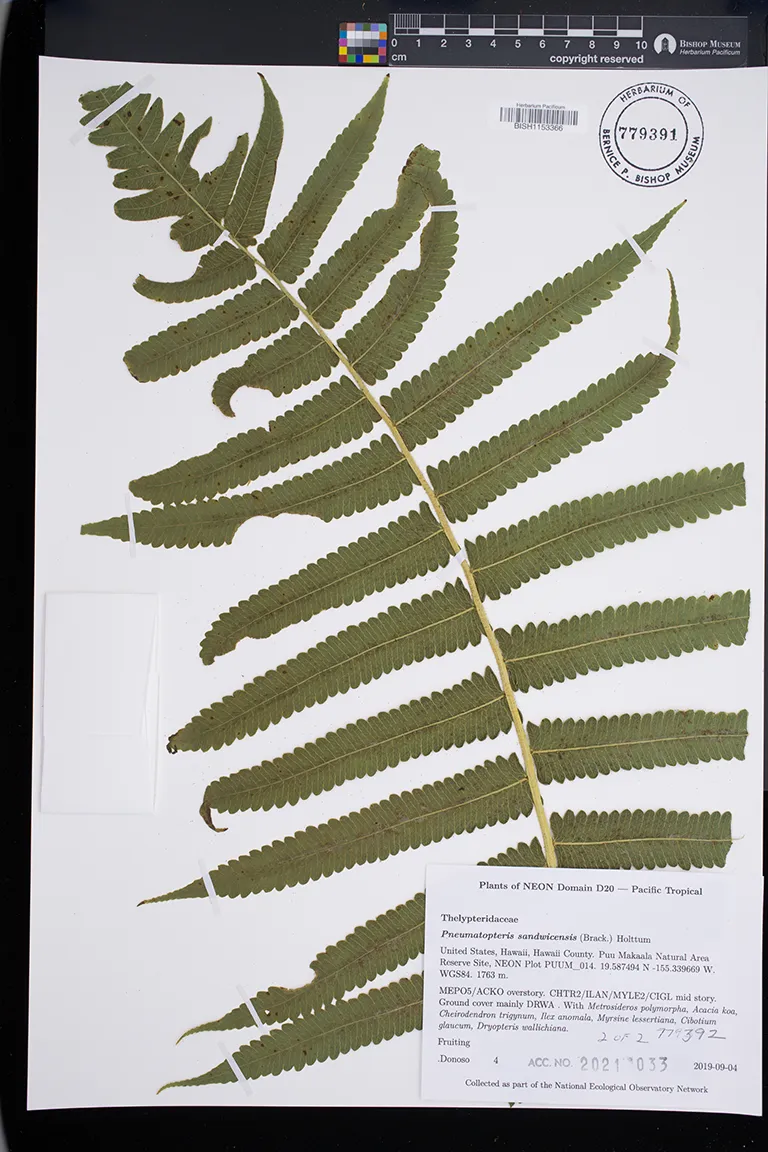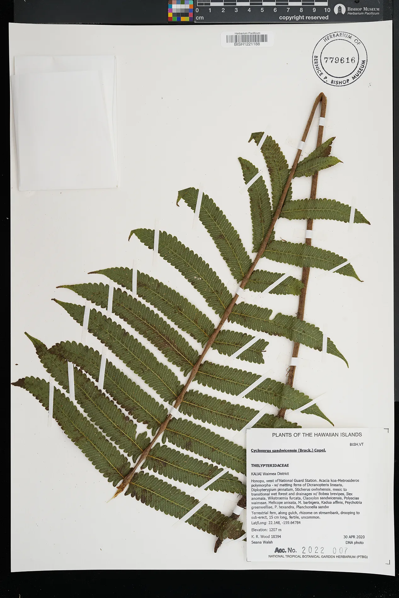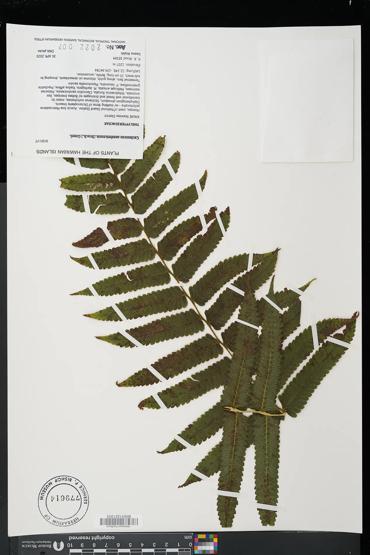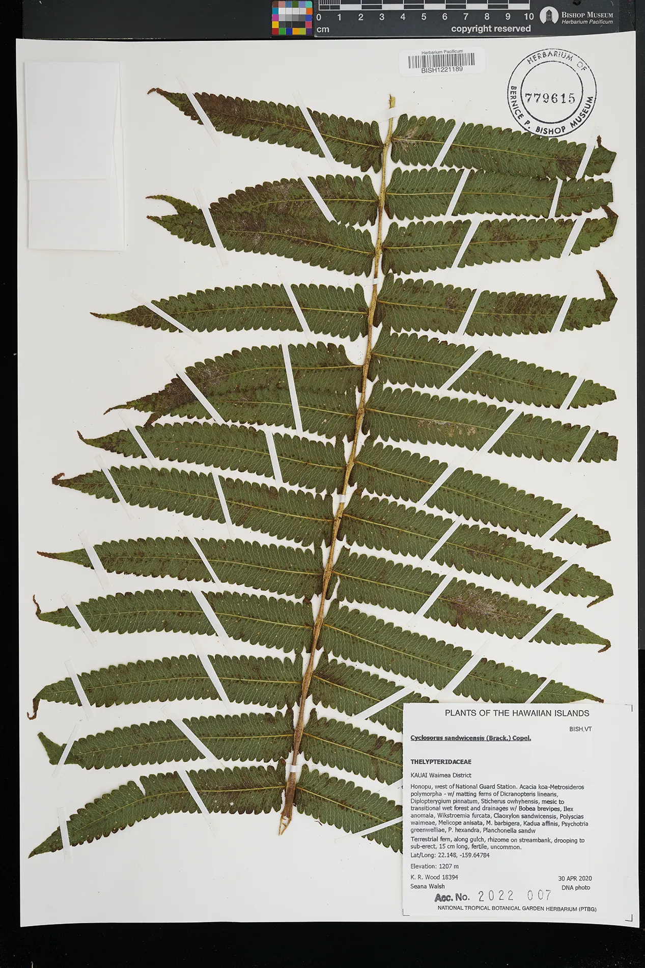 Palmer 2003:214 (K, O, Mo, L, M, H [as Pneumatopteris sandwicensis]); Palmer 2005:81 (KEY); Snow et al. 2011:15 (Syn. P. sandwicensis = Cyclosorus sandwicensis); Pteridophyte Phylogeny Group 2016:585 (Syn. C. sandwicensis = P. sandwicensis); Fawcett & Smith 2021:49 (COMBNOV, Syn. P. sandwicensis = H. sandwicensis)