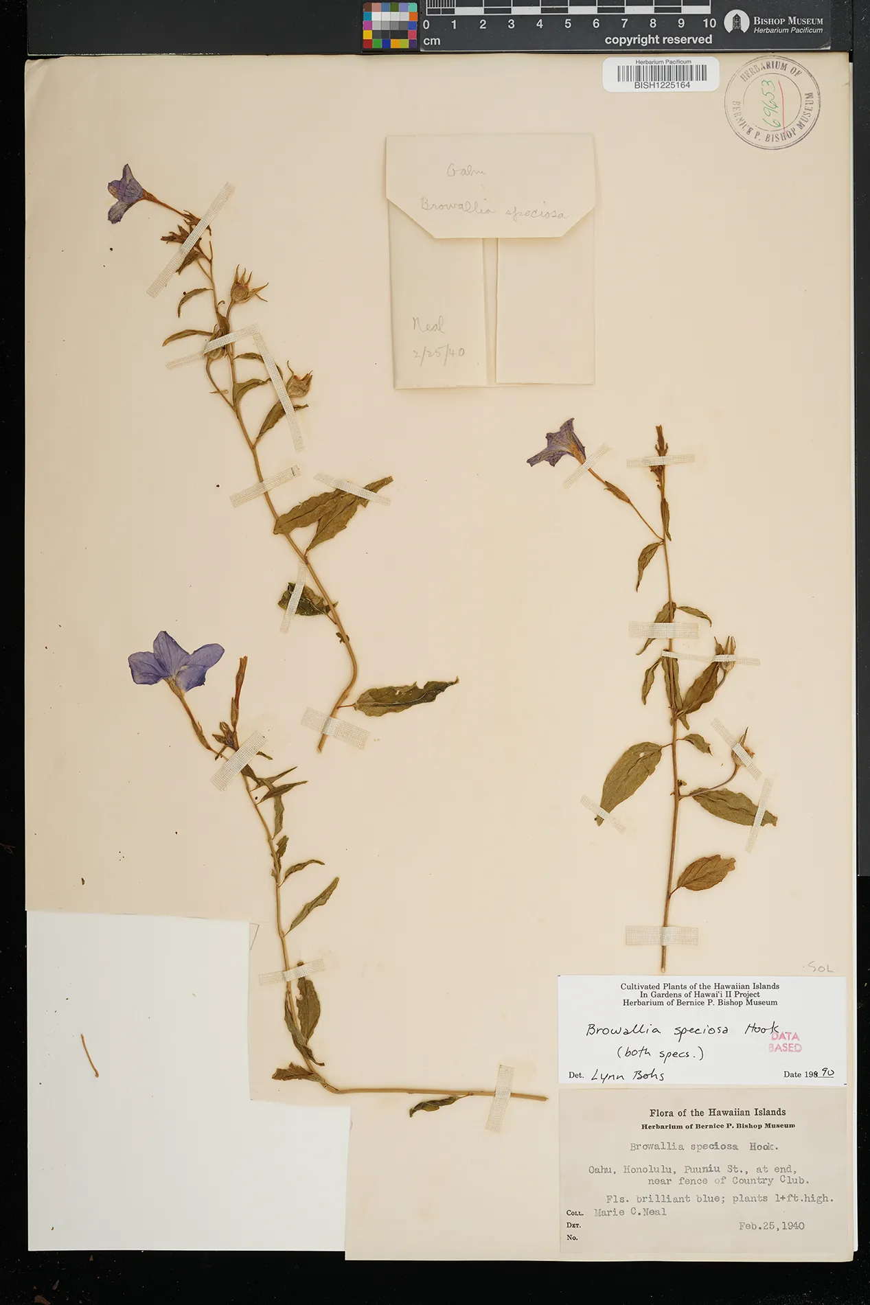 | 3 | Browallia speciosa | Hook. | Honolulu, Puuniu St., at end near fence of Country Club | PRESERVED_SPECIMEN | Neal, M.C. | s.n. | Oahu | BISH | 2/25/1940 | |