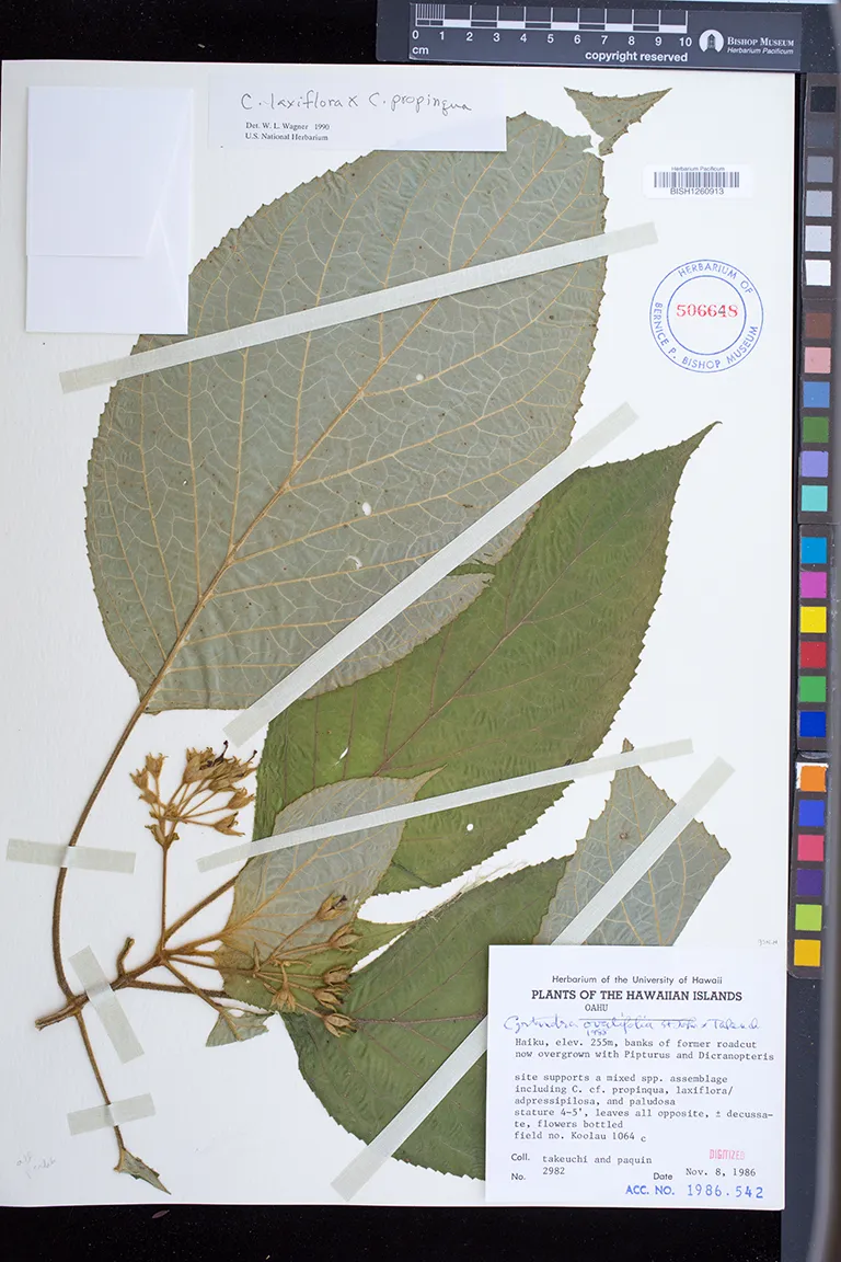 Tall shrub concealed in Cibotium and Cordyline, stout branches generally foliated only at the tips, lvs opposite, axilliflorous & cauliflorous. |