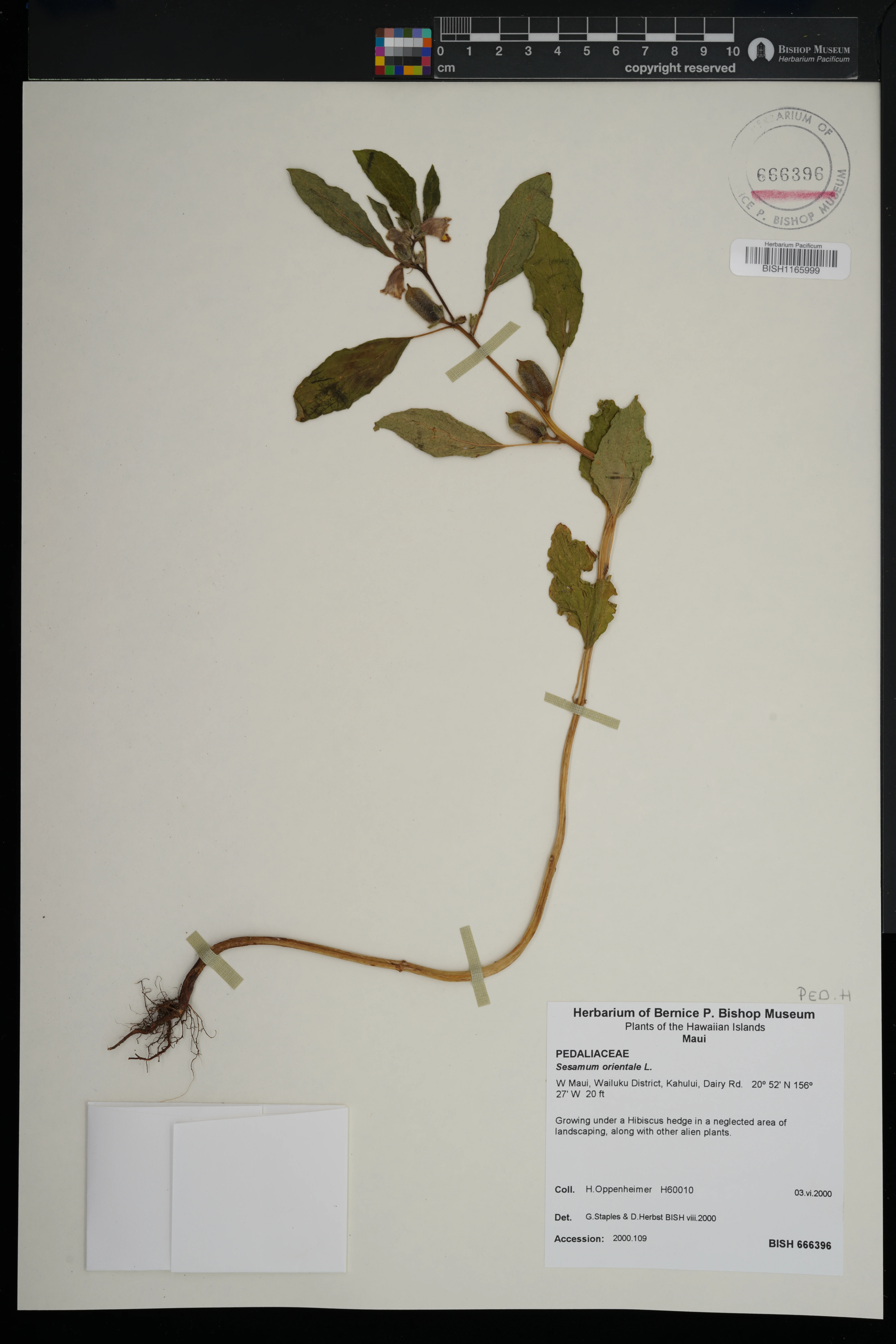 | 12 | Sesamum indicum | L. | W Maui, Wailuku District, Kahului, Dairy Rd | Growing under a Hibiscus hedge in a neglected area of landscaping, along with other alien plants. | PRESERVED_SPECIMEN | Oppenheimer, H.L. | H60010 | Maui | BISH | 6/3/2000 |
