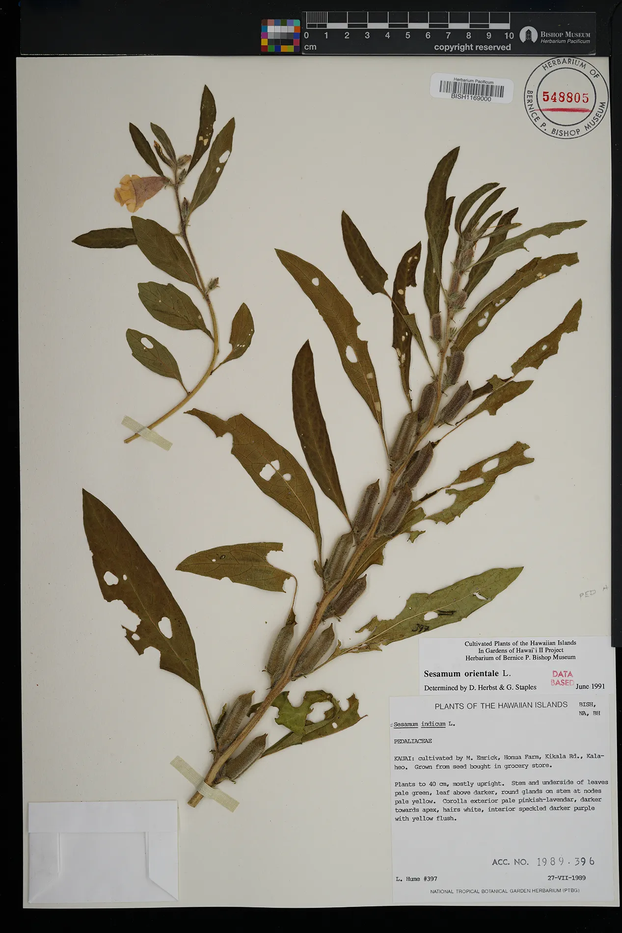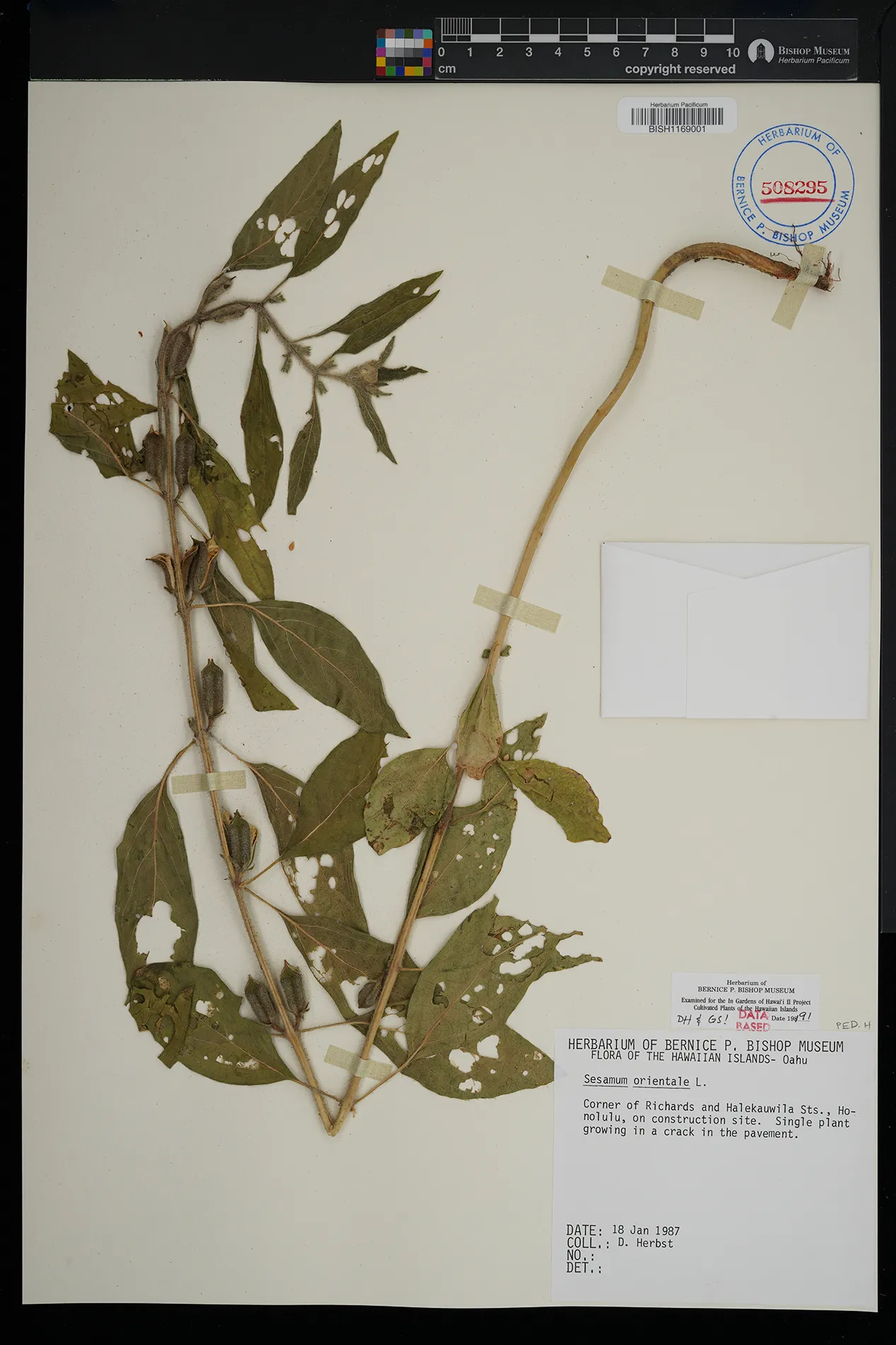 | 6 | Sesamum indicum | L. | Cultivated by M. Emrick, Honua Farm, Kikala Rd., Kalaheo | PRESERVED_SPECIMEN | Hume, L. | 397 | Kauai | BISH | 7/27/1989 | |