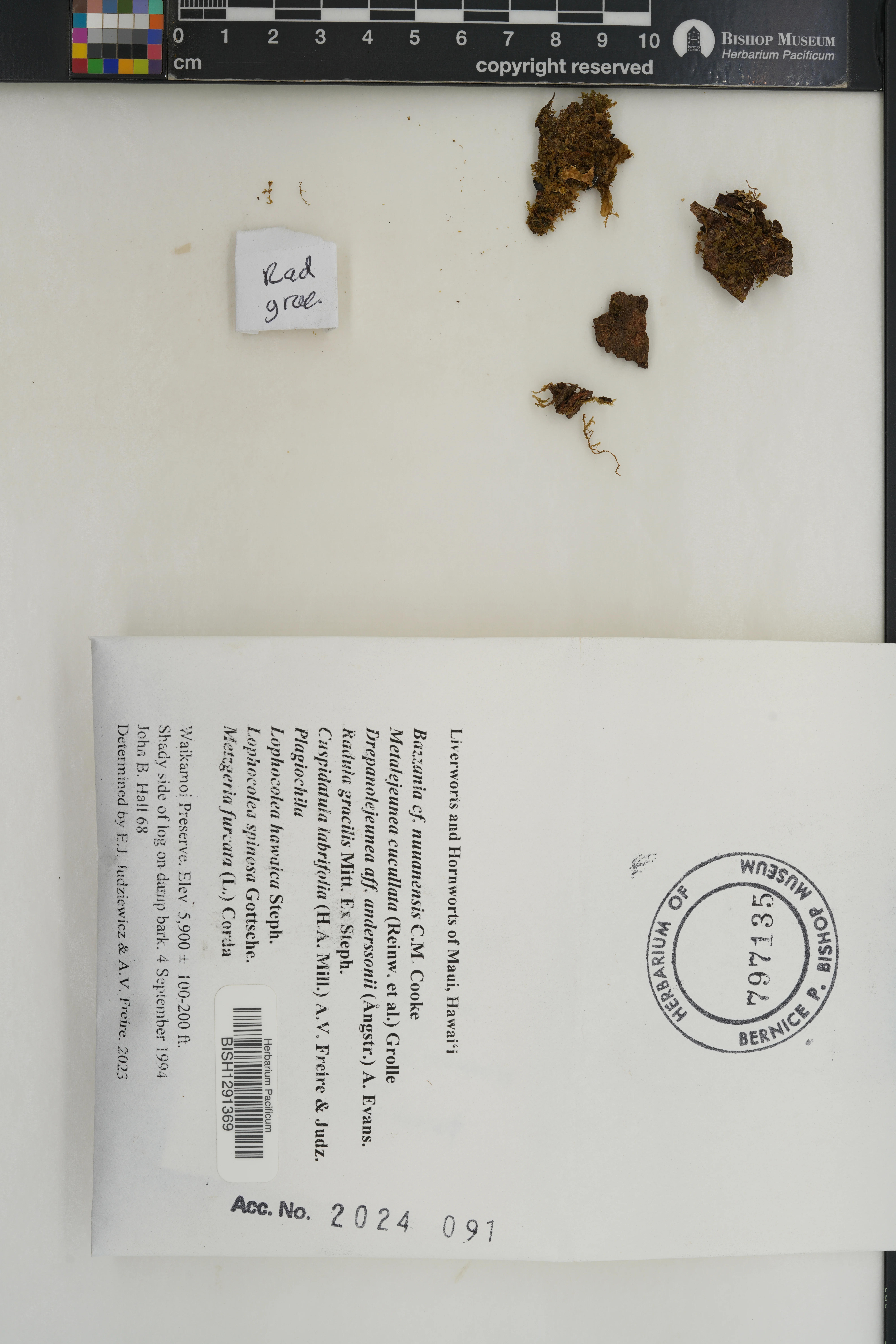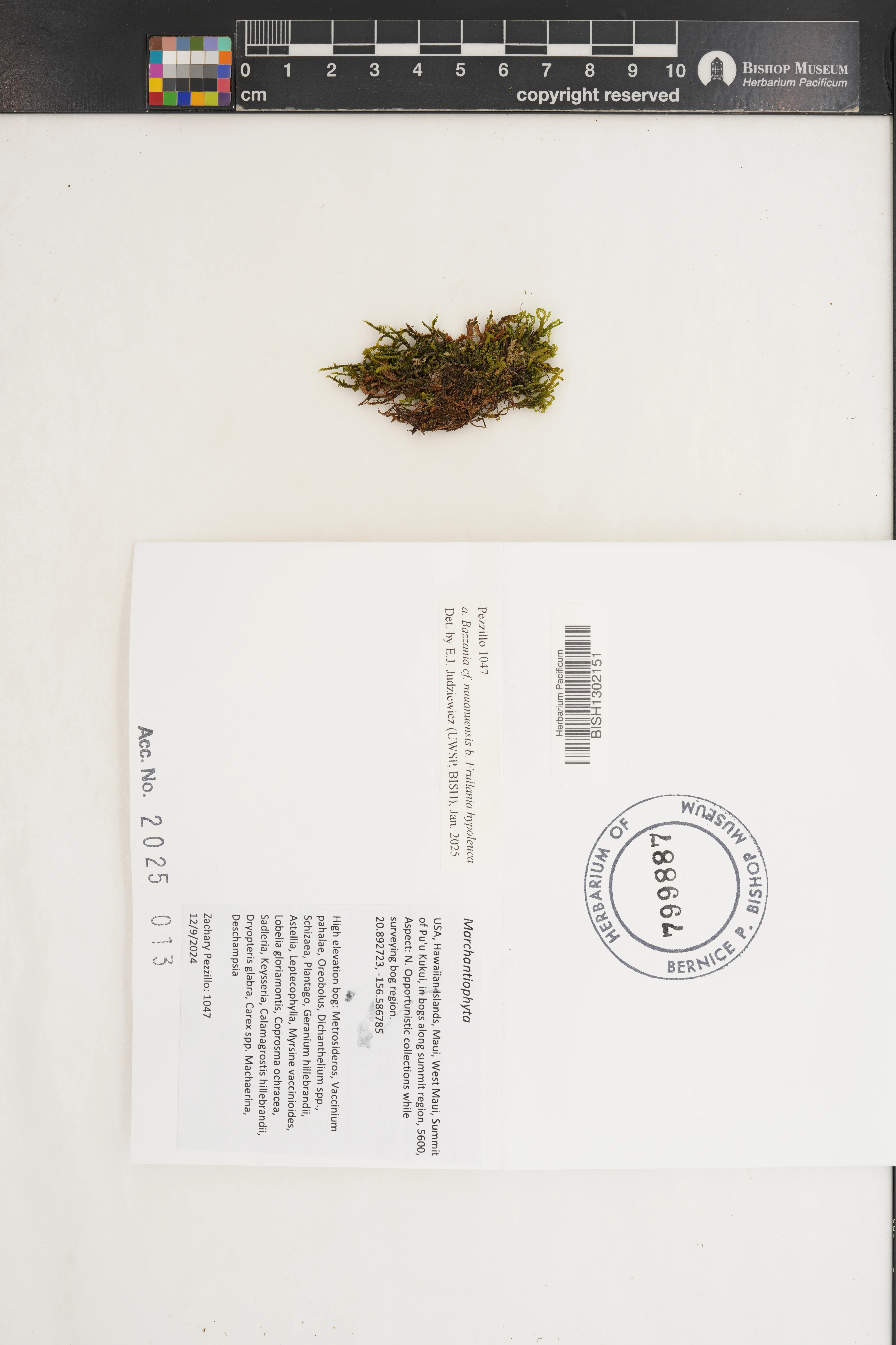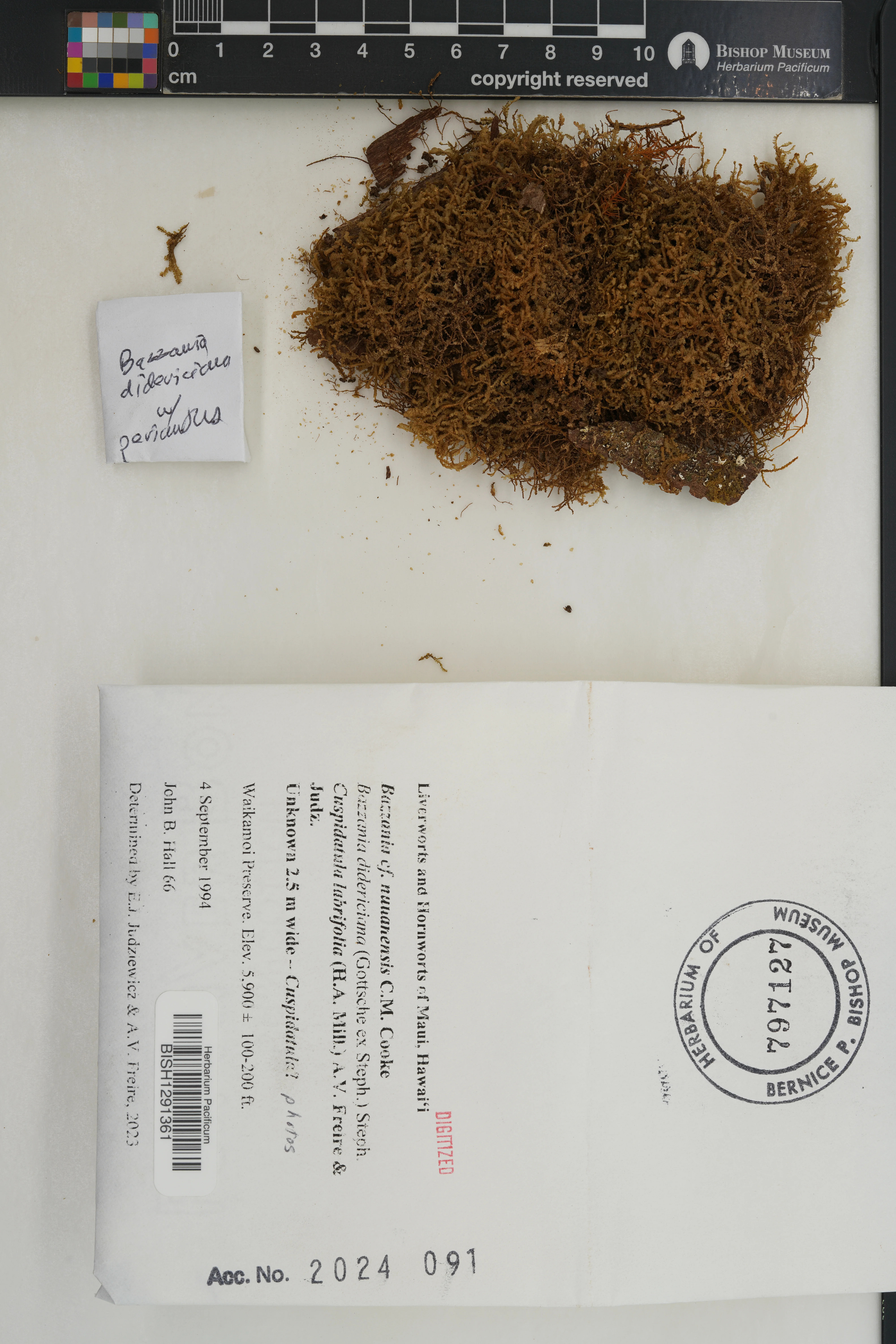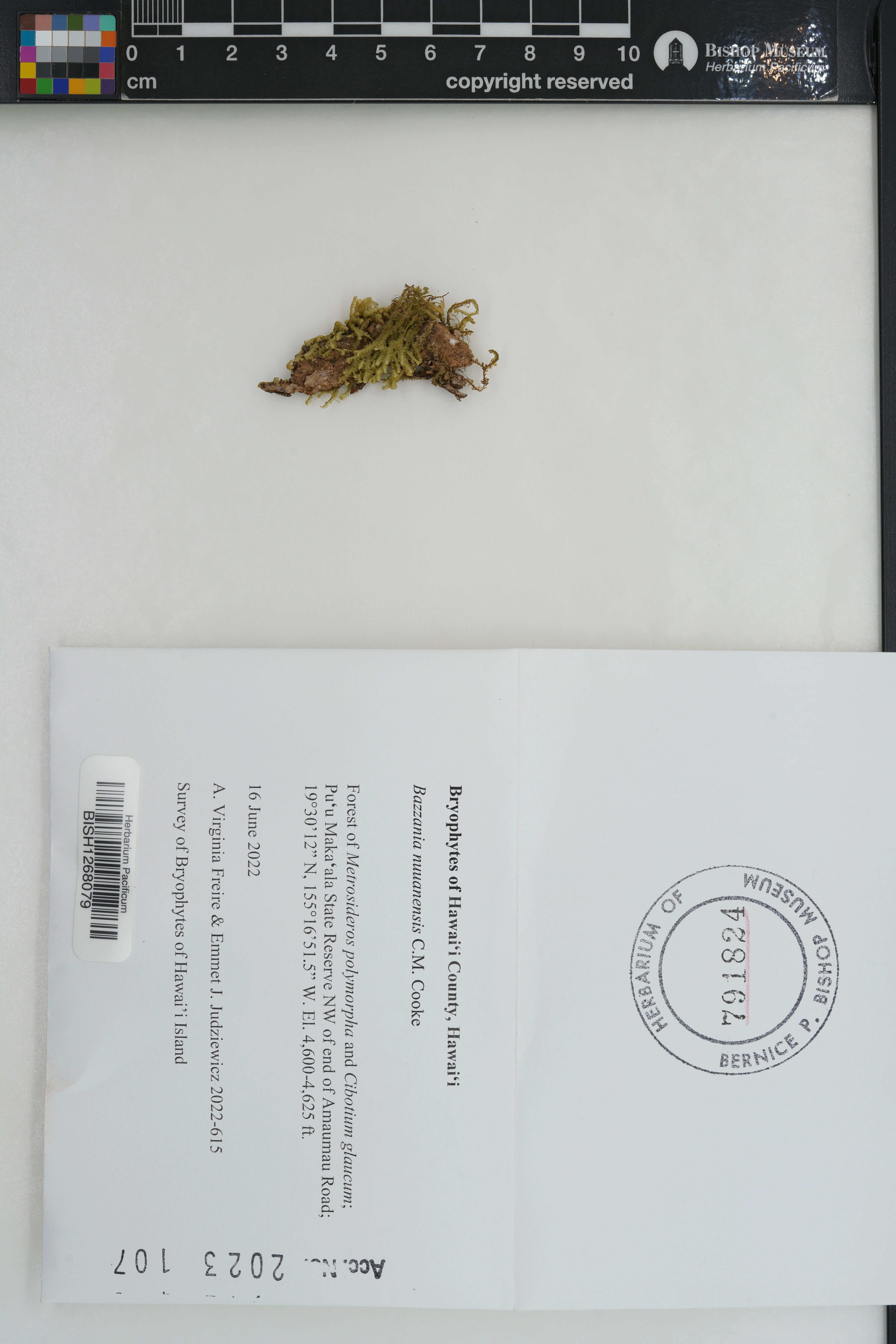 Kingdom: Viridiplantae Phylum: Marchantiophyta Class/Clade: Jungermanniopsida Order: Jungermanniales Family: Lepidoziaceae Genus: Bazzania