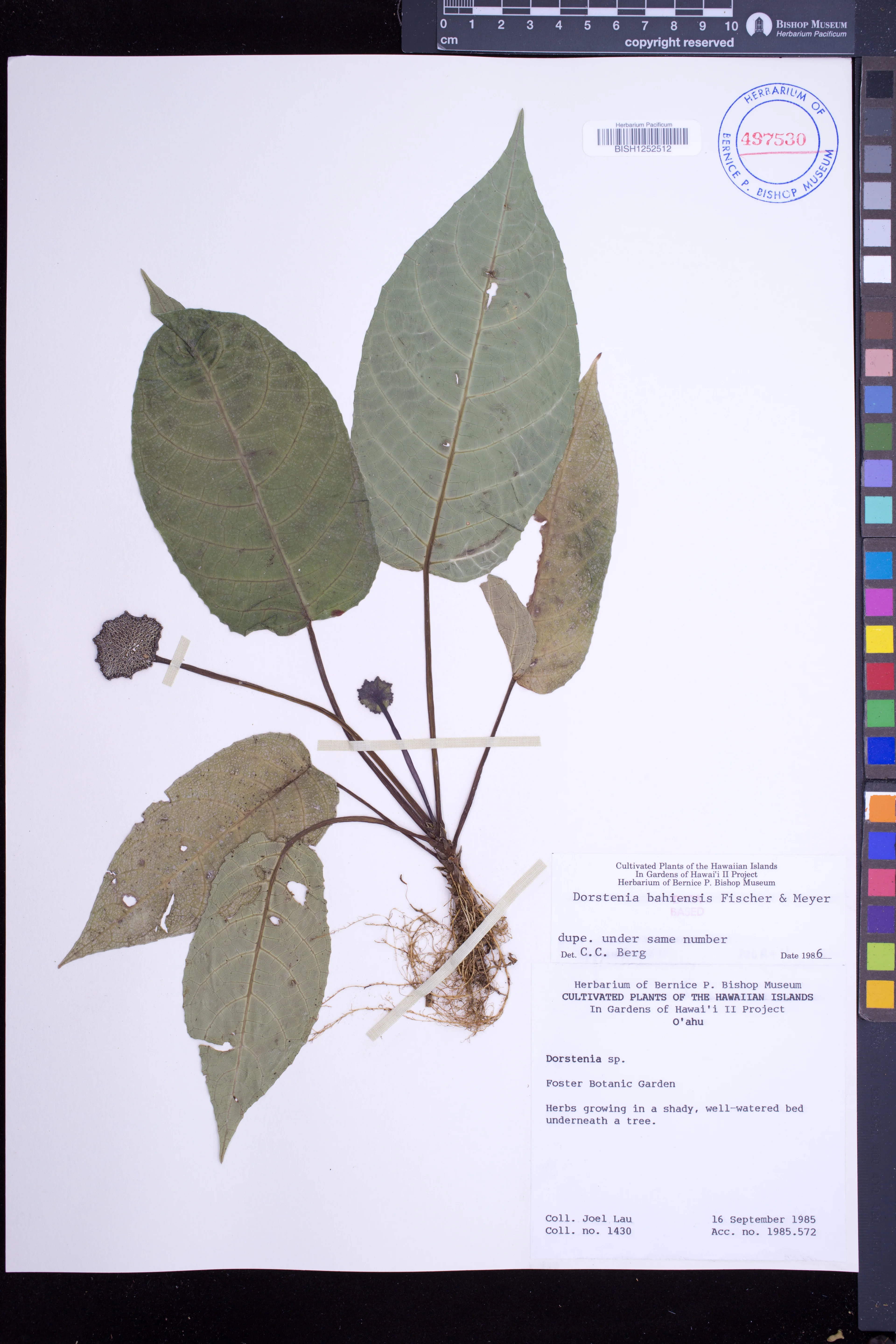 | 4 | Dorstenia bahiensis | Klotzsch ex Fisch. & C.A.Mey. | foster garden | PRESERVED_SPECIMEN | lau, j. | collector number: 1430 | Oahu | BISH | 9/16/1985 | |
