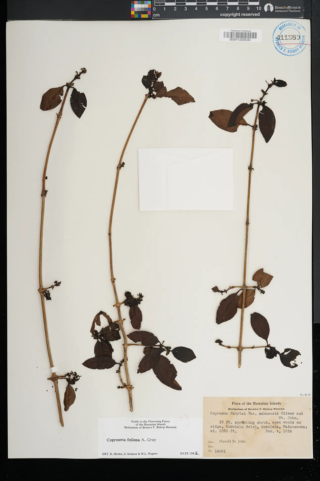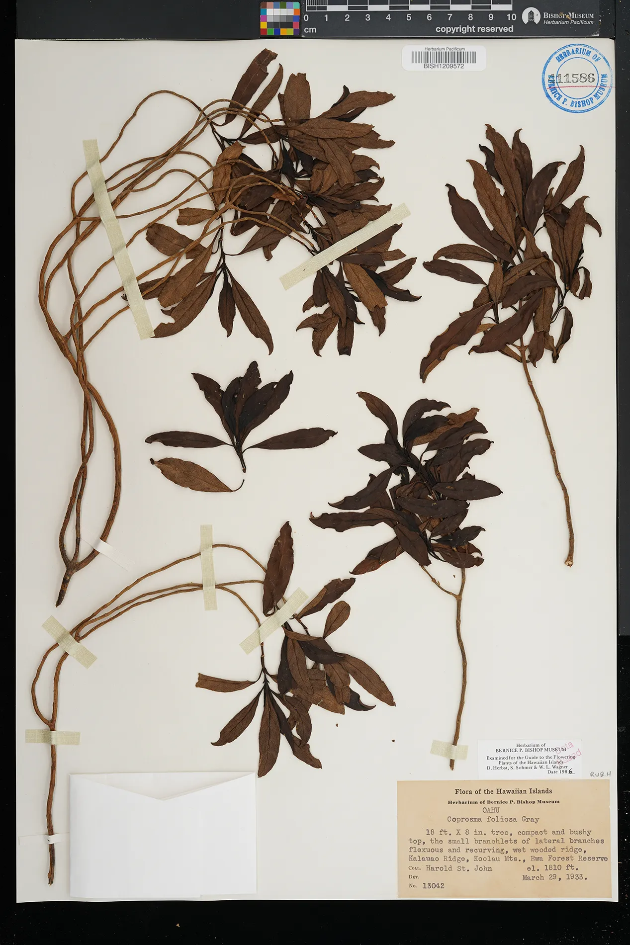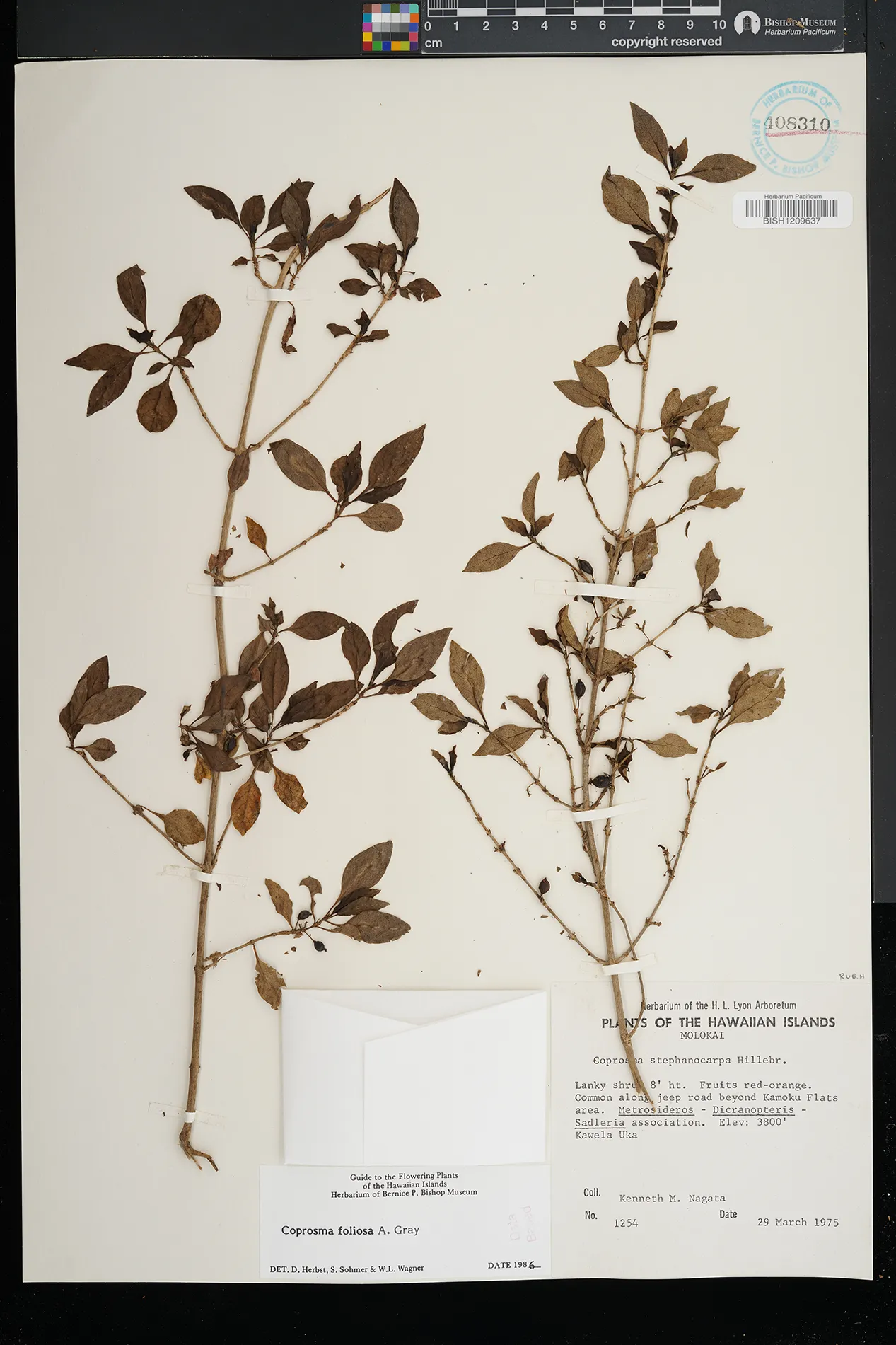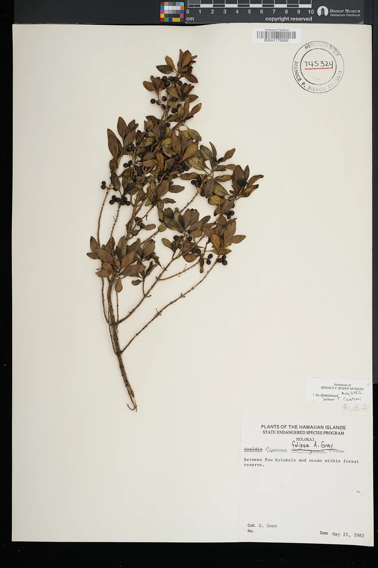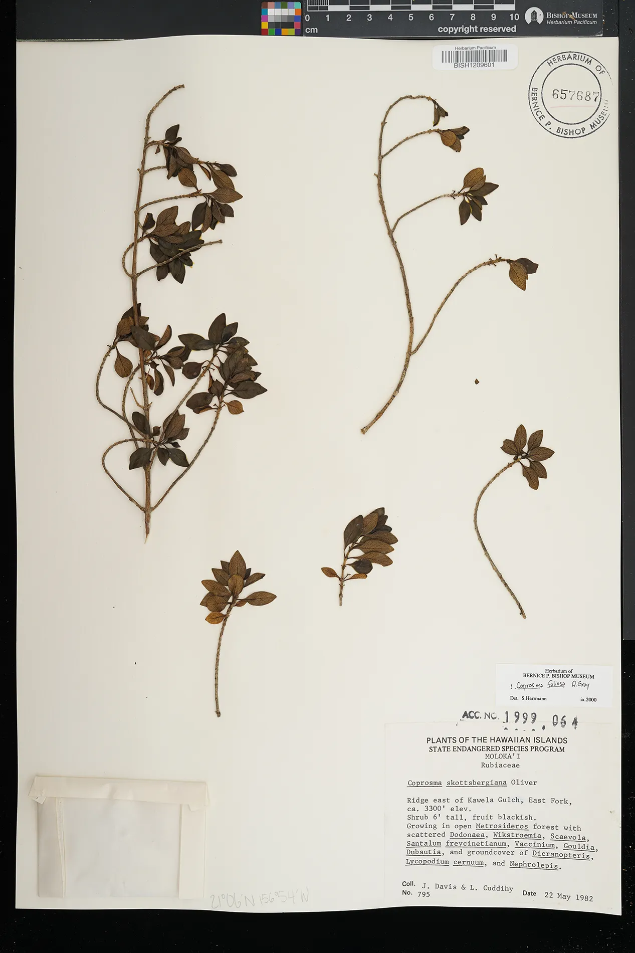 Growing in open Metrosideros forest with scattered Dodonaea, Wikstroemia, Scaevola, Santalum freycinetianum, Vaccinium, Gouldia, Dubautia, and groundcover of Dicranopteris, Lycopodium cernuum, and Nephrolepis. |