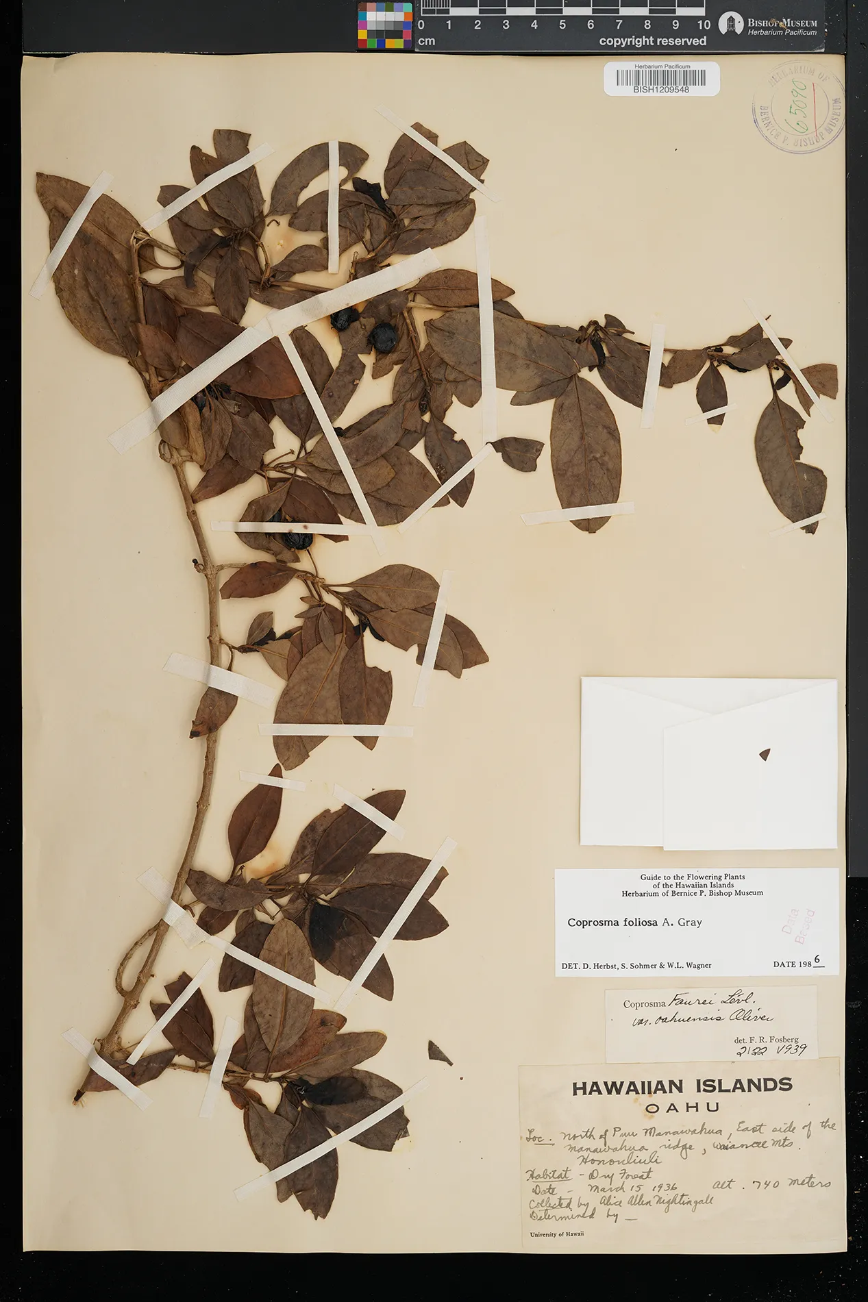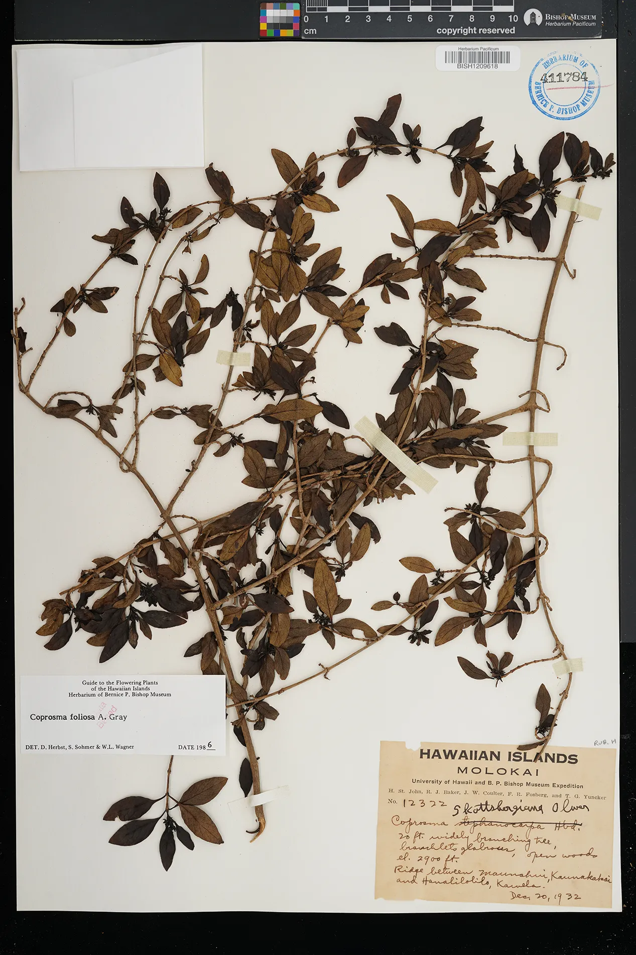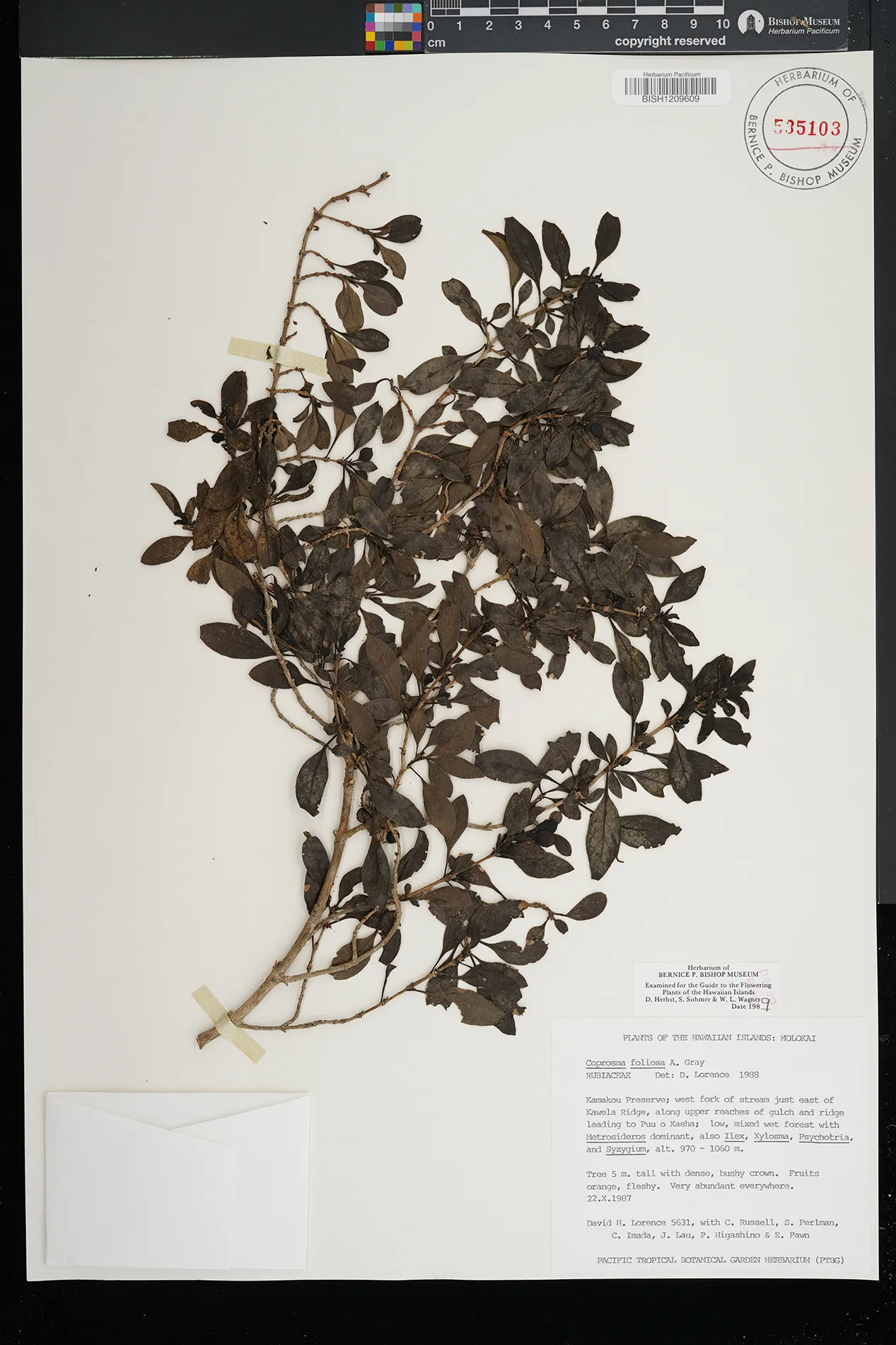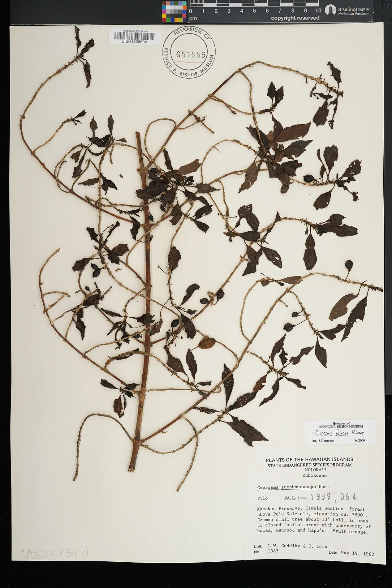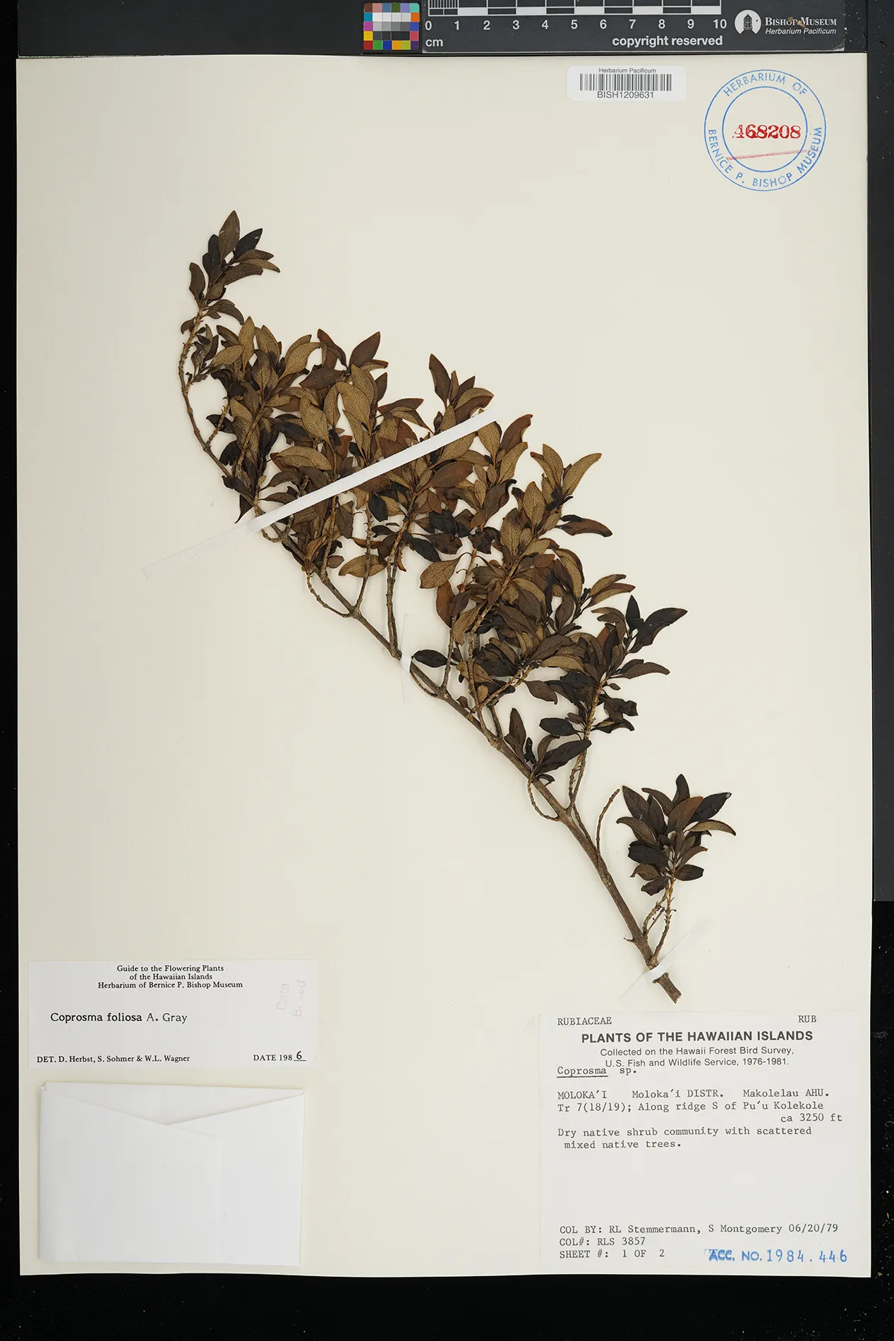Metrosideros-Acacia-Alphitonia montane mesic forest with Euphorbia atrococca, Myrsine lanaiensis, Dodonaea viscosa, Psychotria mariniana, Wikstroema furcata, Diospyros sandwicensis, Kadua affinis, Coprosma waimeae, C. foliosa, Polyscias kavaiensis, Anti |