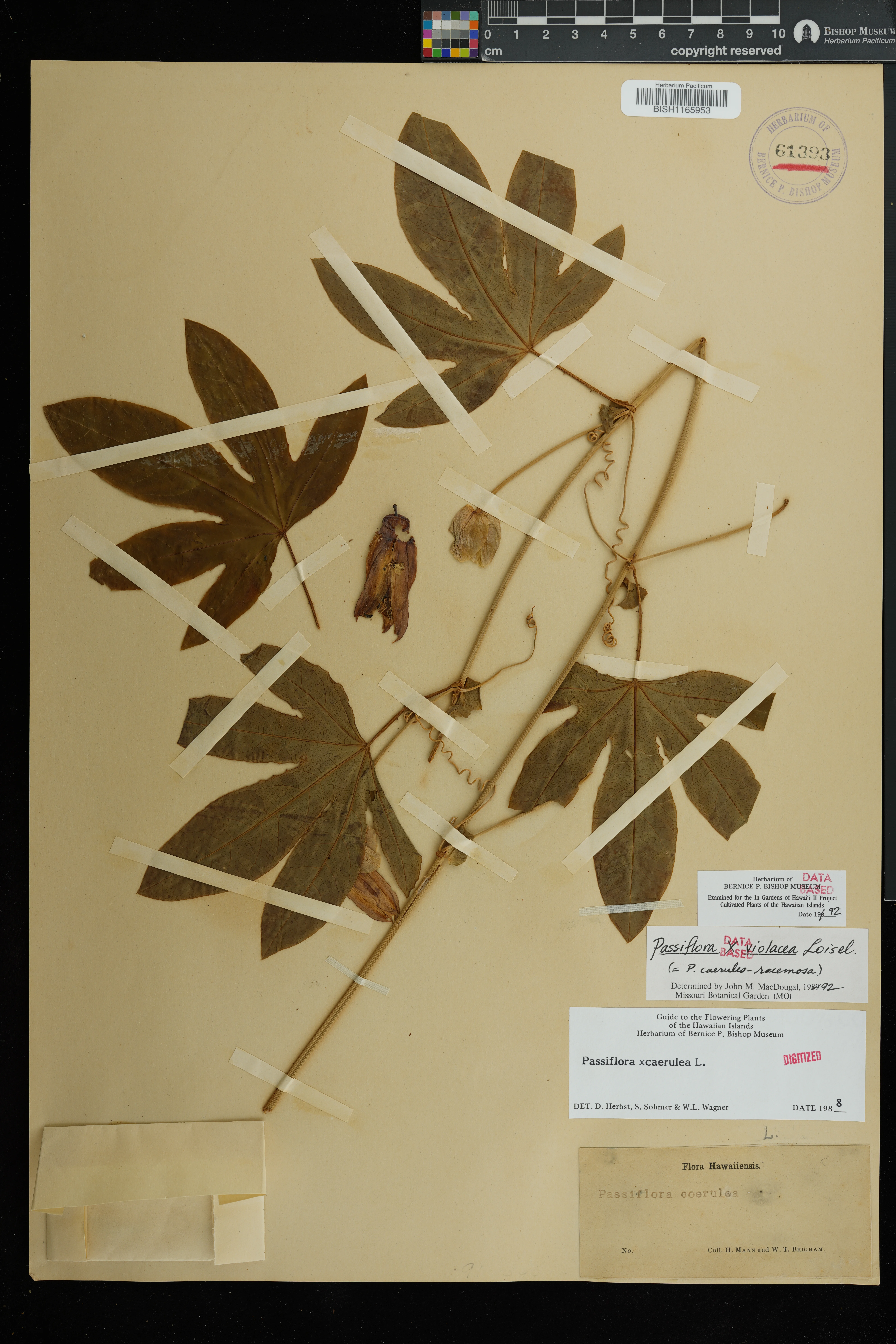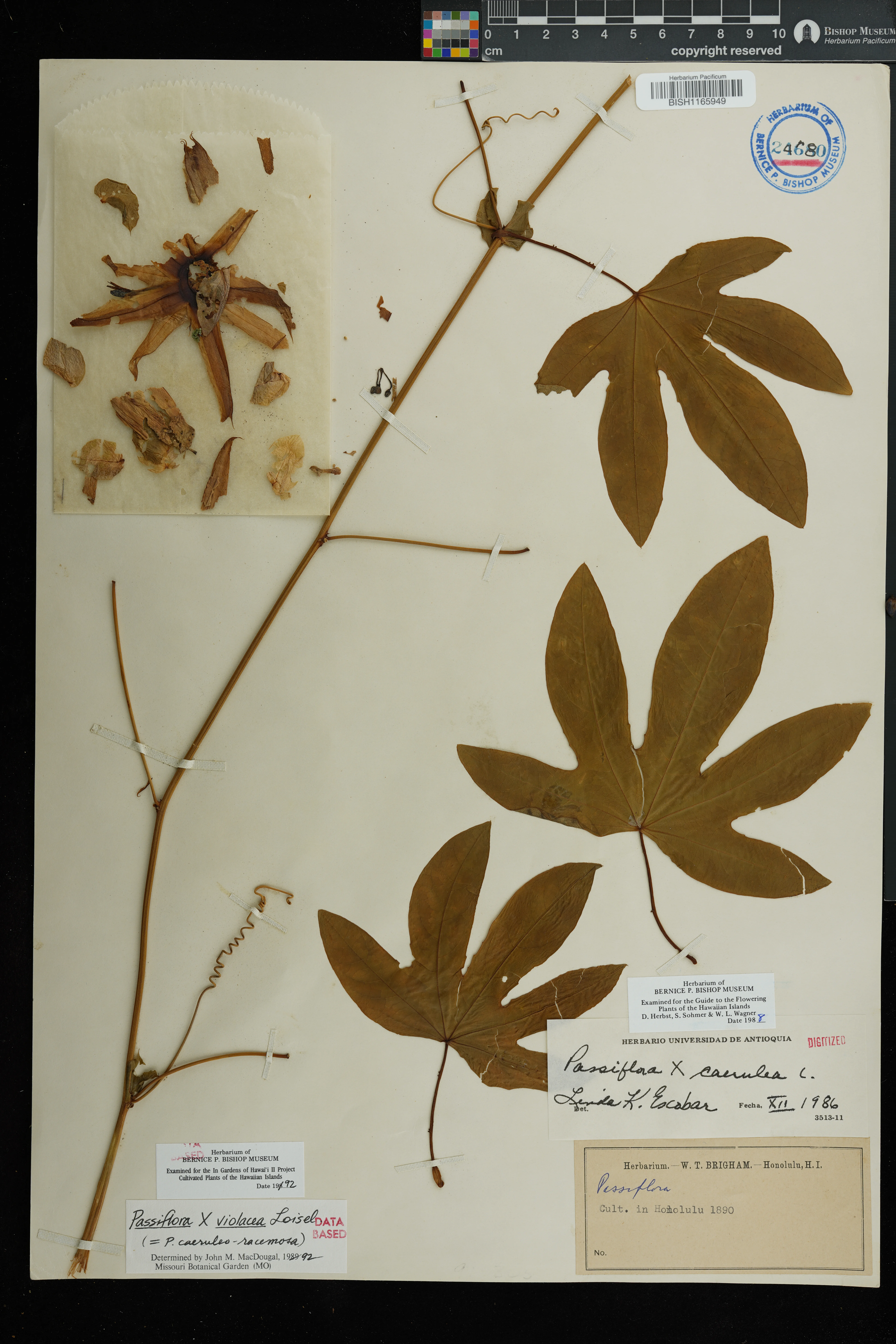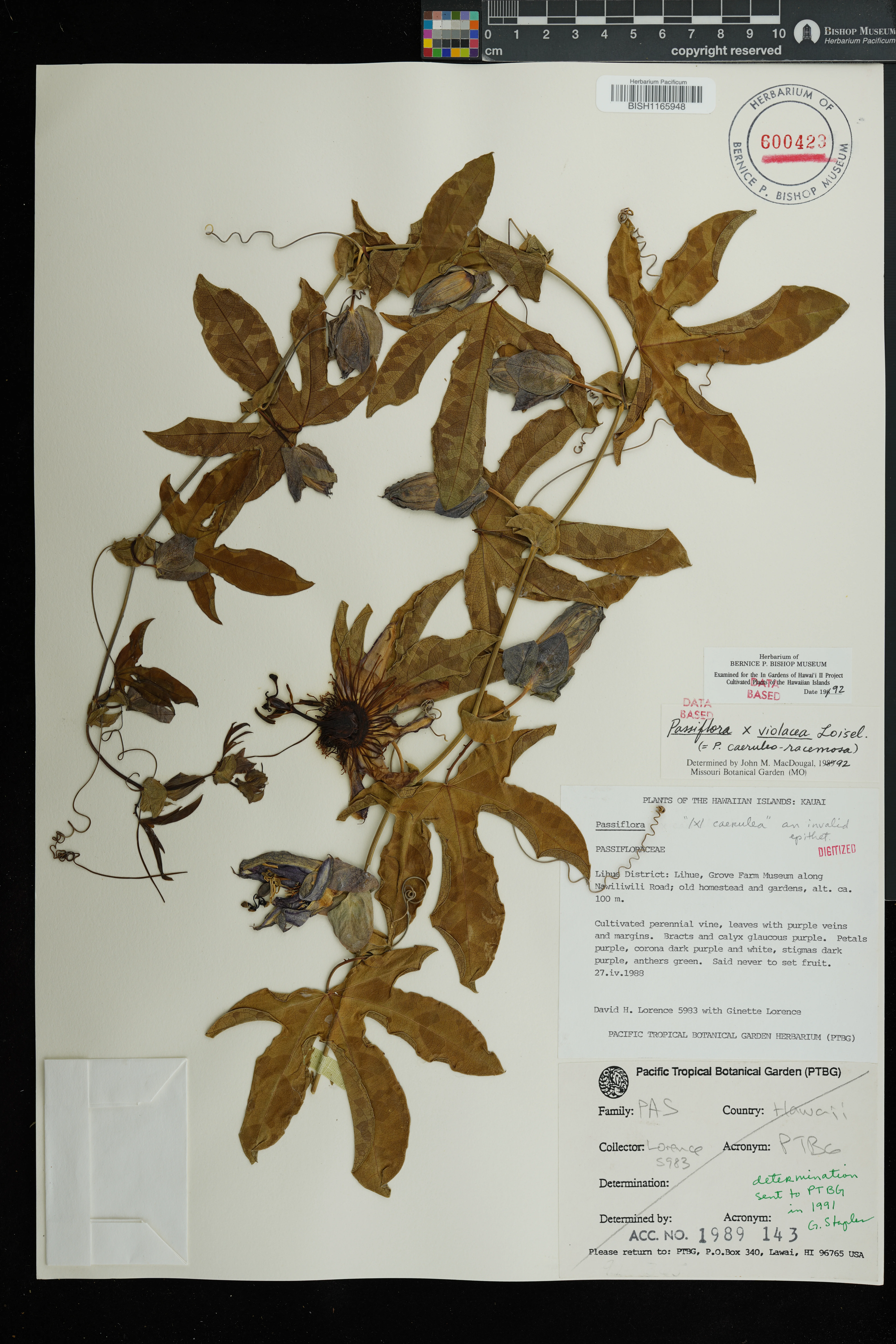 Wagner et al. 1990:1010 (K, O [as P. × caerulea]); Starr et al. 1999:13 (EM, P. × caerulea misapplied = P. × violacea); Staples & Herbst 2005:450 (KEY), 451 (DESCR); Faccenda, Arthur, et al. 2025:200 (remove EM [re-IDed as P. caerulea]); Note: stabilized hybrid