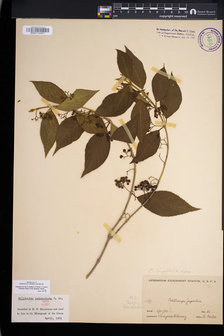 | 10 | Callicarpa pedunculata | R.Br. | Vineyard St. Nursery, H.S.P.A | PRESERVED_SPECIMEN | Forbes, A. | 21 | Oahu | BISH | 7/31/1929 |