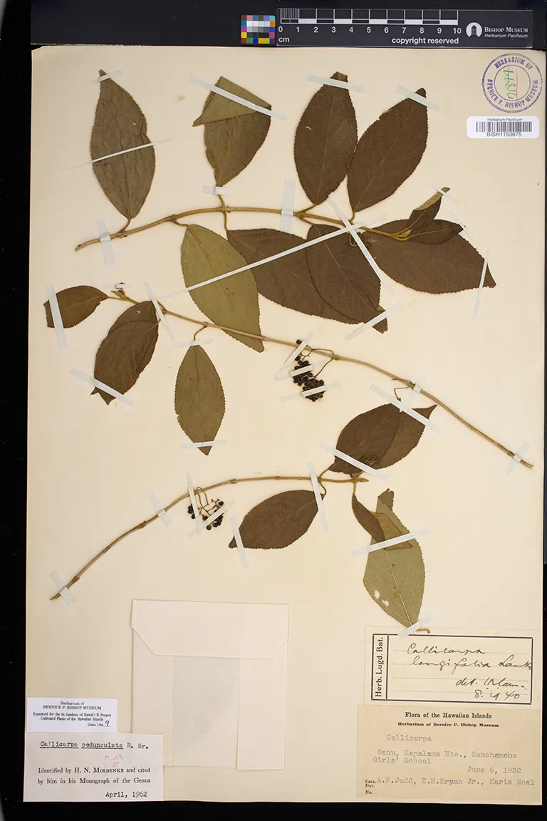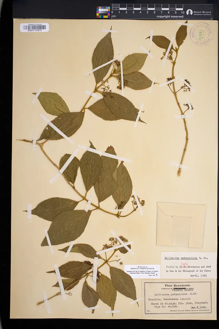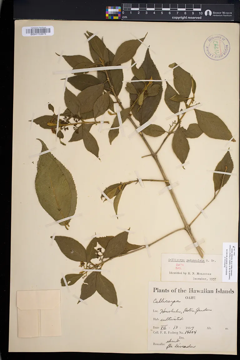 | 5 | Callicarpa pedunculata | R.Br. | honolulu, foster garden | PRESERVED_SPECIMEN | fosberg, f.r. | collector number: 14204 | Oahu | BISH | 7/13/1937 | |