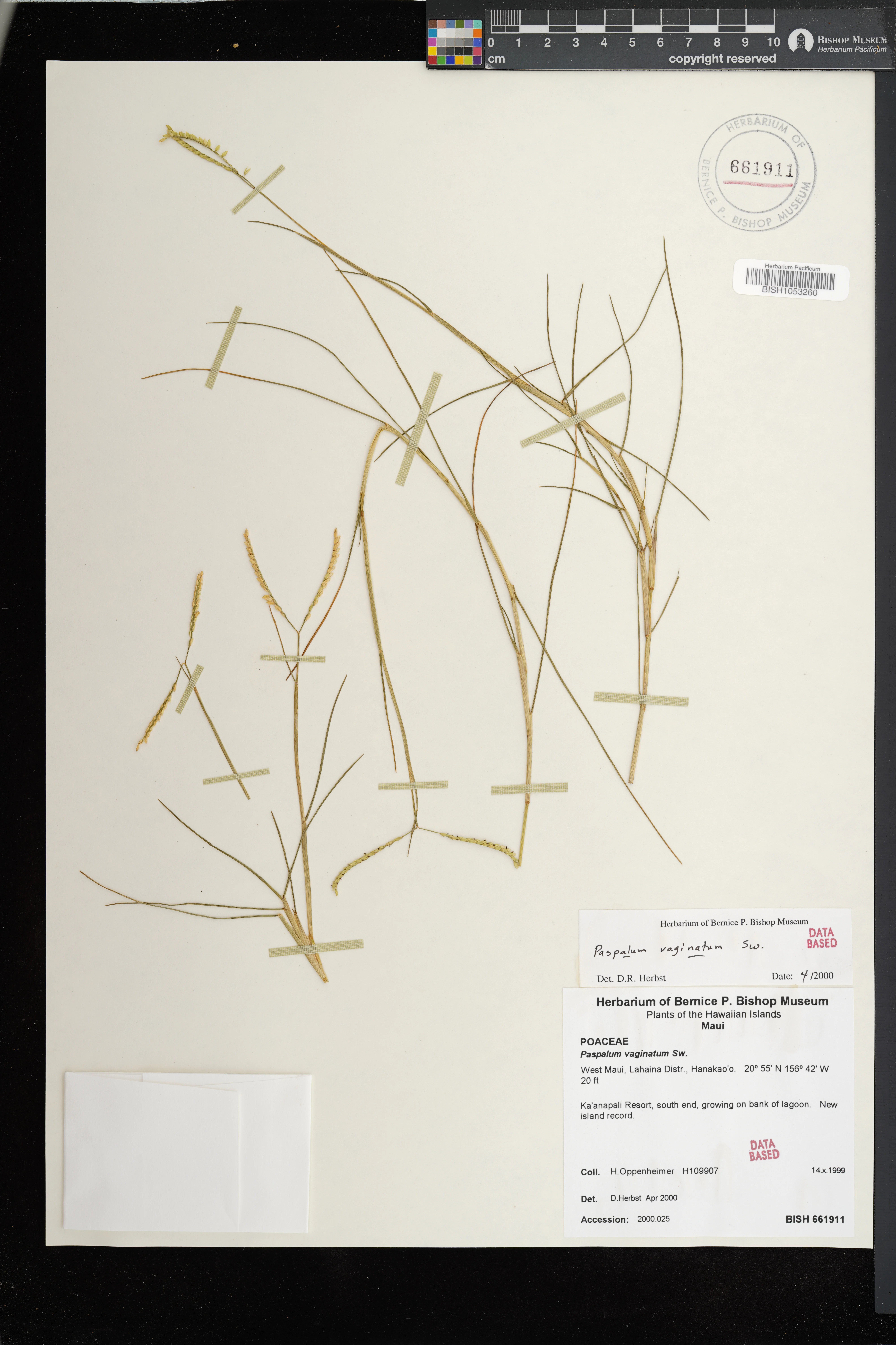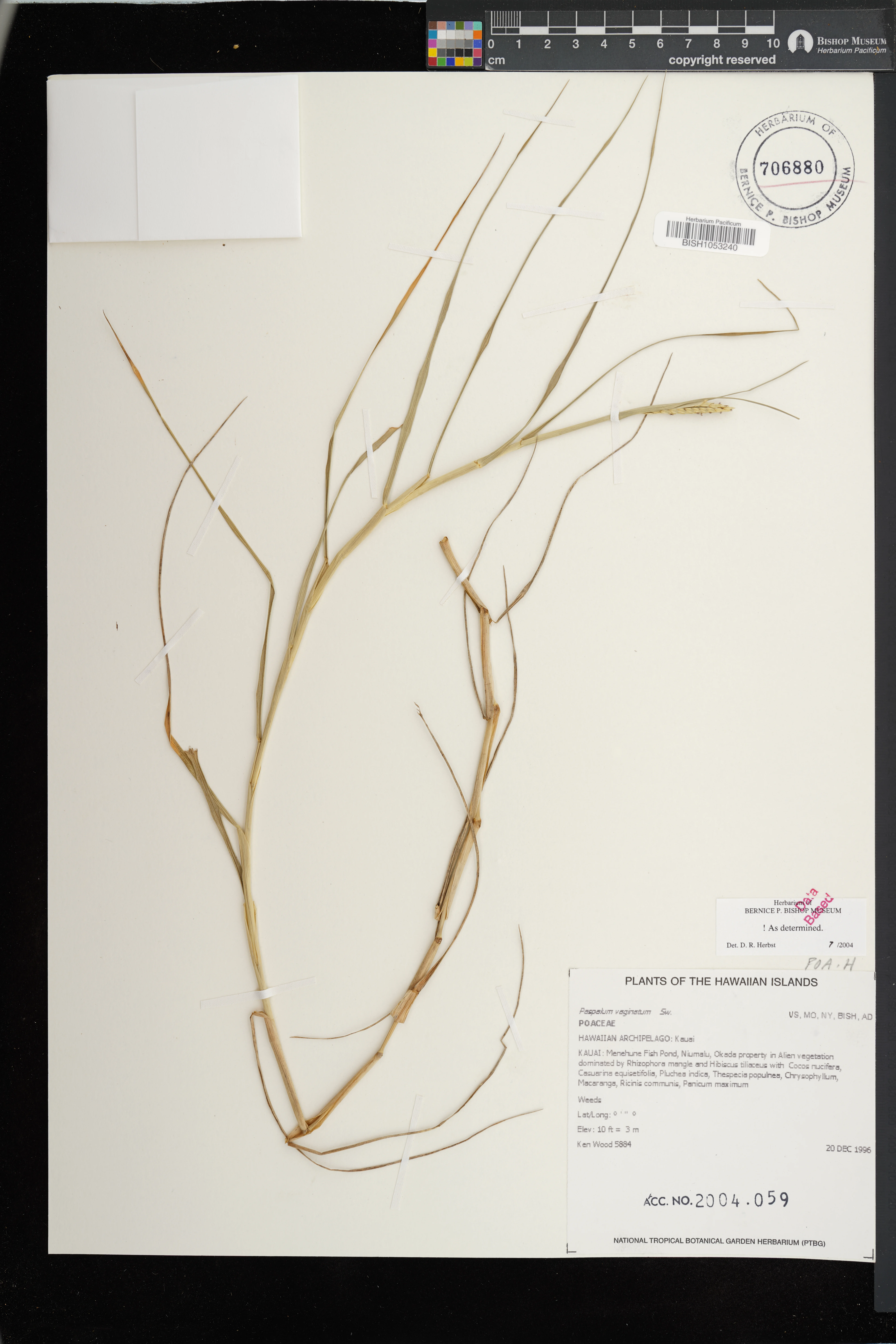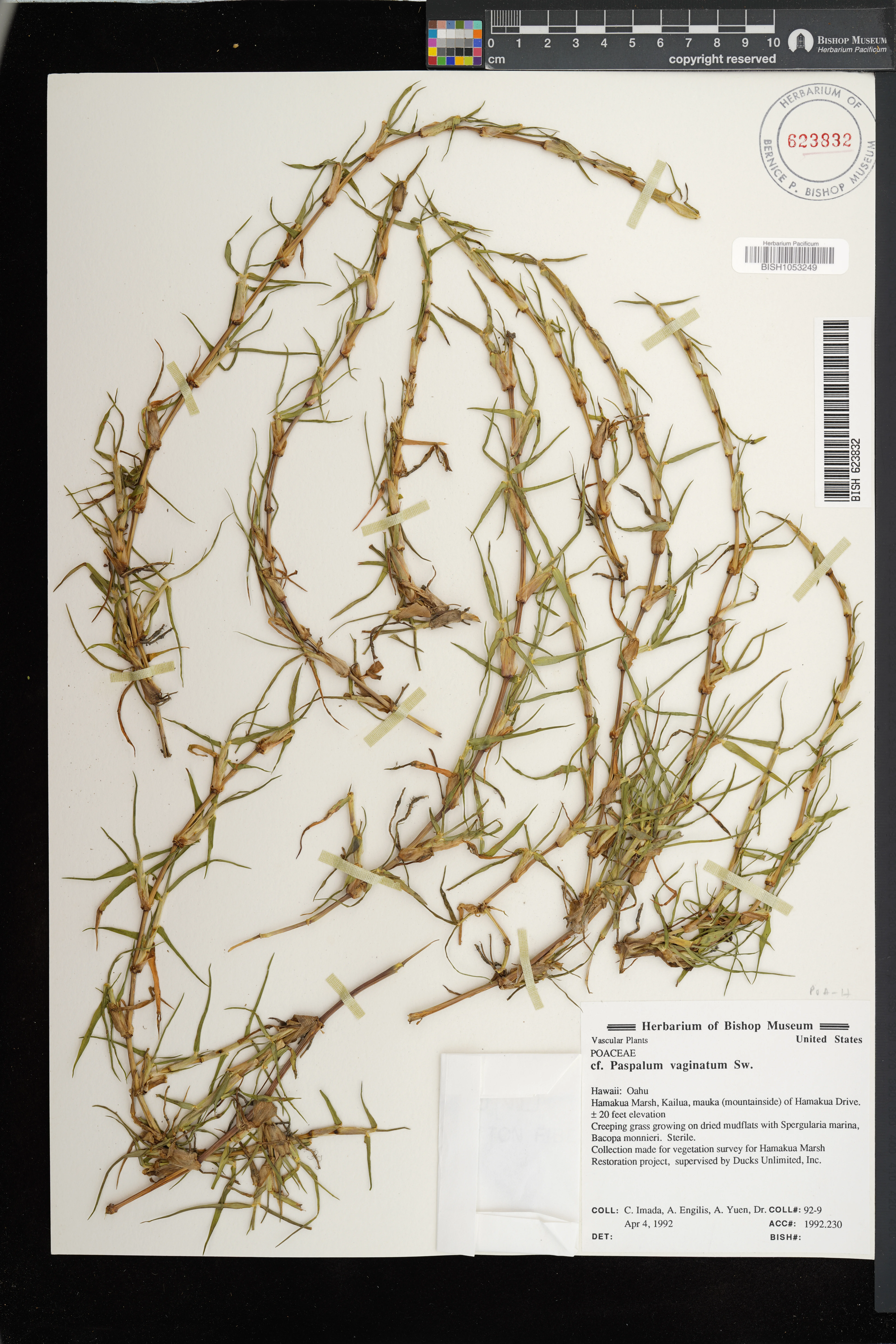 Common weedy grass on pond banks in former baitfish facility W of Kealia Pond. Associated with Distichlis spicata, Pluchea indica, P. xfosbergii. Fertile. |