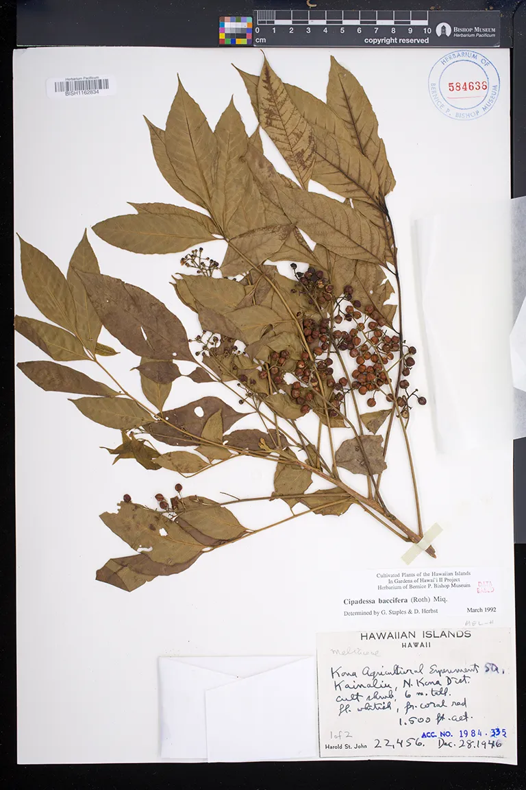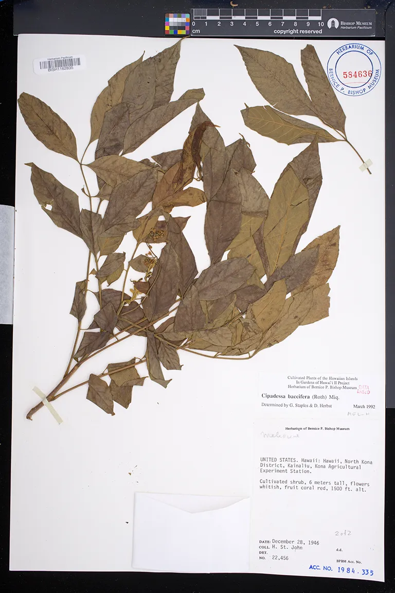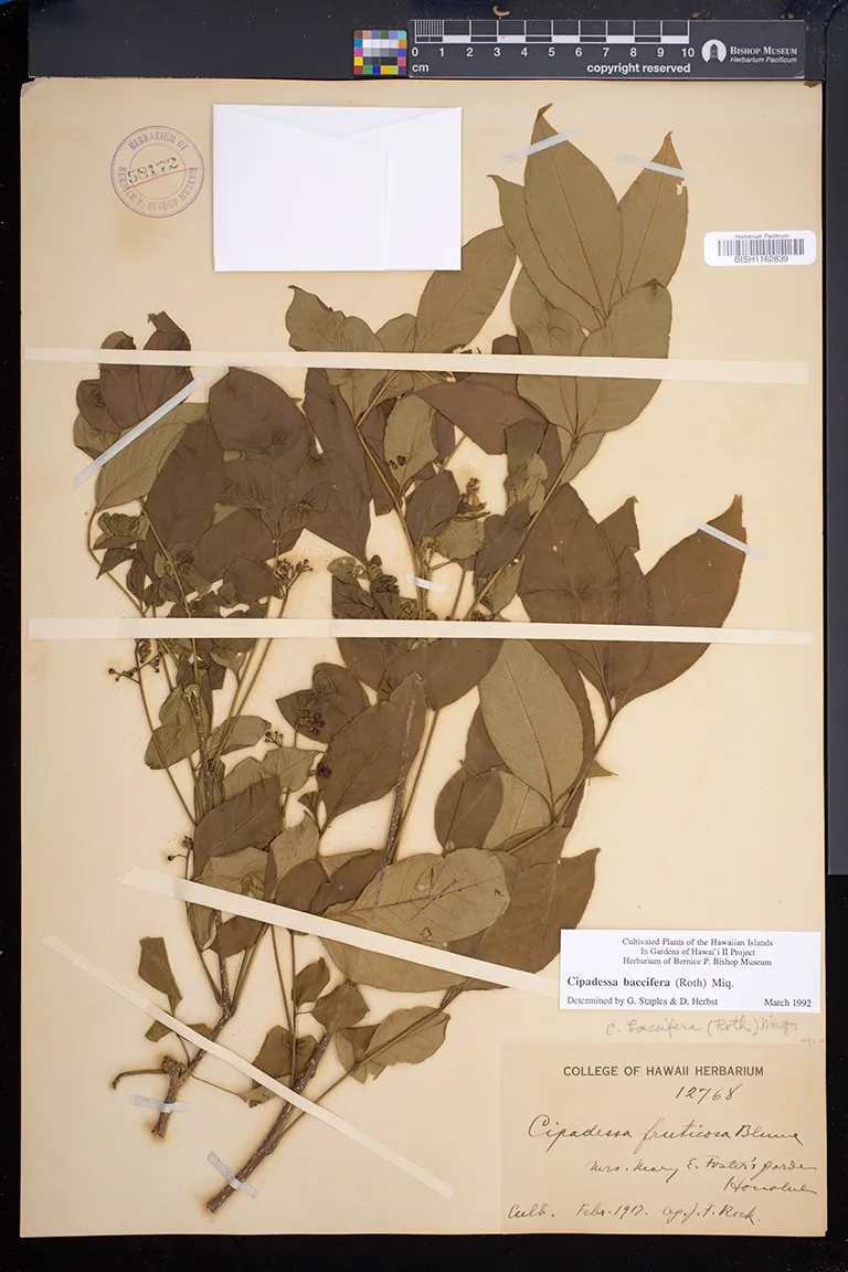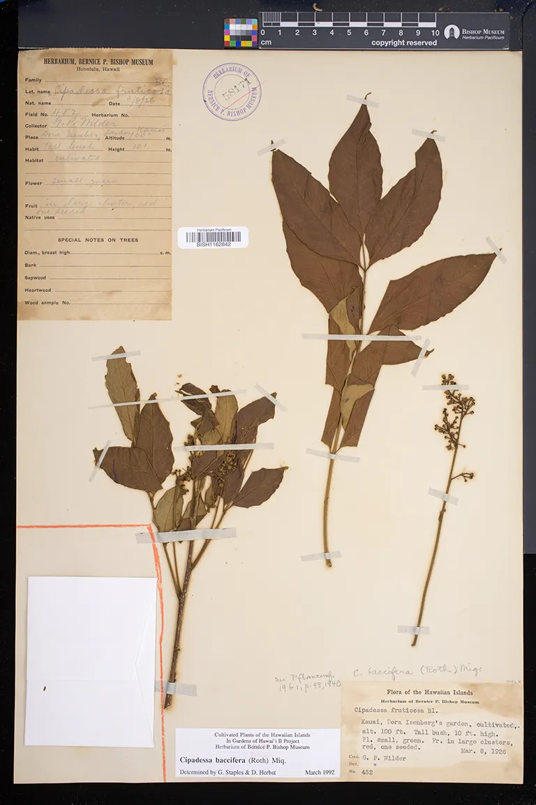 | 9 | Cipadessa baccifera | (Roxb. ex Roth) Miq. | Isenberg | garden | PRESERVED_SPECIMEN | Wilder, G.P. | s.n. | Kauai | BISH | 3/8/1926 |