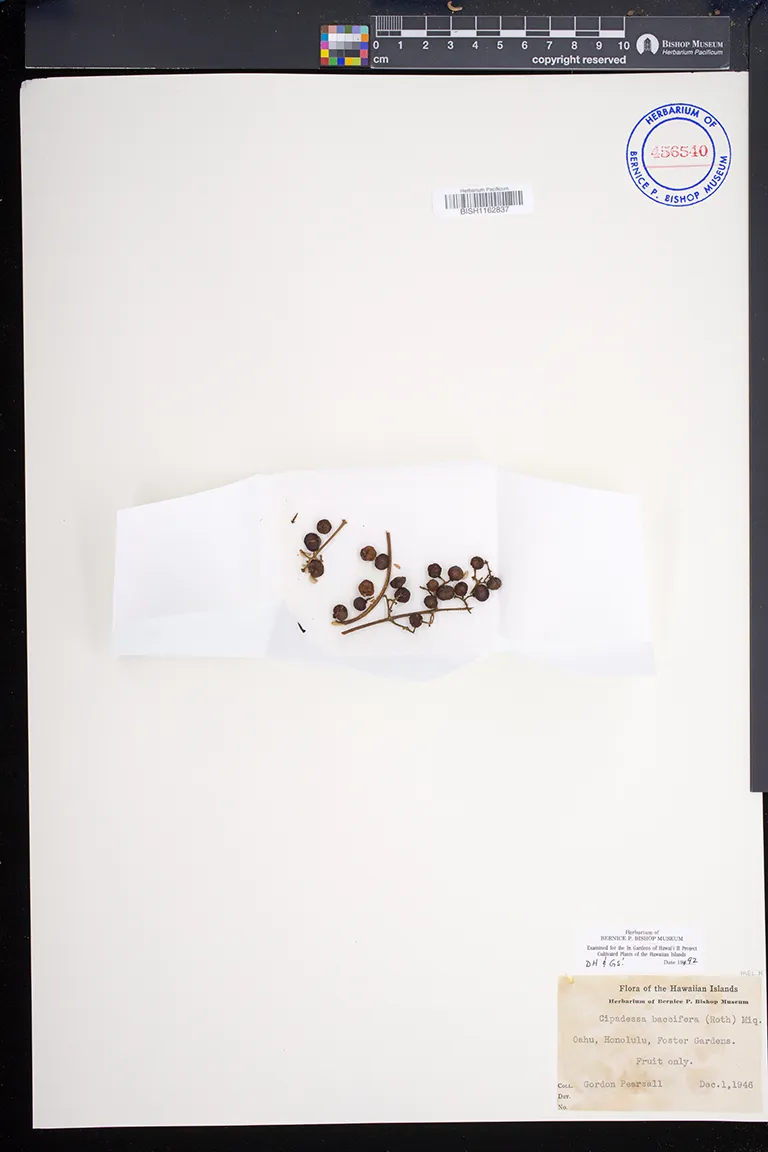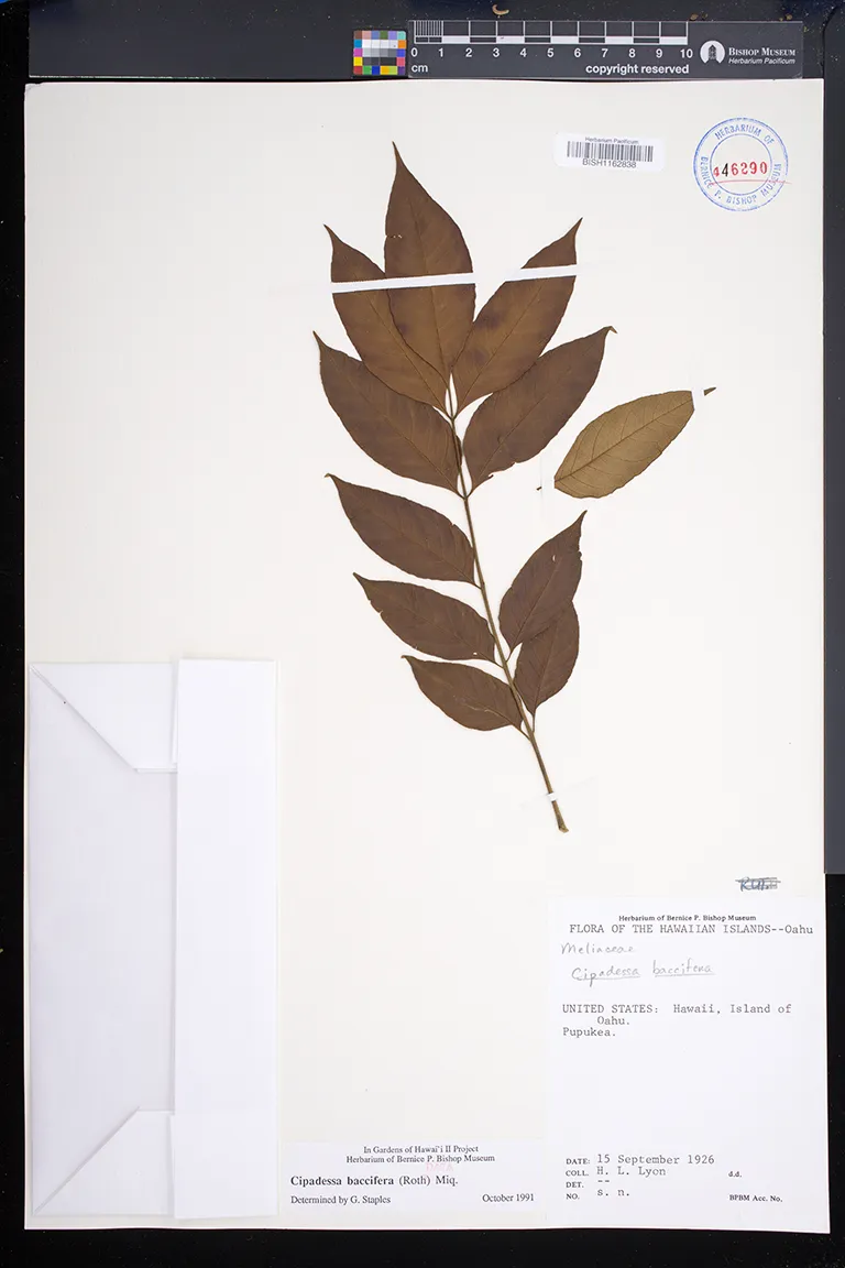 | 10 | Cipadessa baccifera | (Roxb. ex Roth) Miq. | Foster Garden | PRESERVED_SPECIMEN | Pearsall, G.A. | s.n. | Oahu | BISH | 7/1/1949 | |