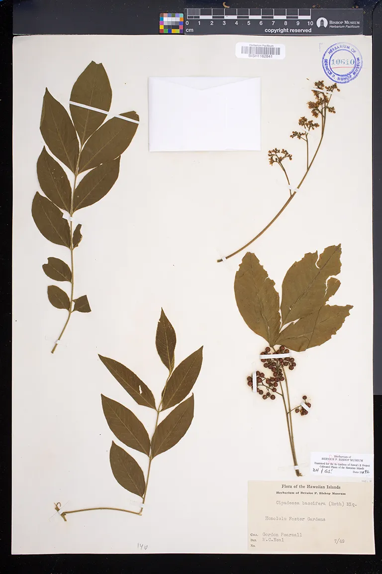 | 15 | Cipadessa baccifera | (Roxb. ex Roth) Miq. | foster garden | PRESERVED_SPECIMEN | pearsall, g.a. | Oahu | BISH | 7/1/1949 | ||