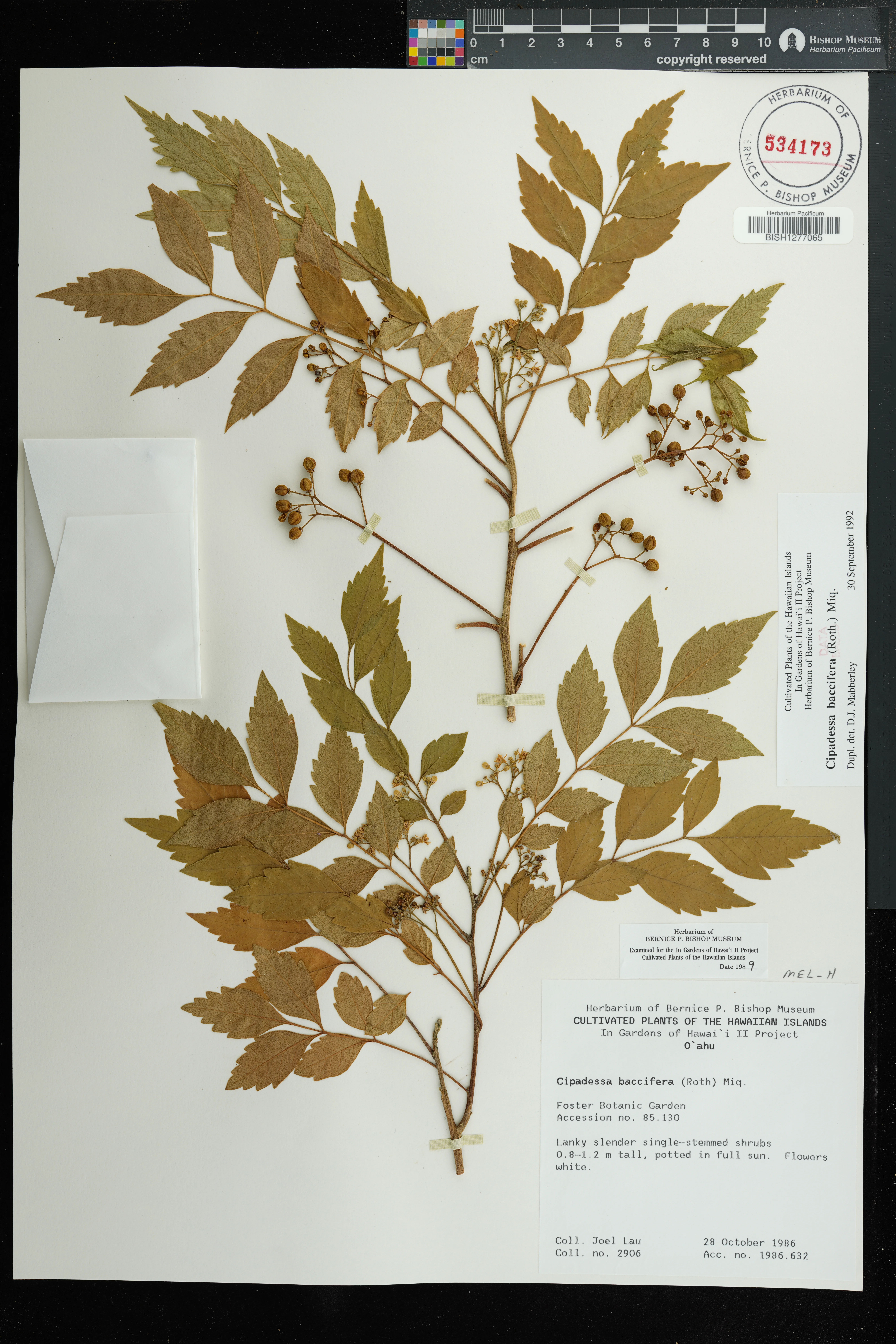 | 8 | Cipadessa baccifera | (Roxb. ex Roth) Miq. | Foster Garden | potted in full sun | PRESERVED_SPECIMEN | Lau, J. | 2906 | Oahu | BISH | 10/28/1986 |