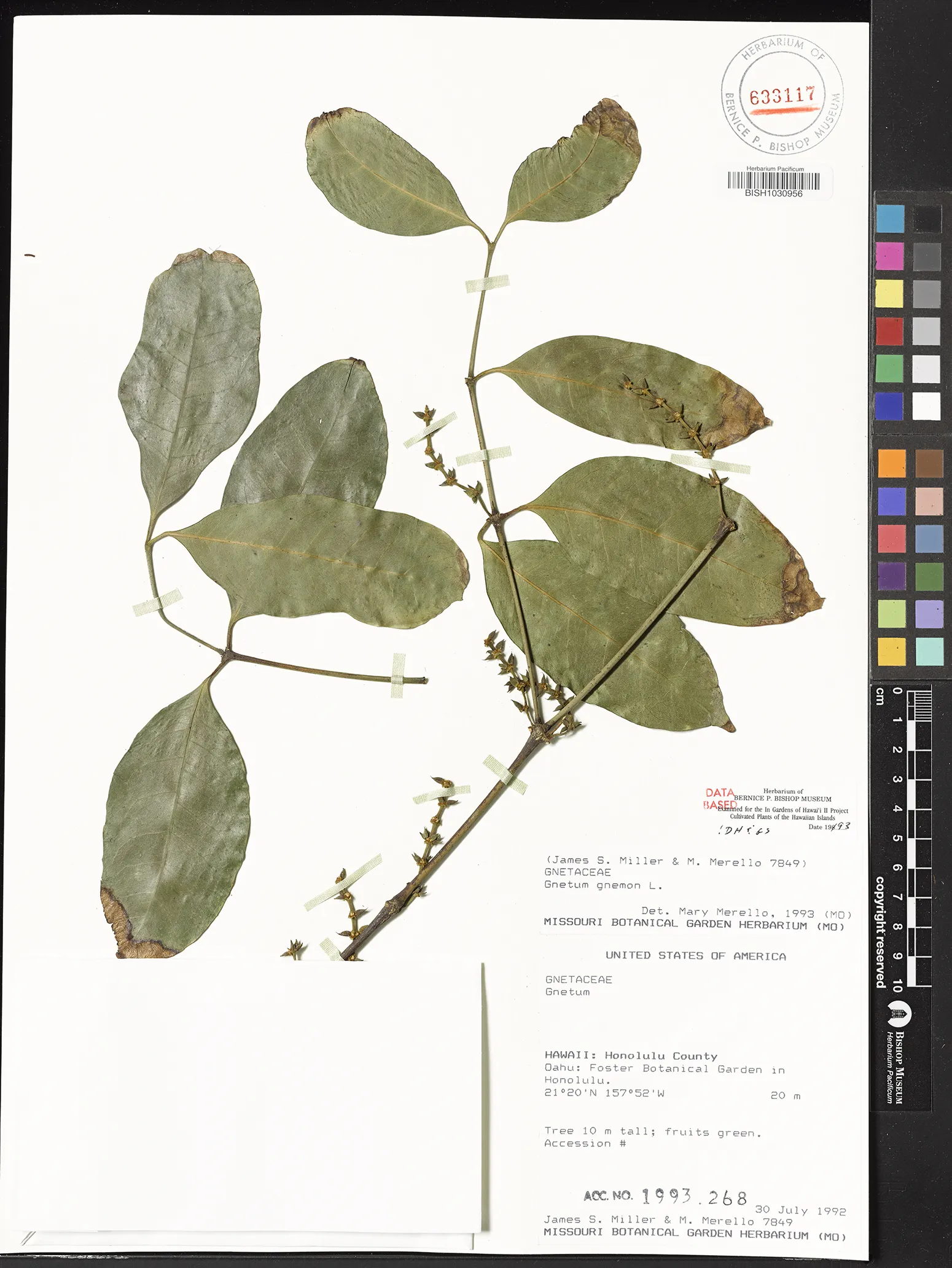 | 6 | Gnetum gnemon | L. | Honolulu: Foster Botanical Garden | PRESERVED_SPECIMEN | Miller, J.S. Merello, M. | Collector Number: 7849 | Oahu | BISH | 7/30/1992 | |