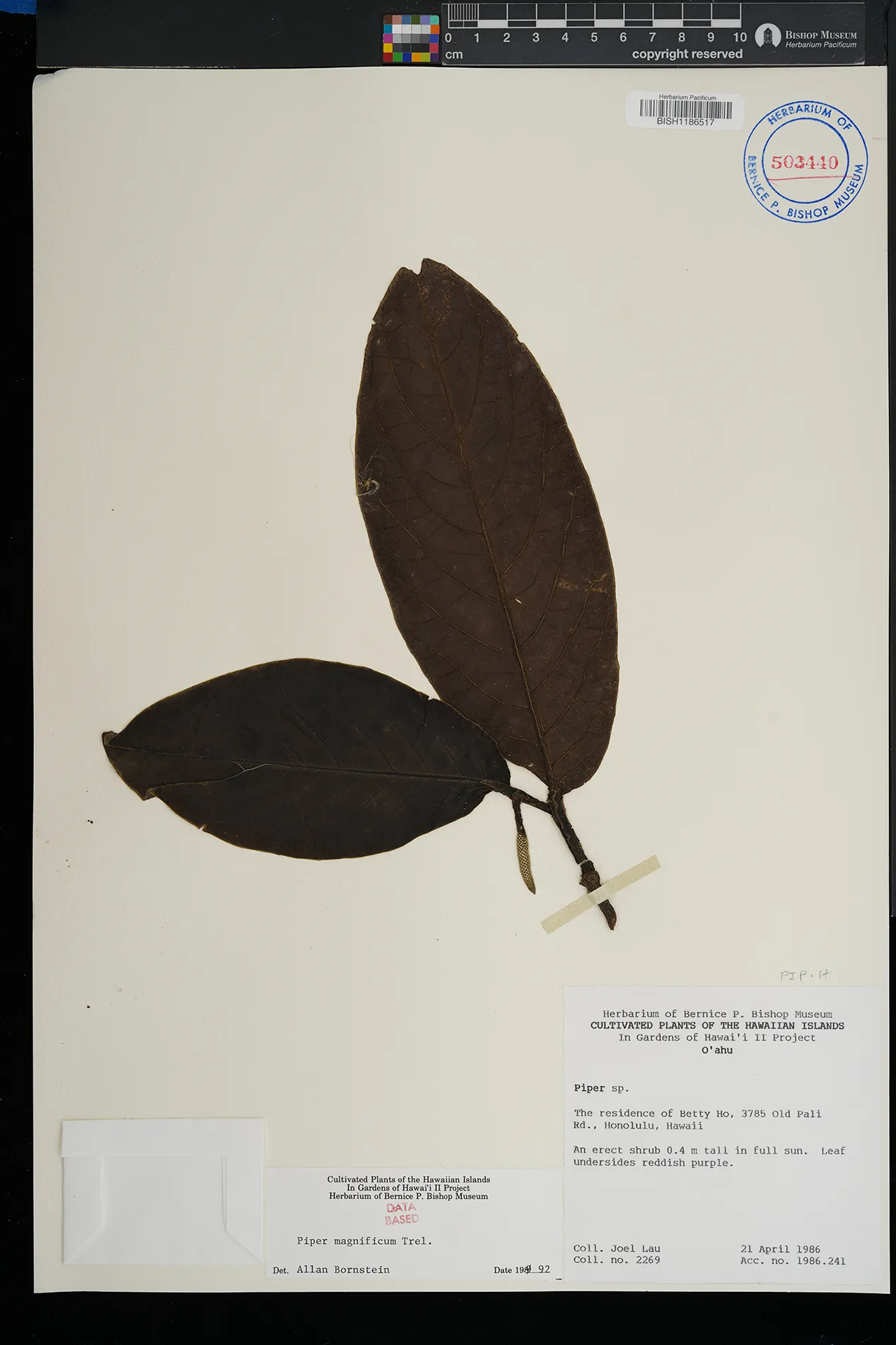 | 4 | Piper magnificum | Gentil ex Trel. | honolulu, 3785 old pali rd., residence of betty ho | full sun | PRESERVED_SPECIMEN | lau, j. | collector number: 2269 | Oahu | BISH | 4/21/1986 |