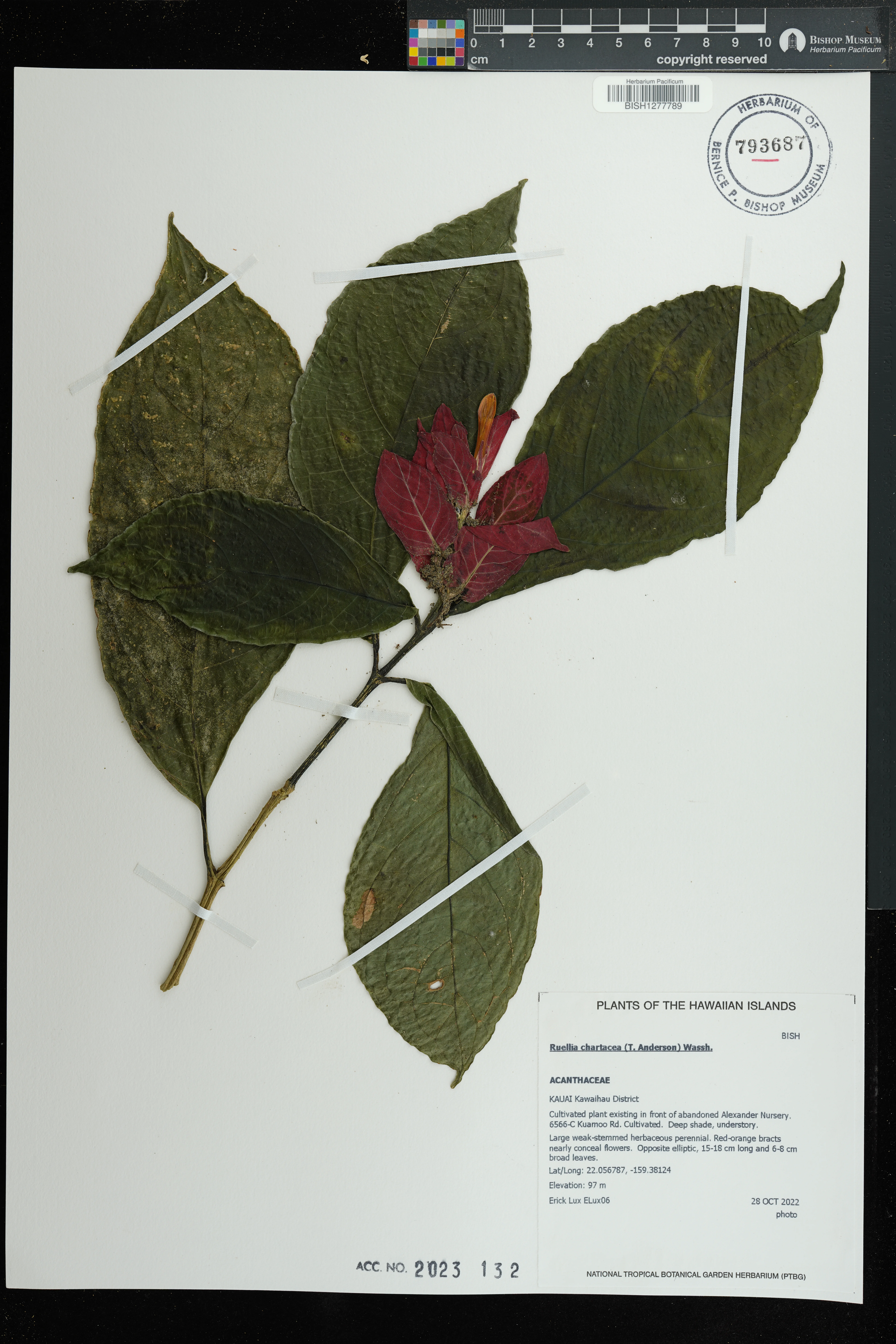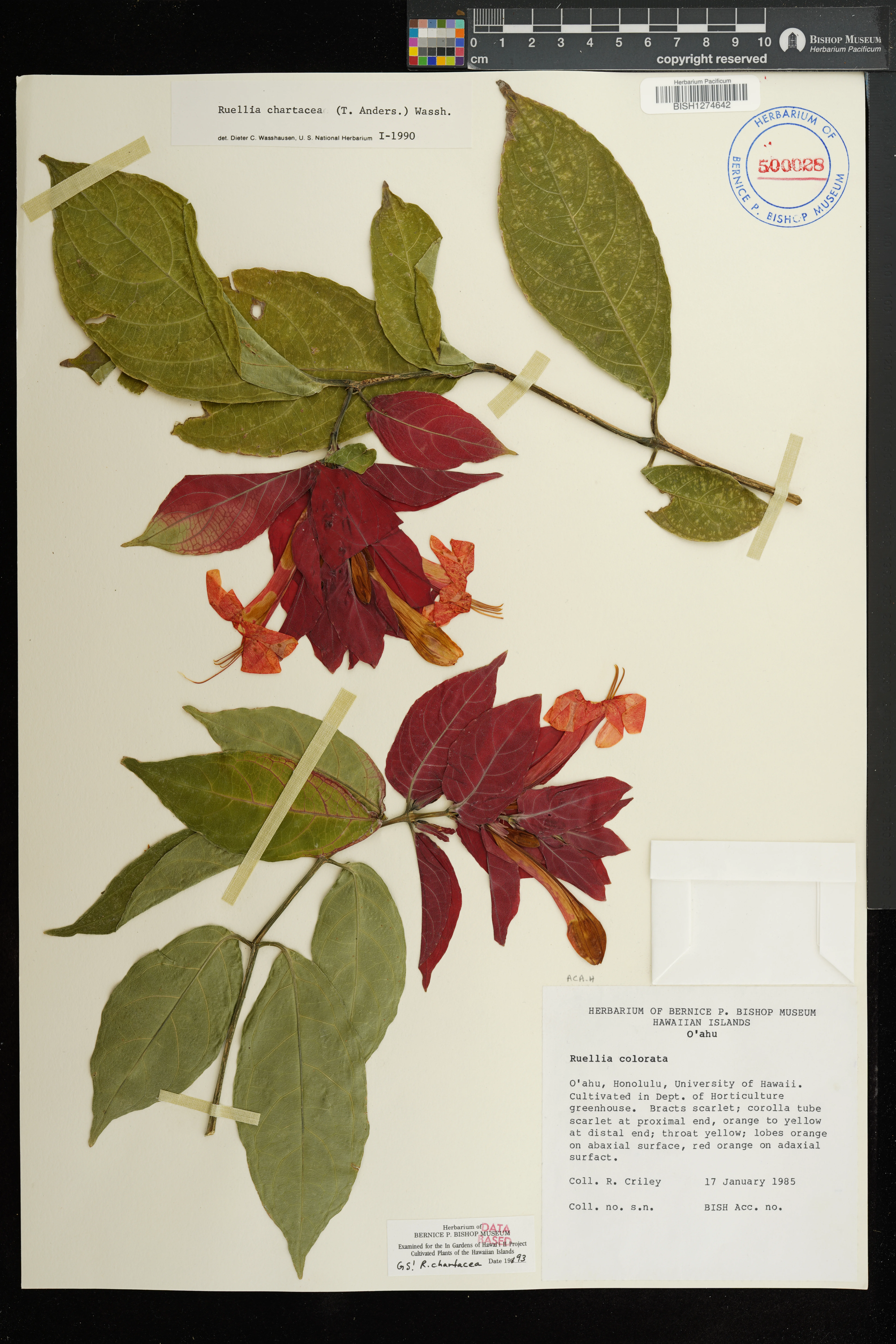 | 4 | Ruellia chartacea | (T.Anderson) Wassh. | honolulu, university of hawaii | PRESERVED_SPECIMEN | r. criley | s.n. | GB | 1/17/1985 | ||