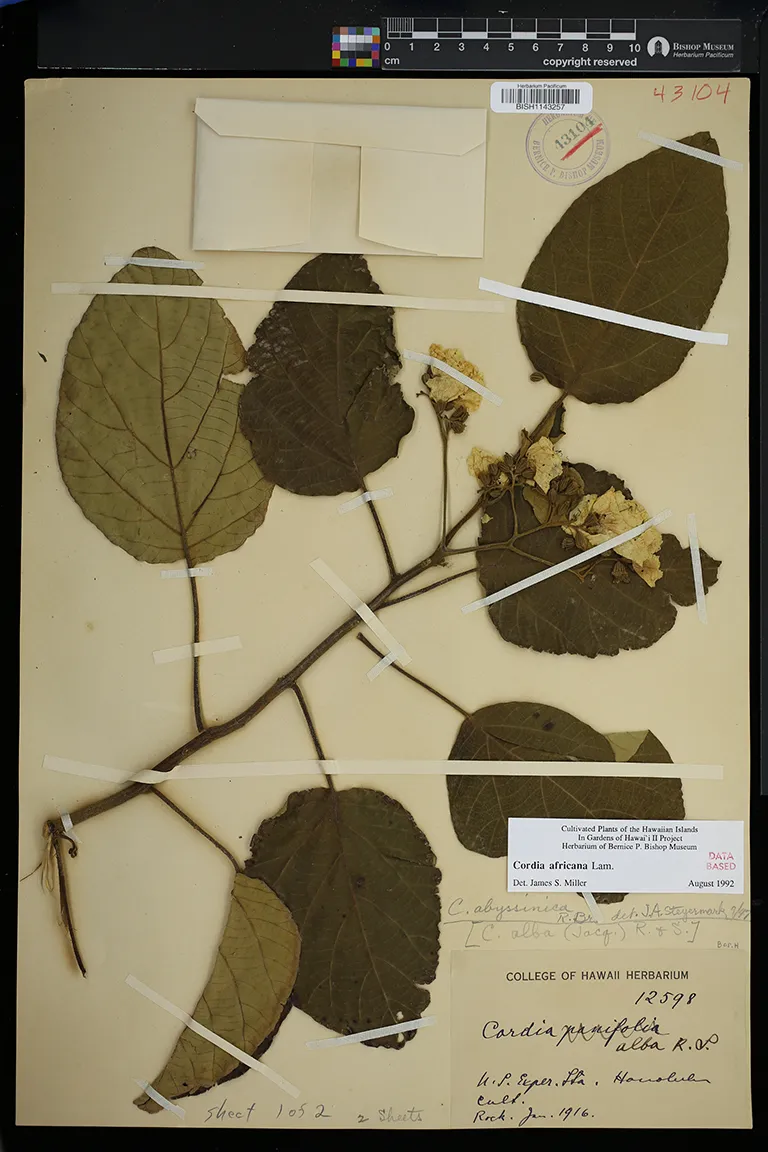 | 14 | Cordia africana | Lam. | honolulu, u.s. experiment station, h.s.p.a | PRESERVED_SPECIMEN | rock, j.f.c. | collector number: 12598 | Hawaii | BISH | 1/8/1916 | |