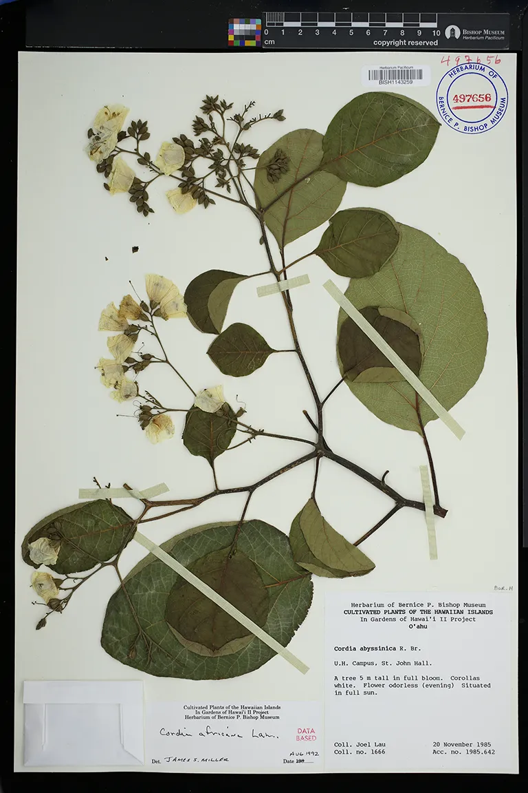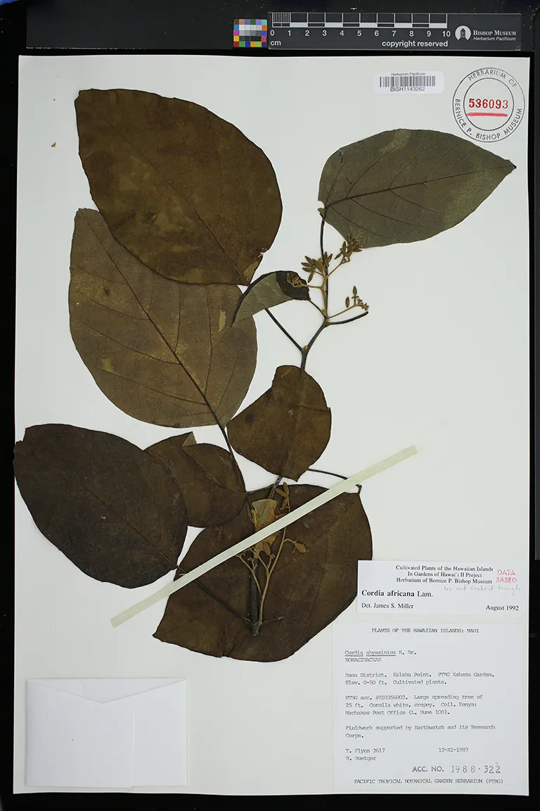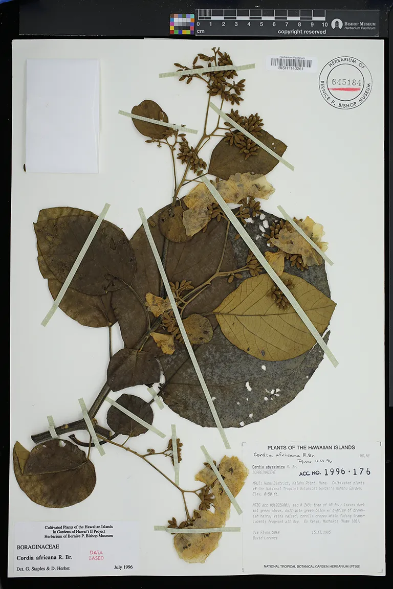| 7 | Cordia africana | Lam. | Kalahu Point, National Tropical Botanical Garden's Kahanu Garden. Elev. 0-50 ft. Cultivated plants. | PRESERVED_SPECIMEN | Tim Flynn | 2617 | Maui | PTBG | 11/12/1987 | |