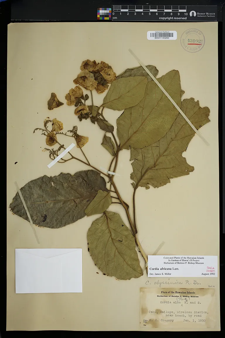 | 15 | Cordia africana | Lam. | Wailupe, Wireless Station, near beach, by road | PRESERVED_SPECIMEN | Gregory, H.E. | s.n. | Oahu | BISH | 1/1/1930 | |