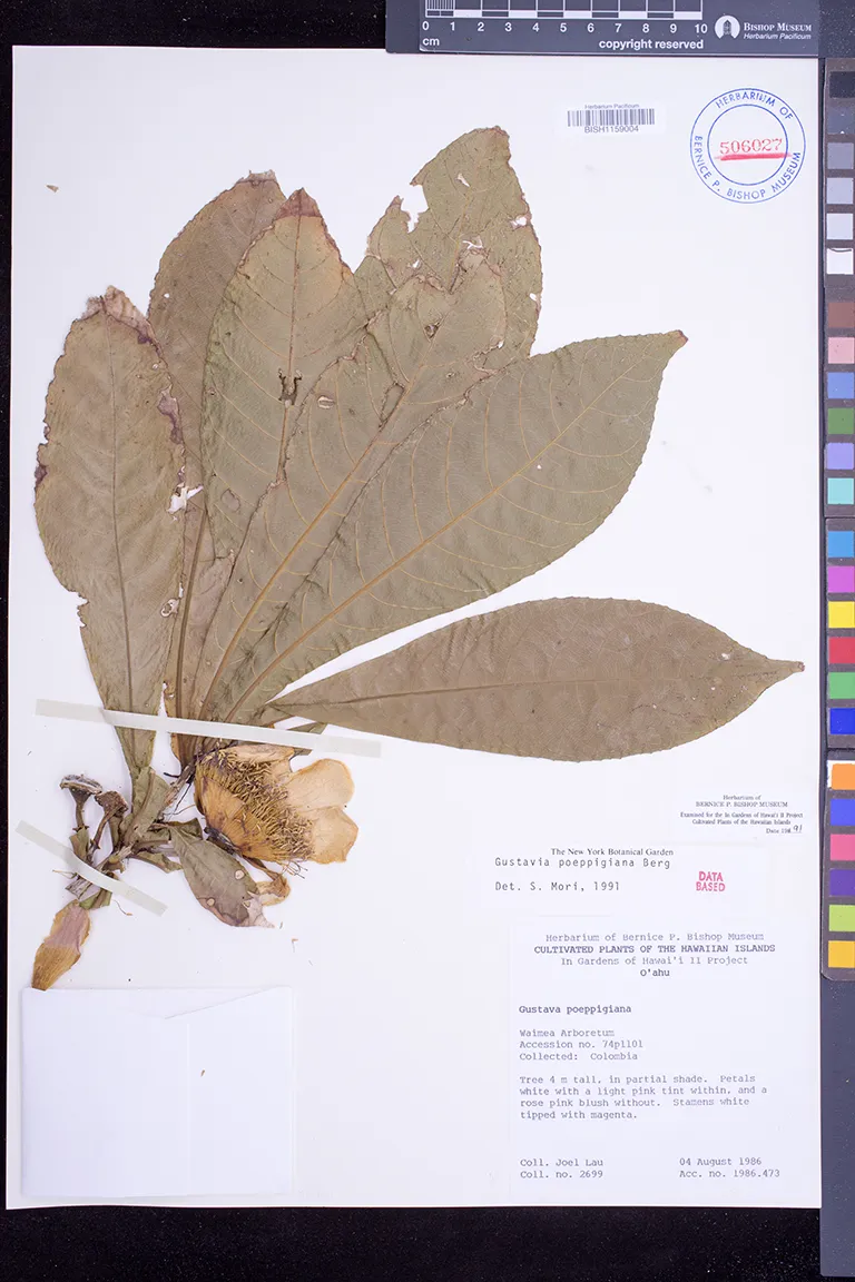 | 5 | Gustavia poeppigiana | O.Berg | Waimea Arboretum | PRESERVED_SPECIMEN | Lau, J. | 2699 | Oahu | BISH | 8/4/1986 | |