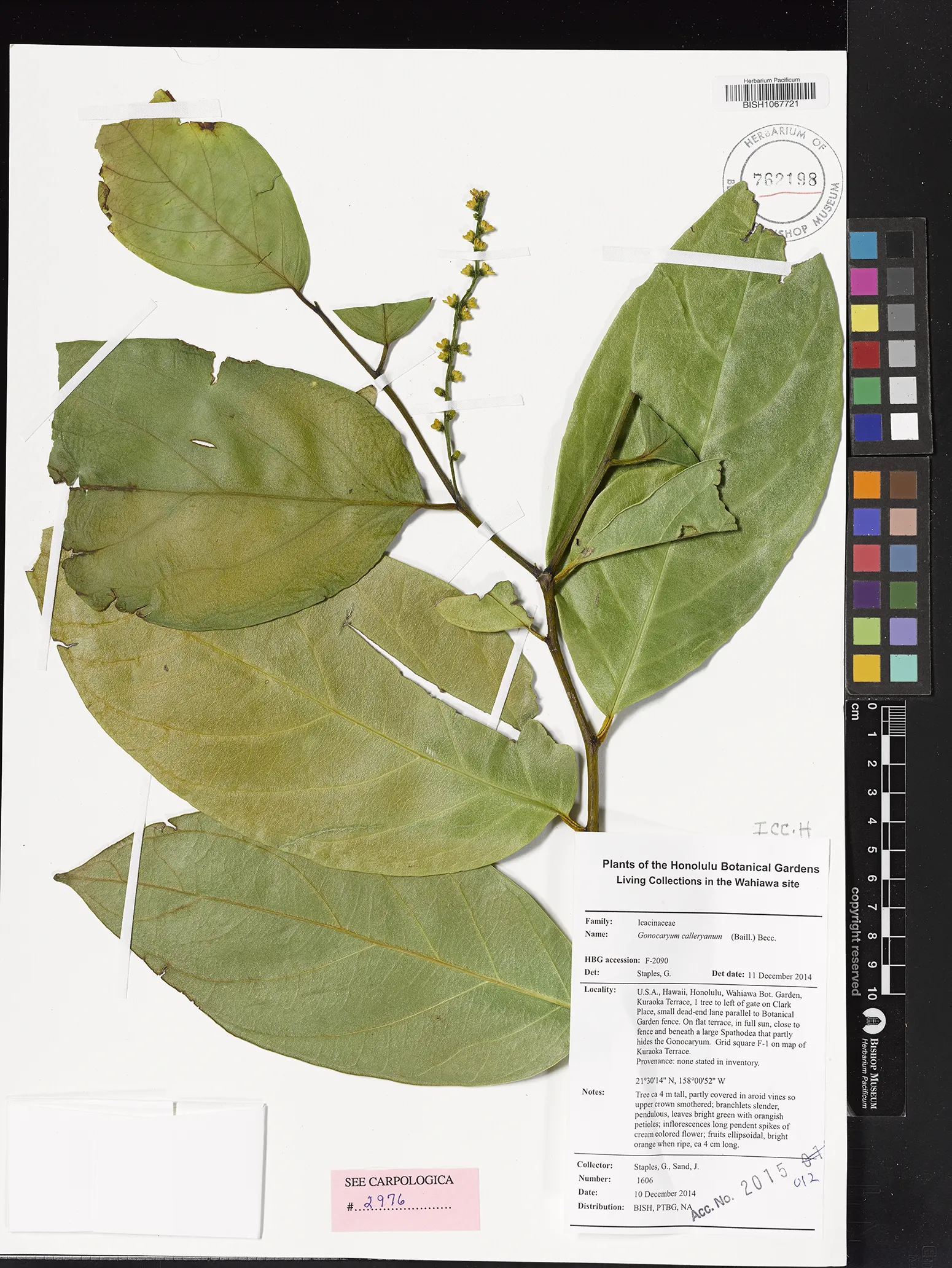 Wahiawa Bot. Gaarden, Kuraoka Terrace, 1 tree to left of gate on Clark Place, small dead-end lane parallel to Botanical Garden fence. On flat terrace, in full sun, close to fence and beneath a large Spathodea that partly hides the Gonocaryum. Grid square F-1 on map of Kuraoka Terrace.\nProvenance: none stated in inventory. |