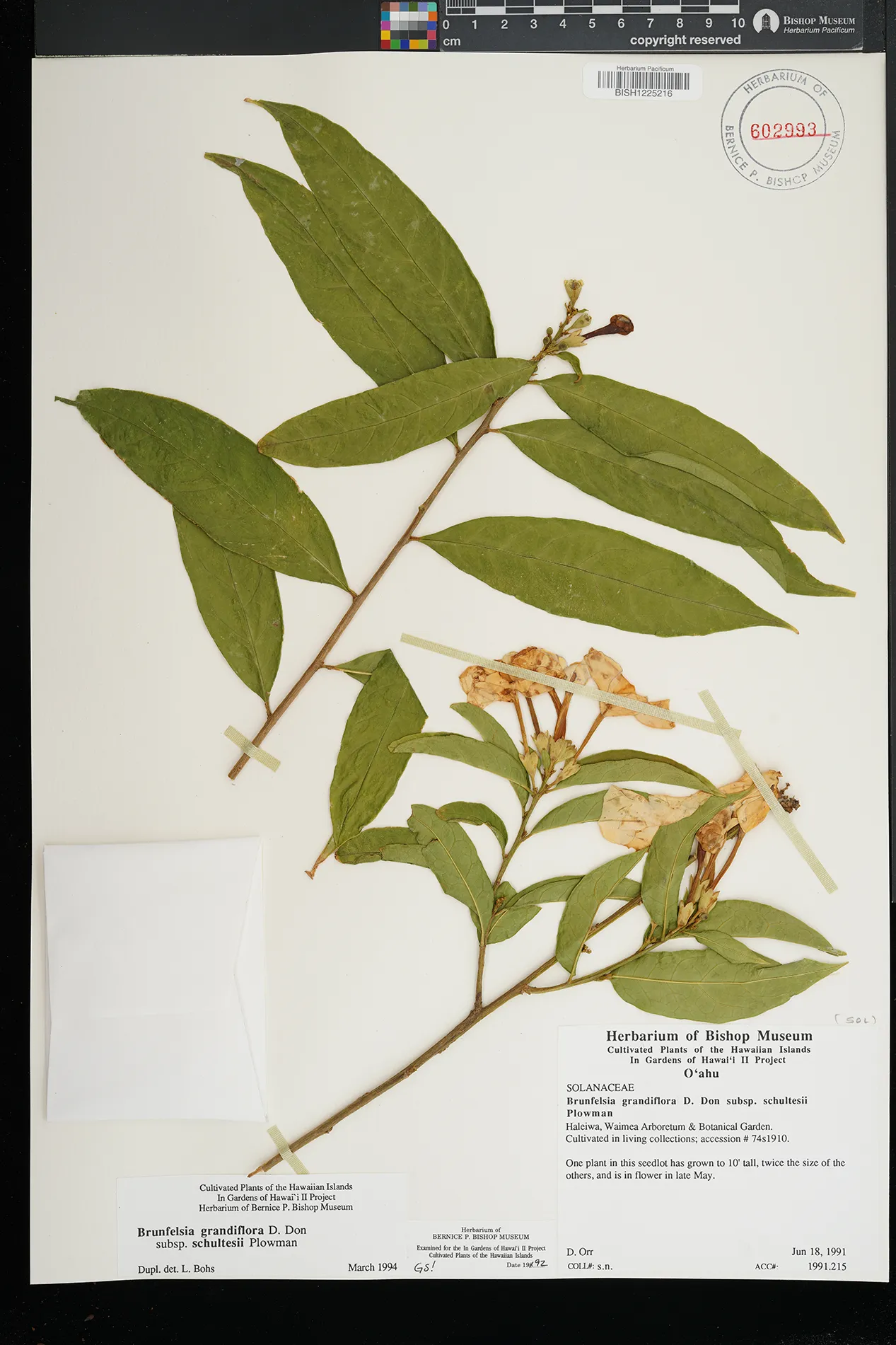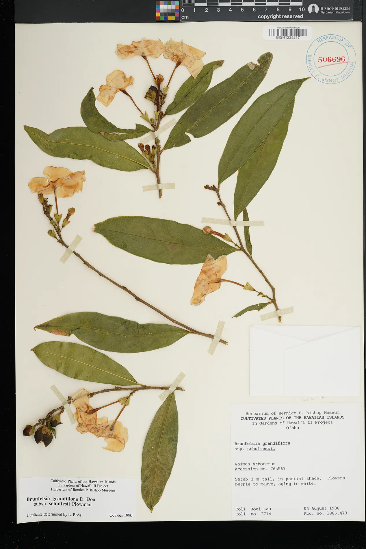 | 3 | Brunfelsia grandiflora subsp. schultesii | Plowman | Waimea Arboretum | partial shade | PRESERVED_SPECIMEN | Lau, J. | 2714 | Oahu | BISH | 8/4/1986 |