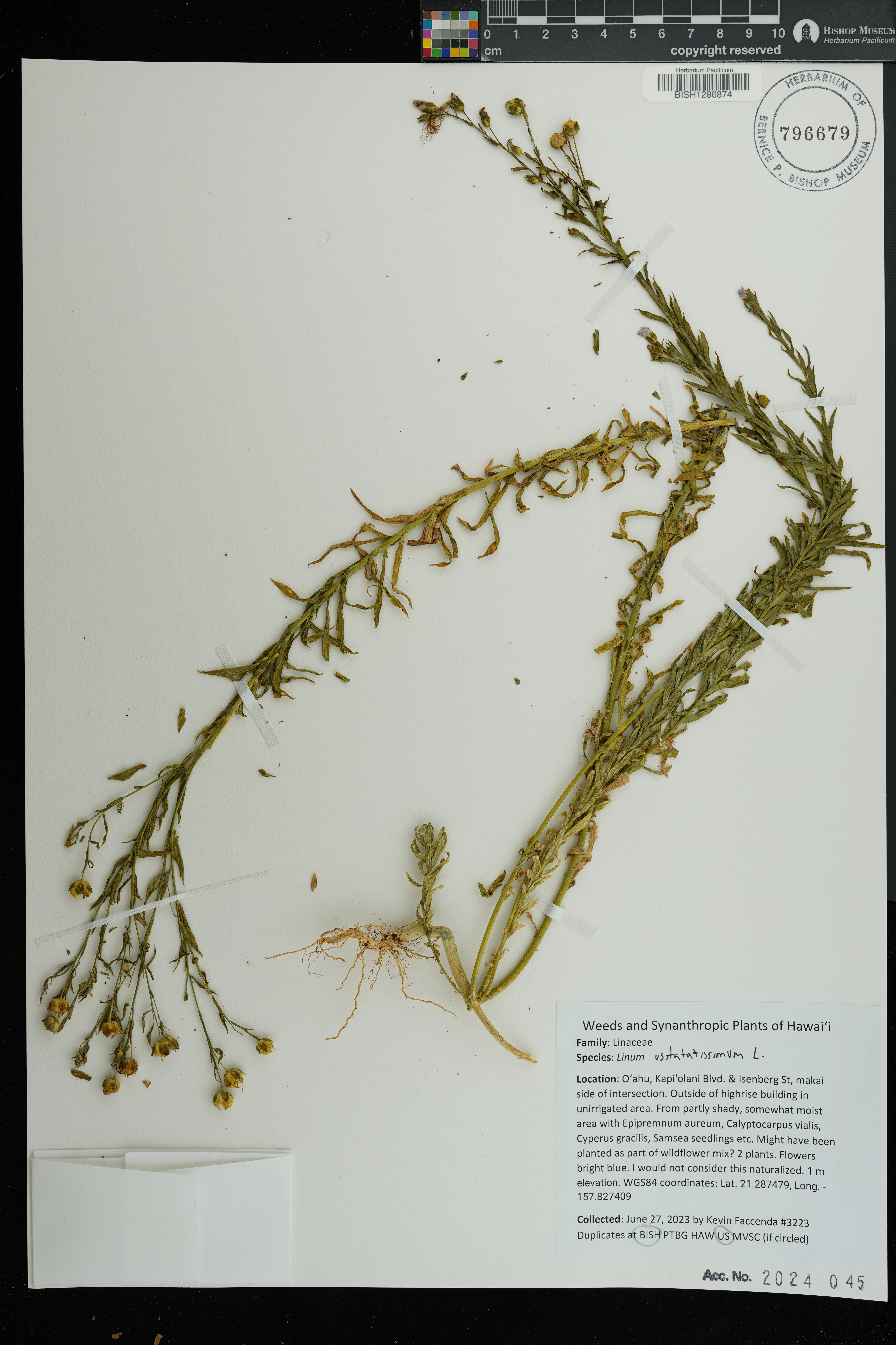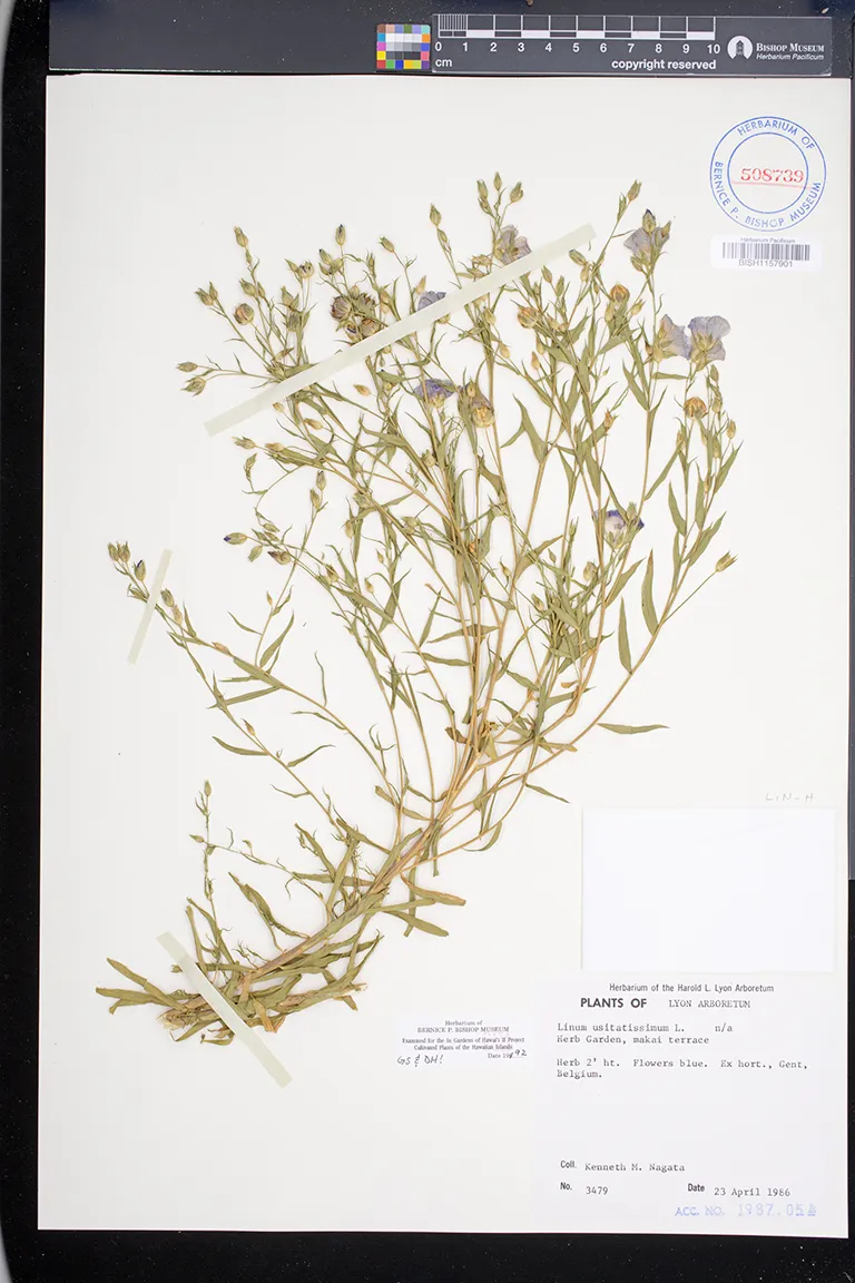 | 3 | Linum usitatissimum | L. | lyon arboretum, herb garden, makai terrace | PRESERVED_SPECIMEN | nagata, k.m. | collector number: 3479 | Oahu | BISH | 4/23/1986 | |