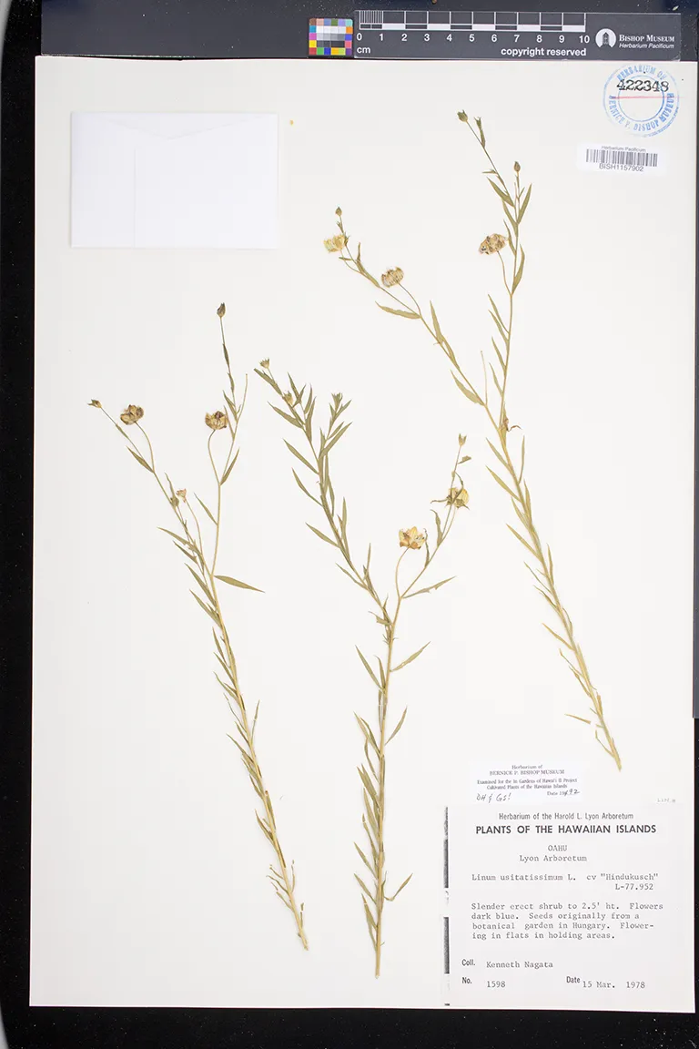 | 6 | Linum usitatissimum | L. | lyon arboretum | flats in holding areas | PRESERVED_SPECIMEN | nagata, k.m. | collector number: 1598 | Oahu | BISH | 3/15/1978 |