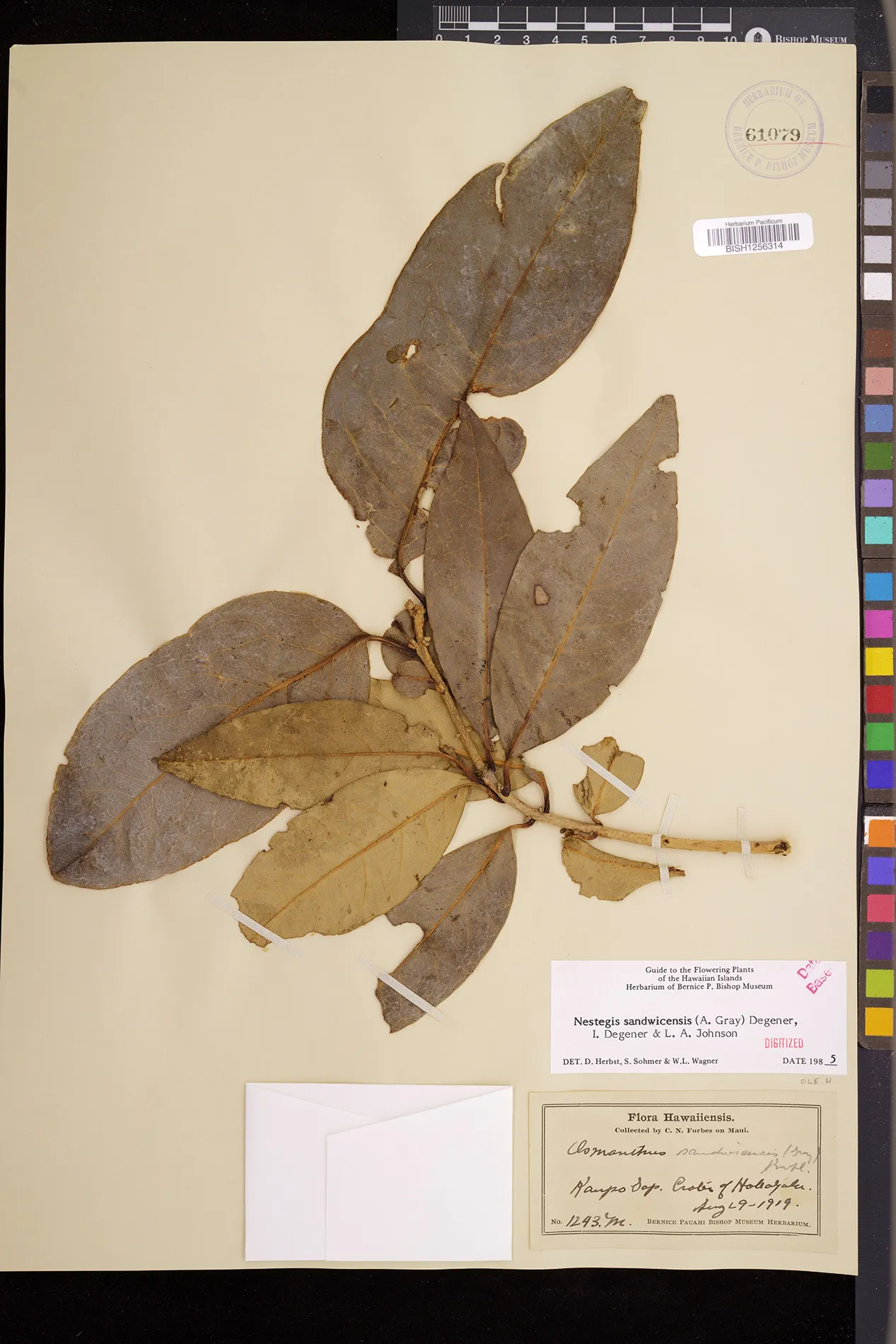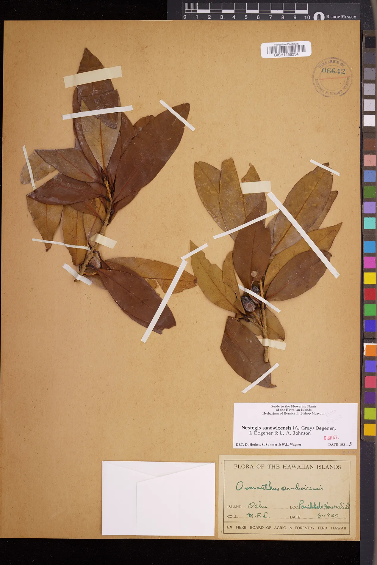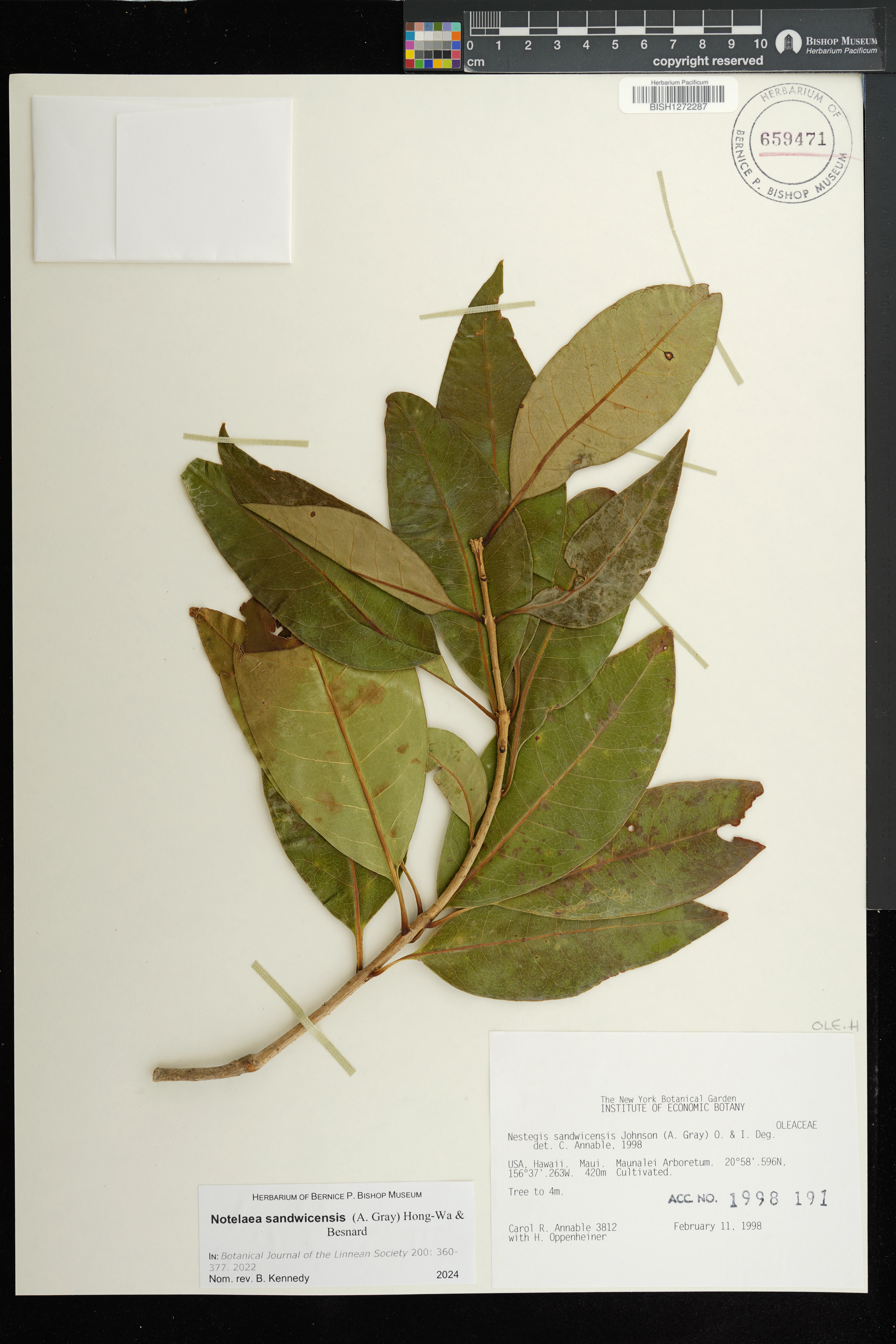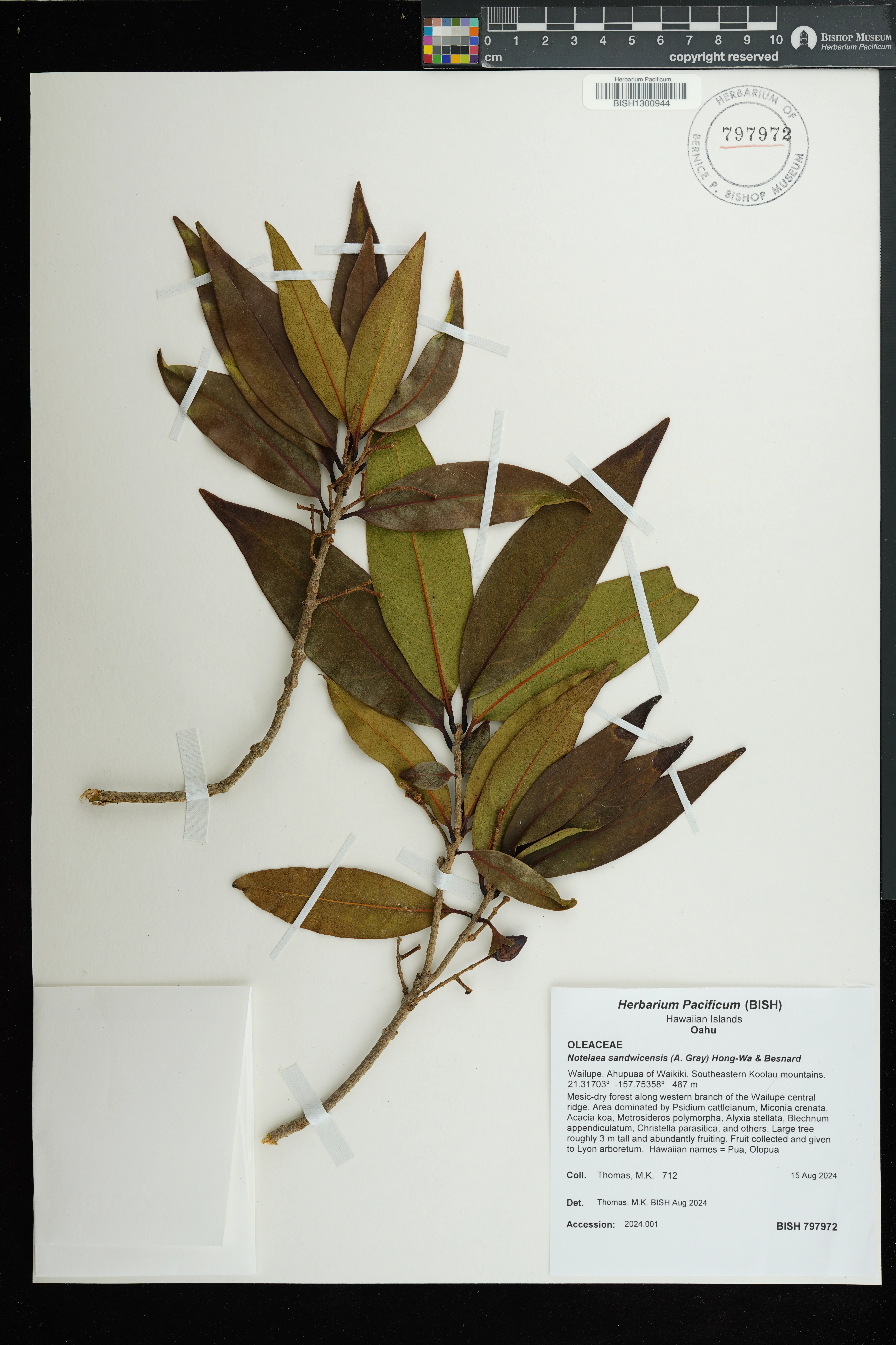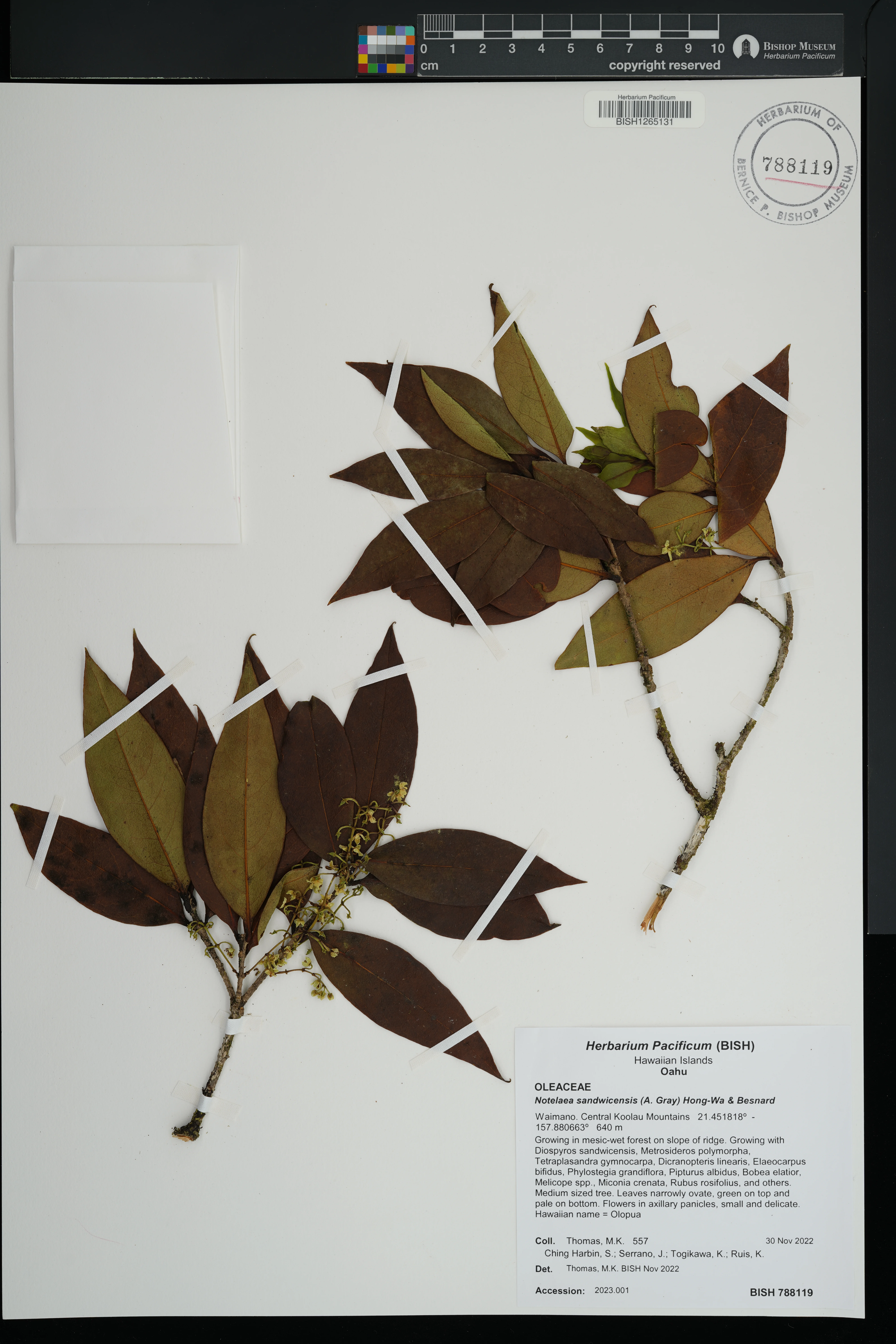 Wagner et al. 1990:992 (K, O, Mo, L, M, H [as Nestegis sandwicensis]); Dupin et al. 2022:16 (COMBNOV, Syn. Nestegis sandwicensis = Notelaea sandwicensis)