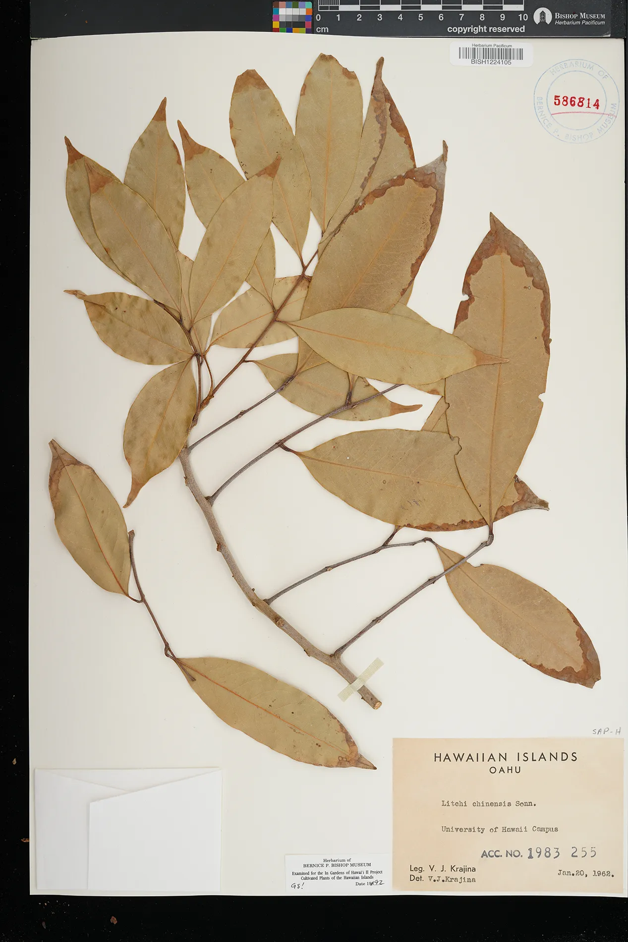 | 6 | Litchi chinensis | Sonn. | University of Hawaii campus | PRESERVED_SPECIMEN | Krajina, V.J. | s.n. | Oahu | BISH | 1/20/1962 | |