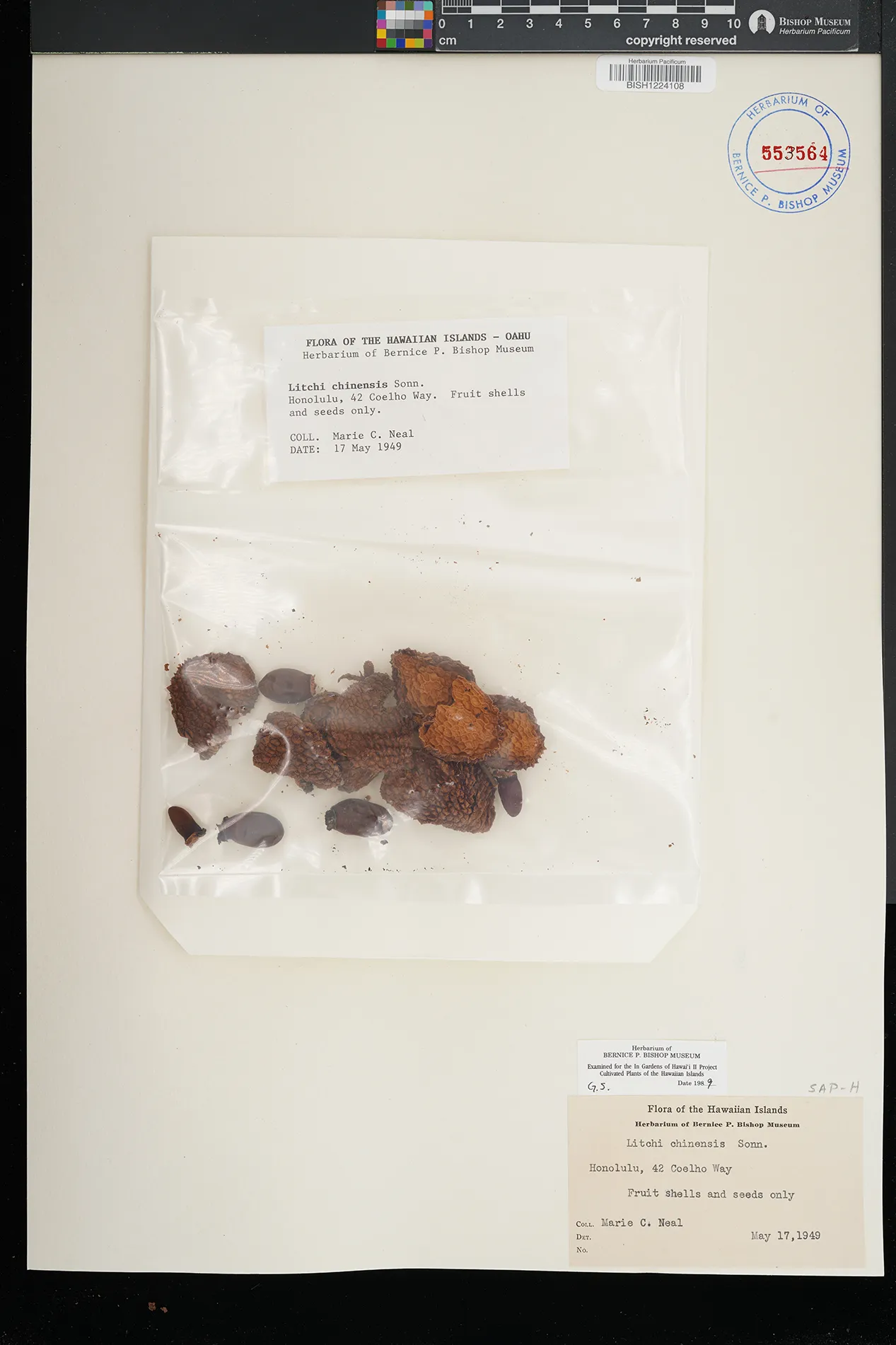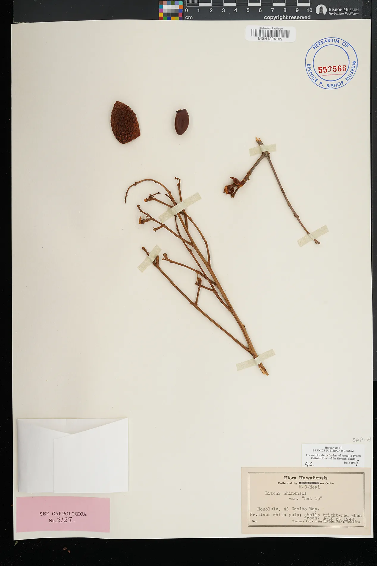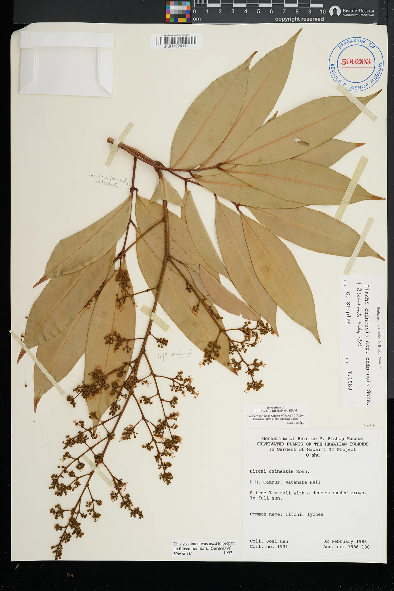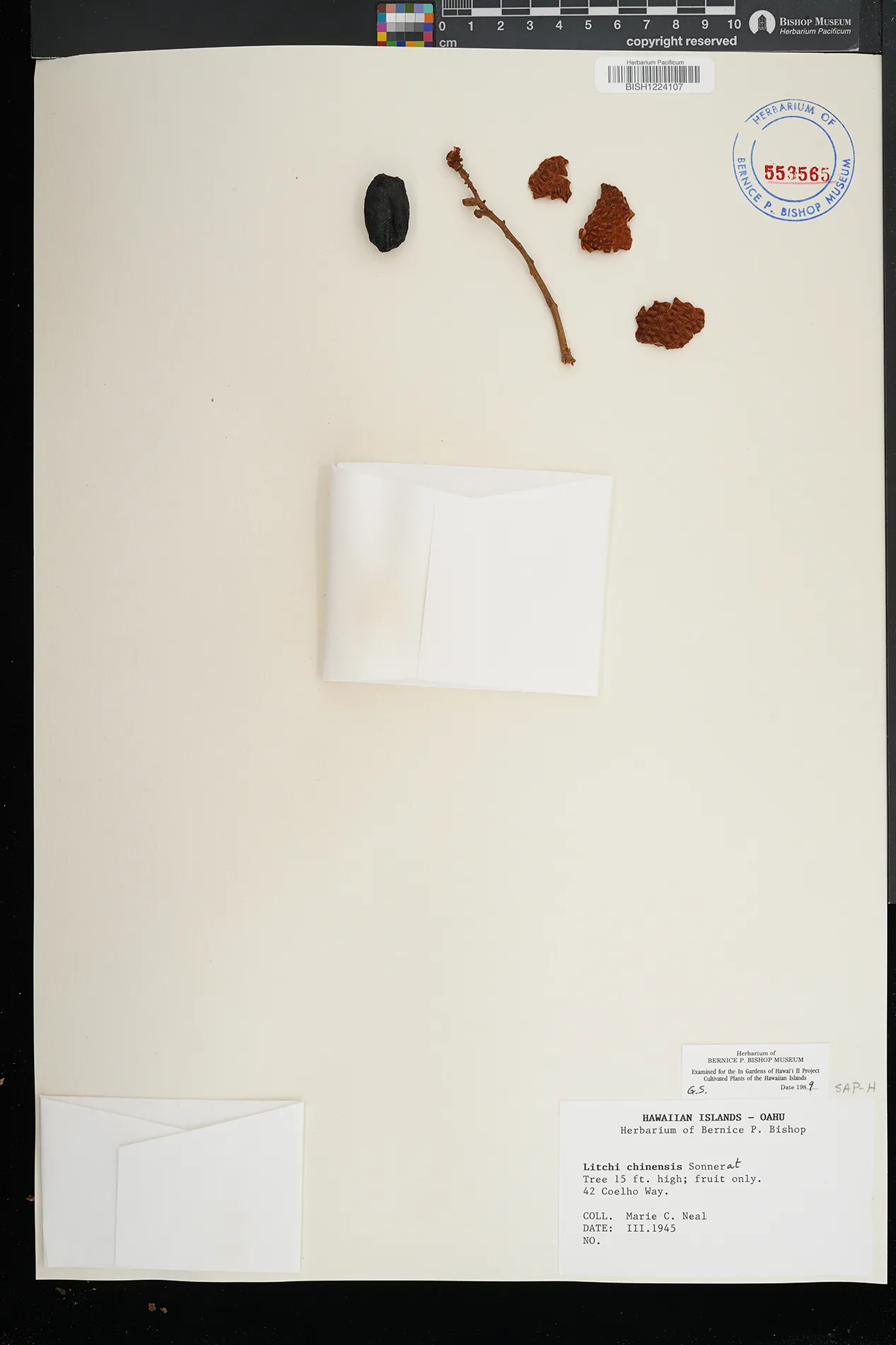 | 7 | Litchi chinensis | Sonn. | Honolulu, 42 Coelho Way. | PRESERVED_SPECIMEN | Neal, M.C. | s.n. | Oahu | BISH | 6/25/1946 | |