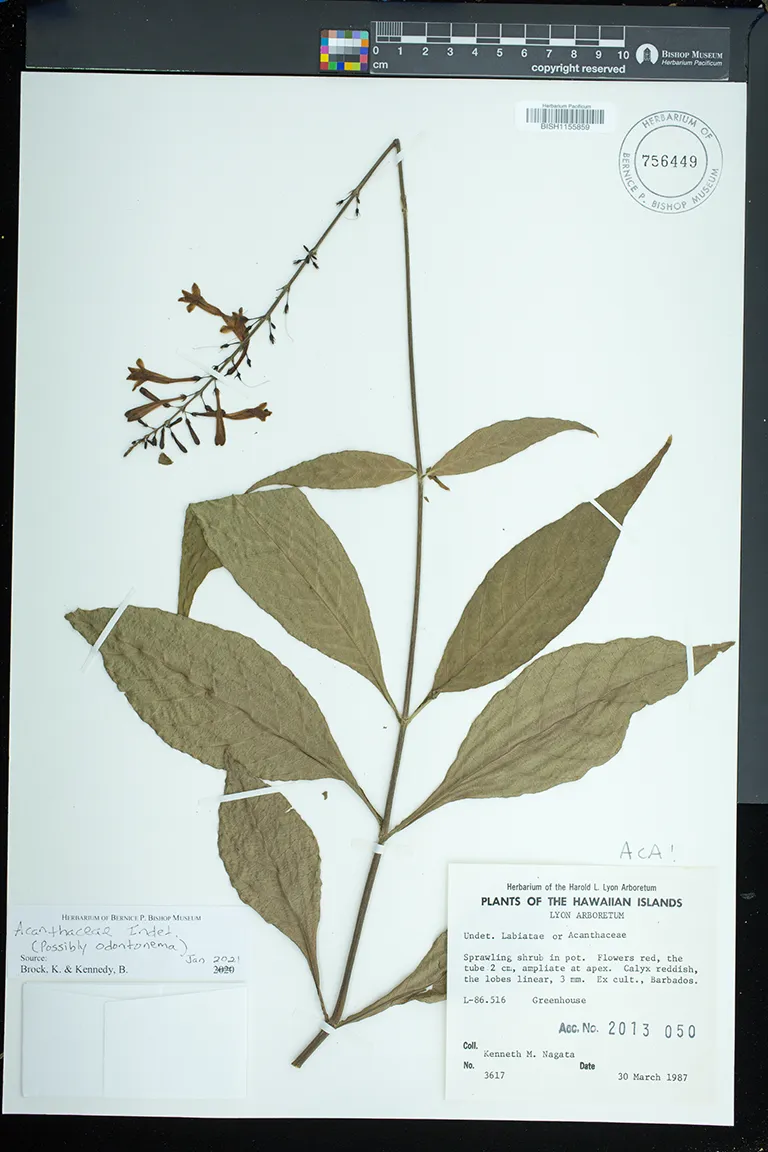 Kingdom: Viridiplantae Phylum: Magnoliophyta Class/Clade: Eudicot-Asterids Order: Lamiales Family: Acanthaceae Genus: Odontonema