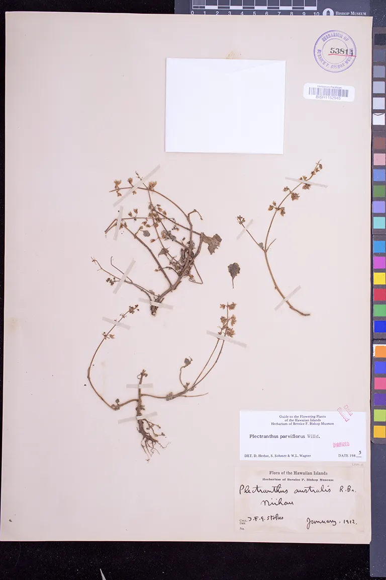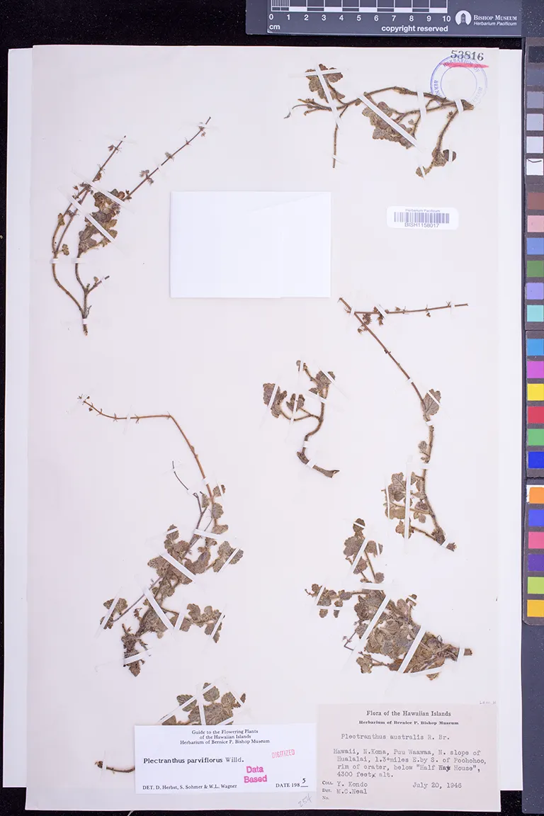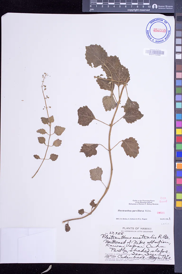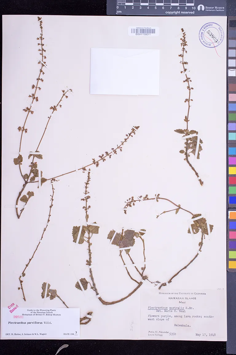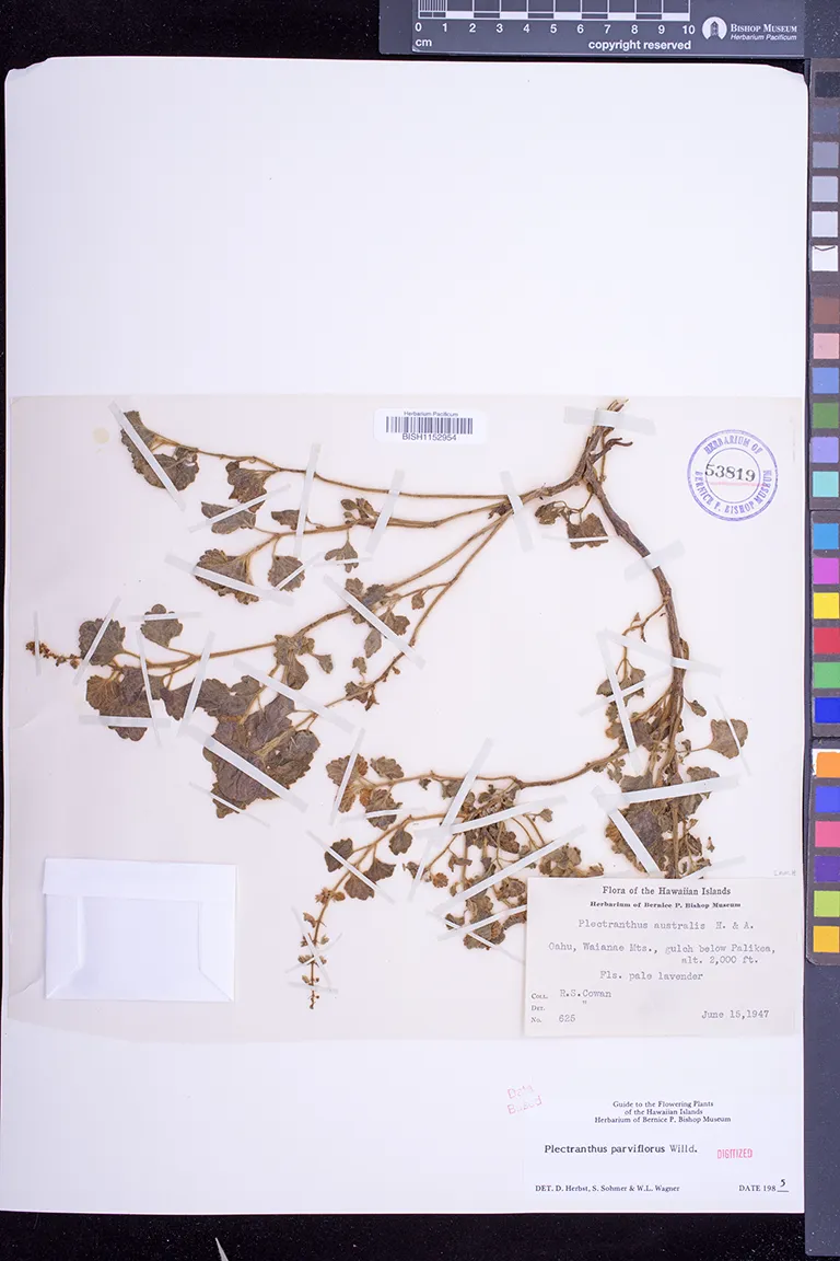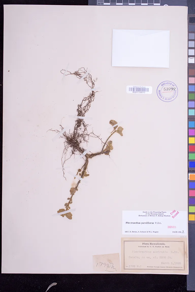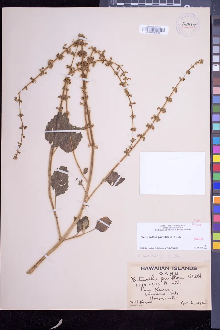 Wagner et al. 1990:827 (Ni, K, O, Mo, L, M, H [as Plectranthus parviflorus]); Paton et al. 2019:21 (Syn. P. parviflorus = C. australis)
