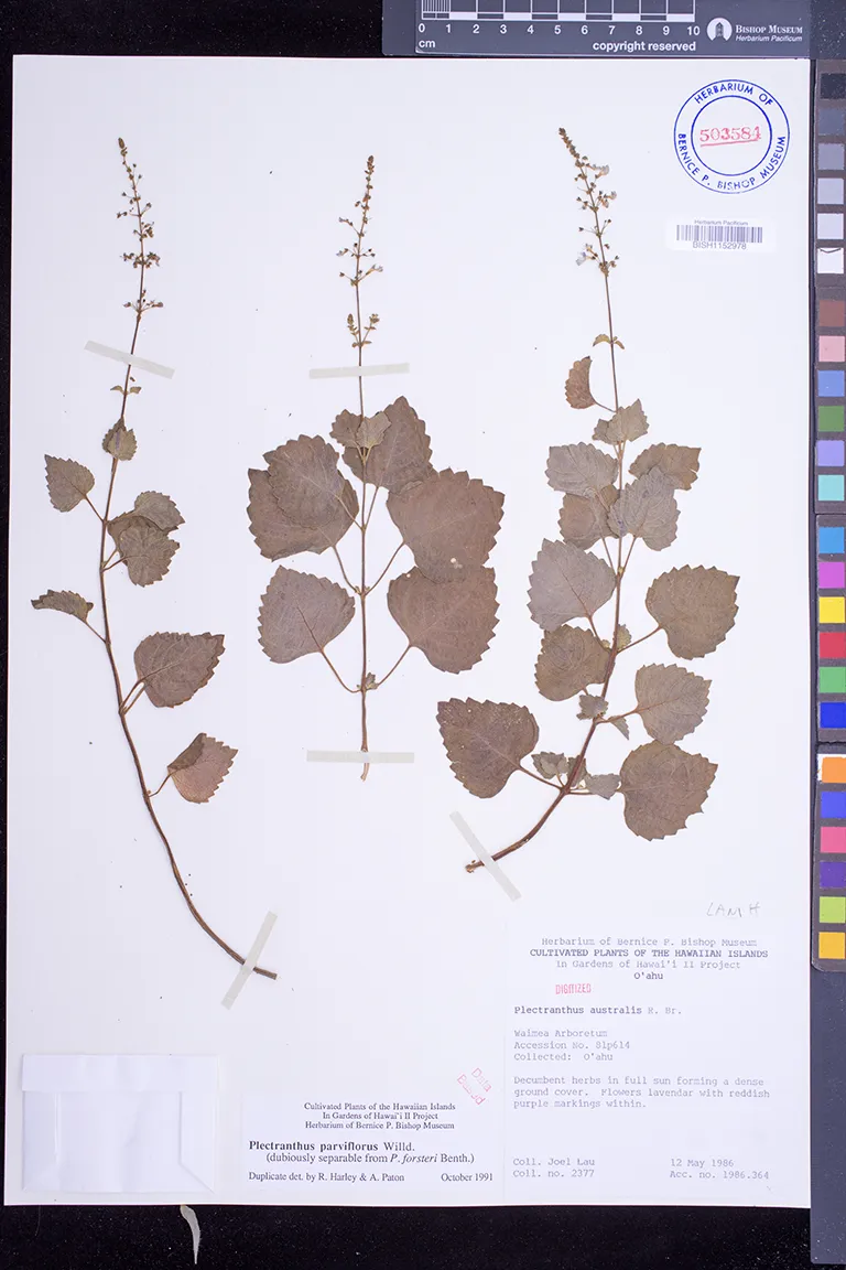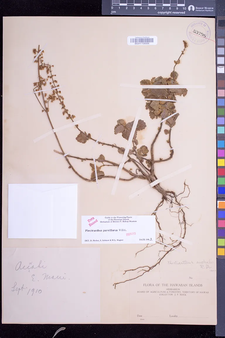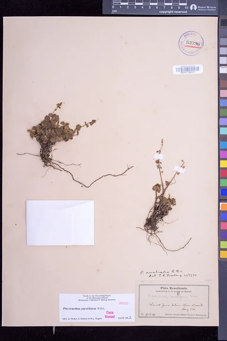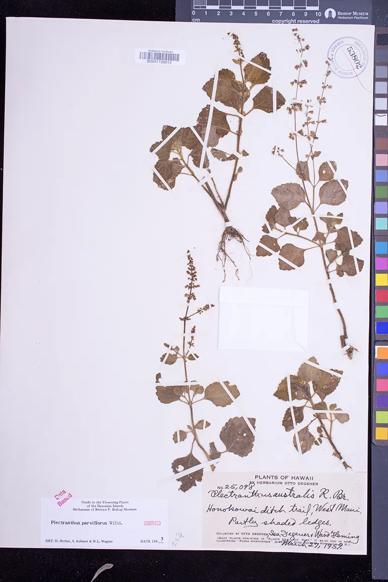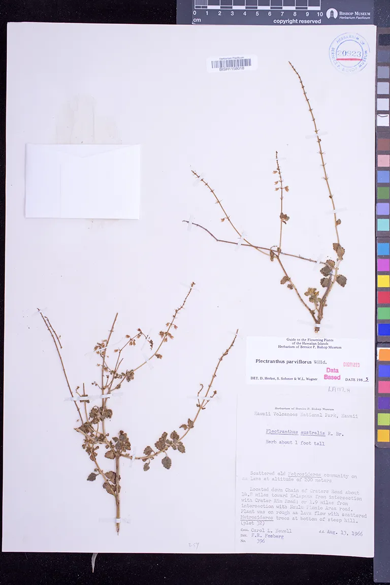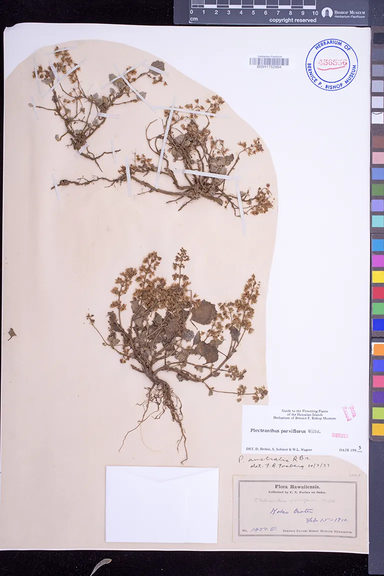 Wagner et al. 1990:827 (Ni, K, O, Mo, L, M, H [as Plectranthus parviflorus]); Paton et al. 2019:21 (Syn. P. parviflorus = C. australis)
