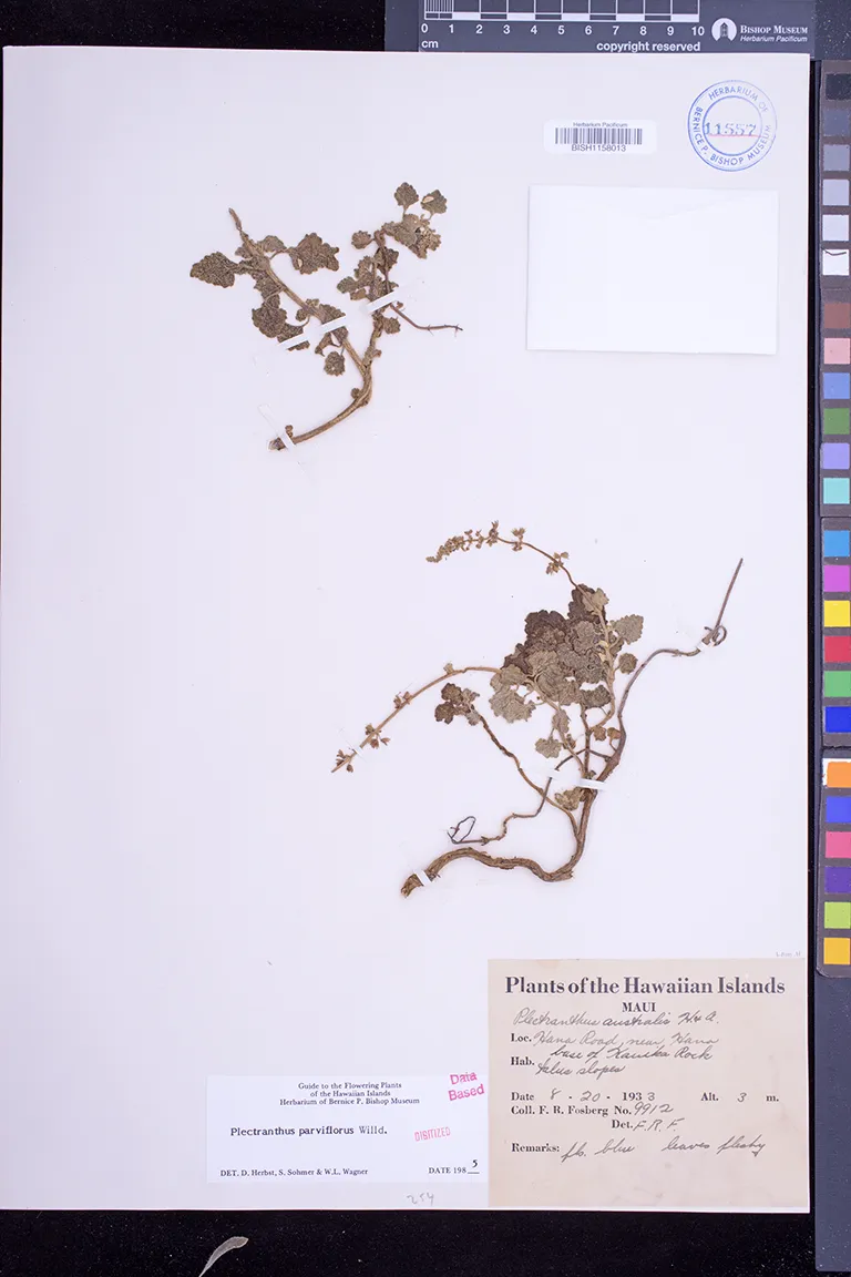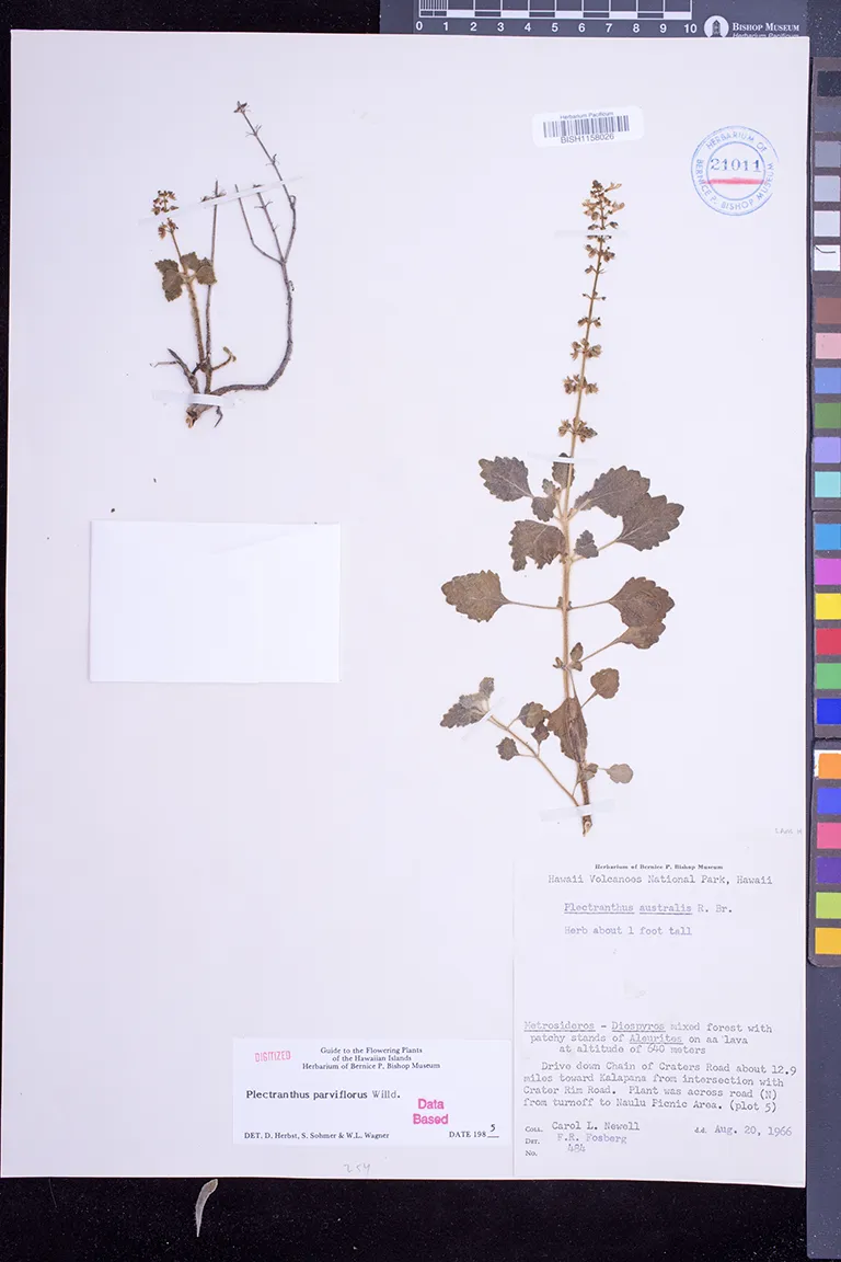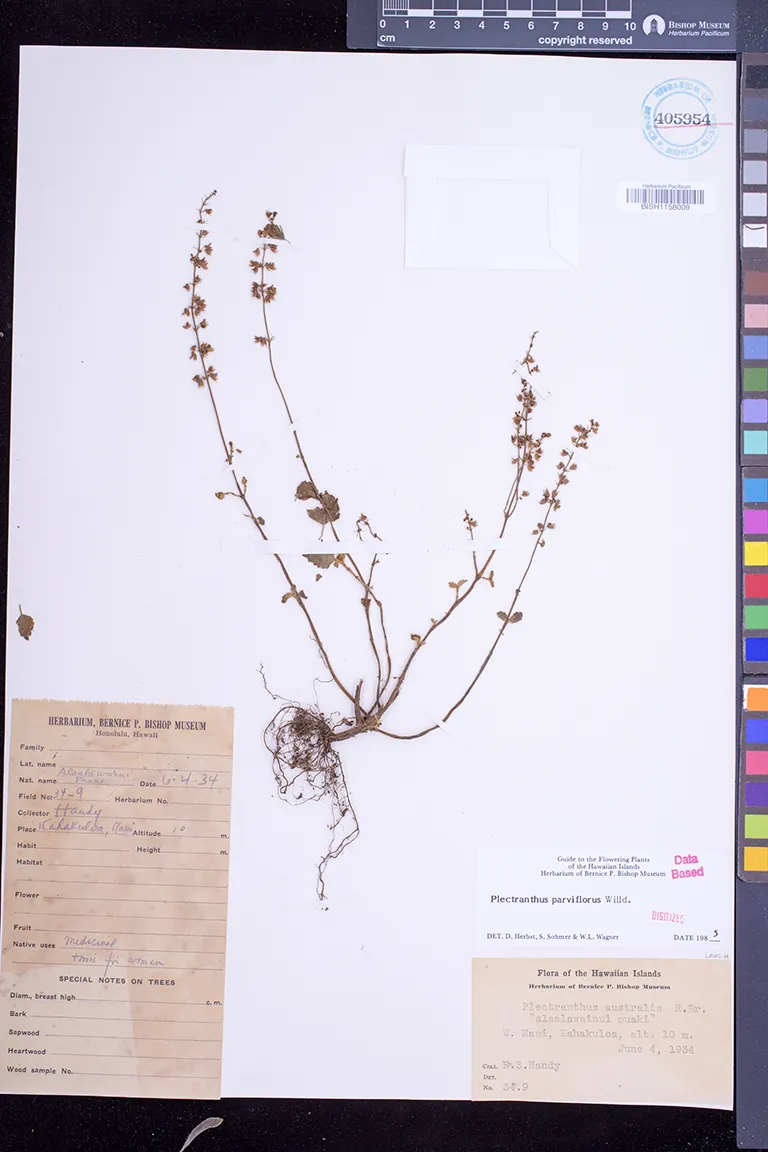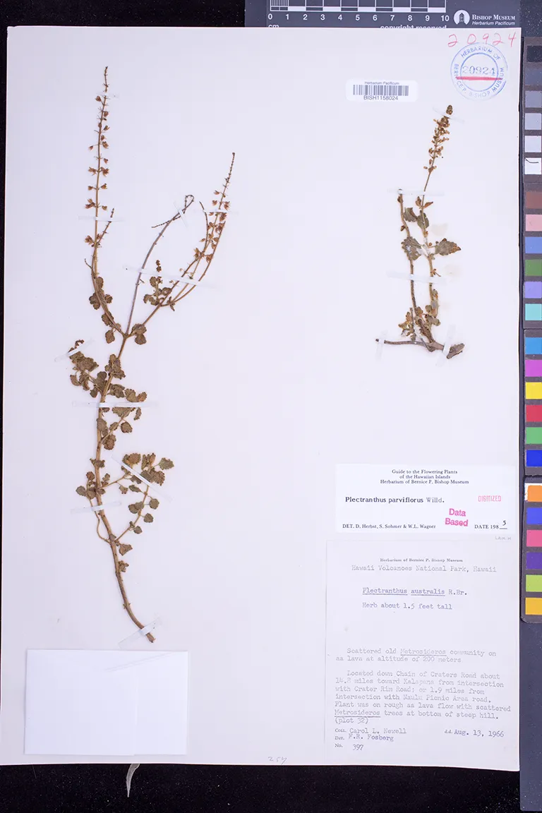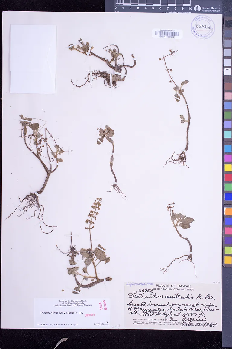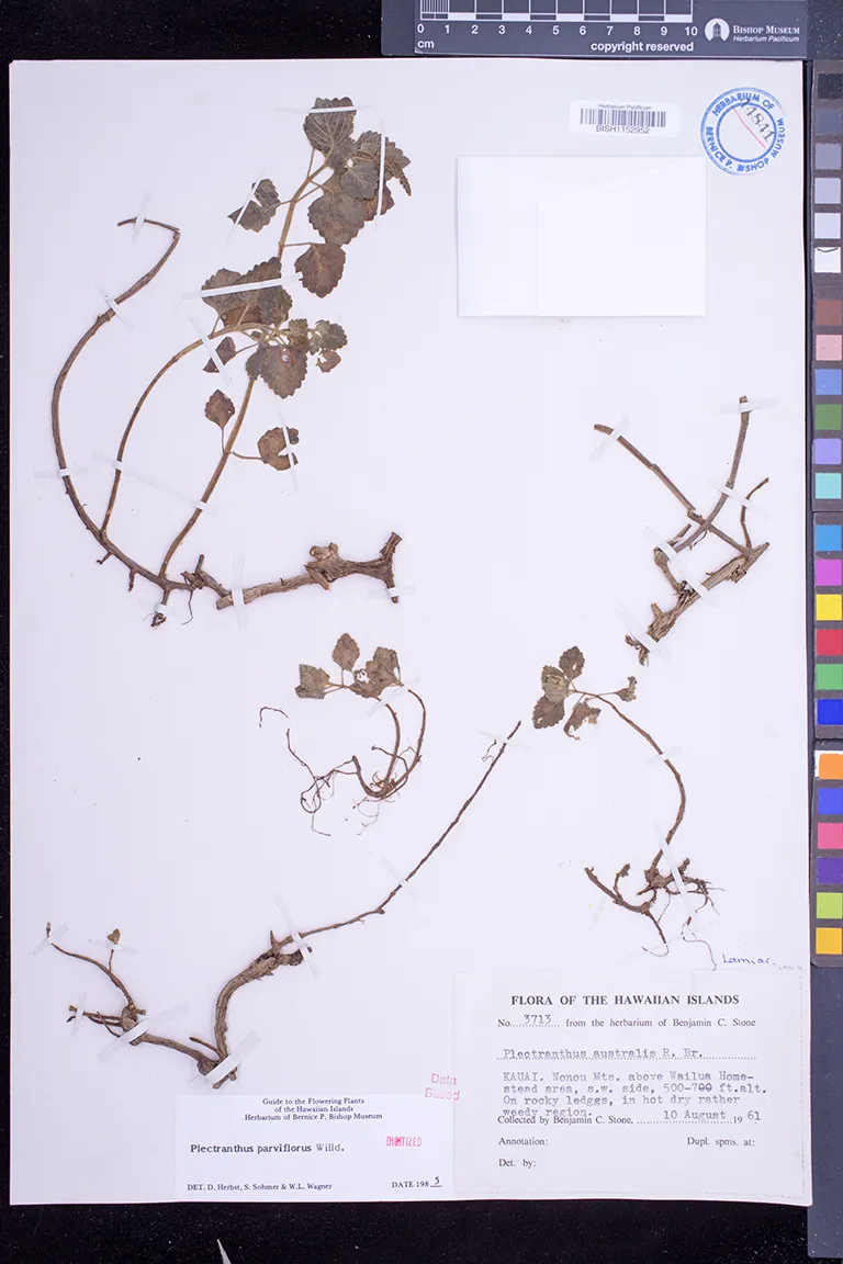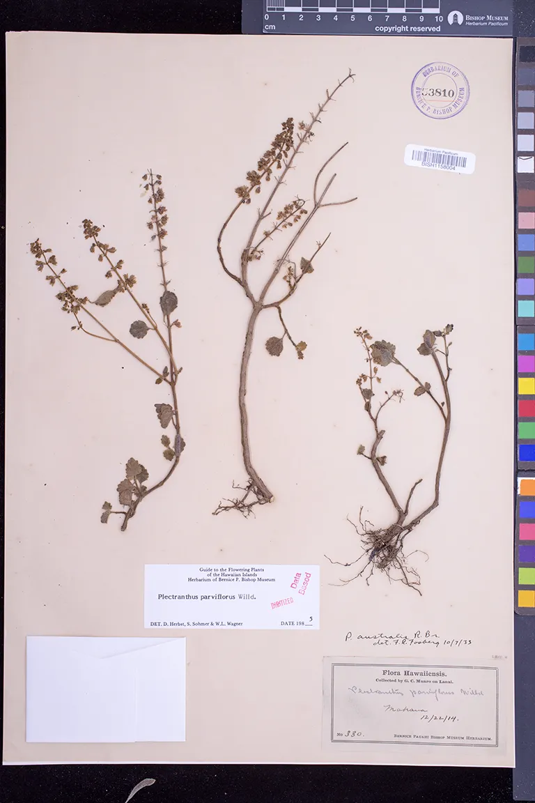 Wagner et al. 1990:827 (Ni, K, O, Mo, L, M, H [as Plectranthus parviflorus]); Paton et al. 2019:21 (Syn. P. parviflorus = C. australis)