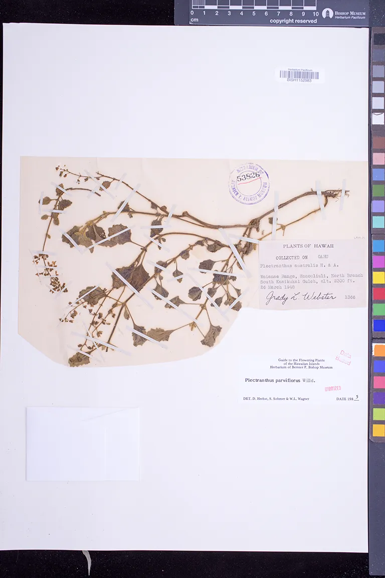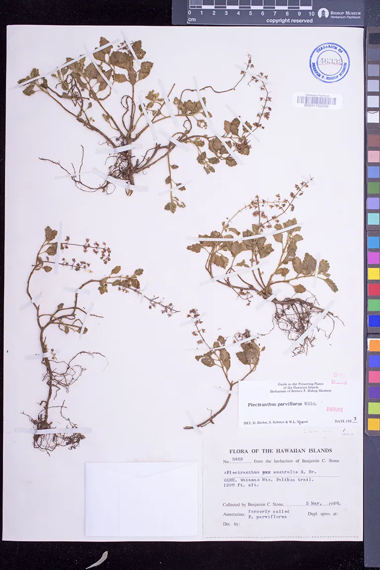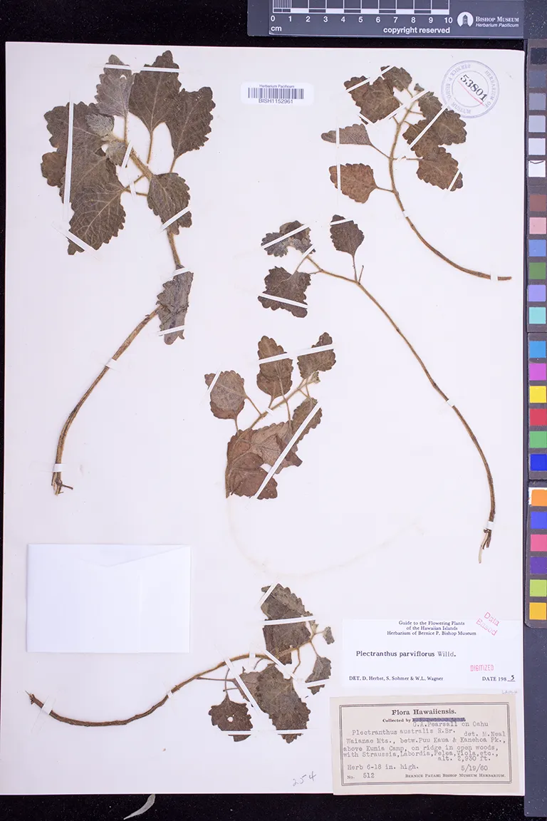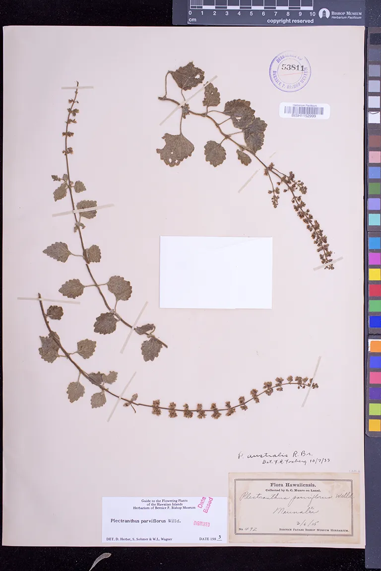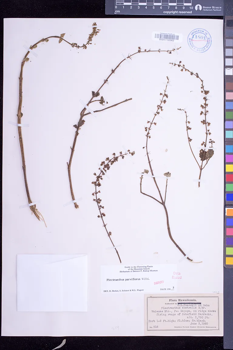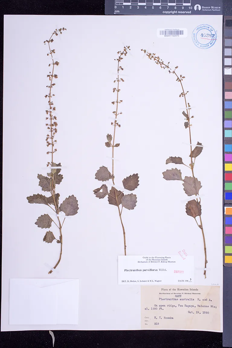 Wagner et al. 1990:827 (Ni, K, O, Mo, L, M, H [as Plectranthus parviflorus]); Paton et al. 2019:21 (Syn. P. parviflorus = C. australis)