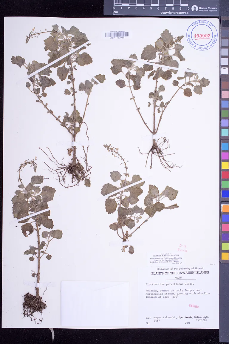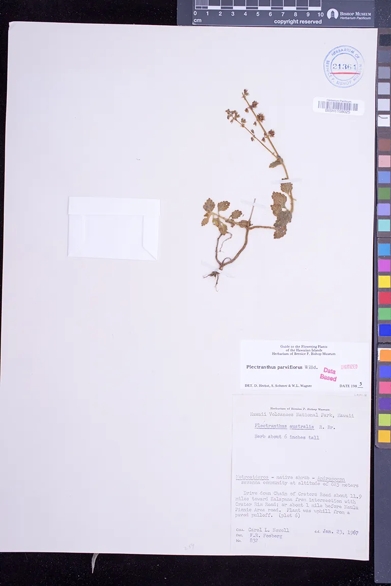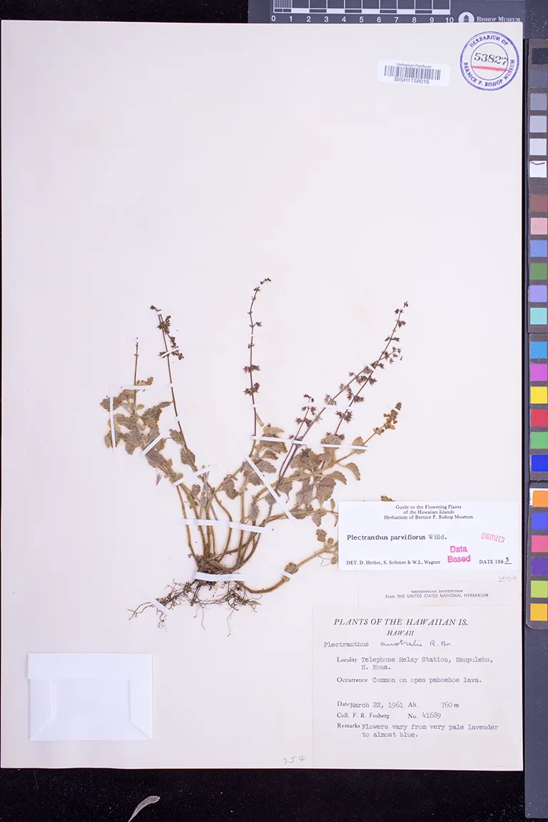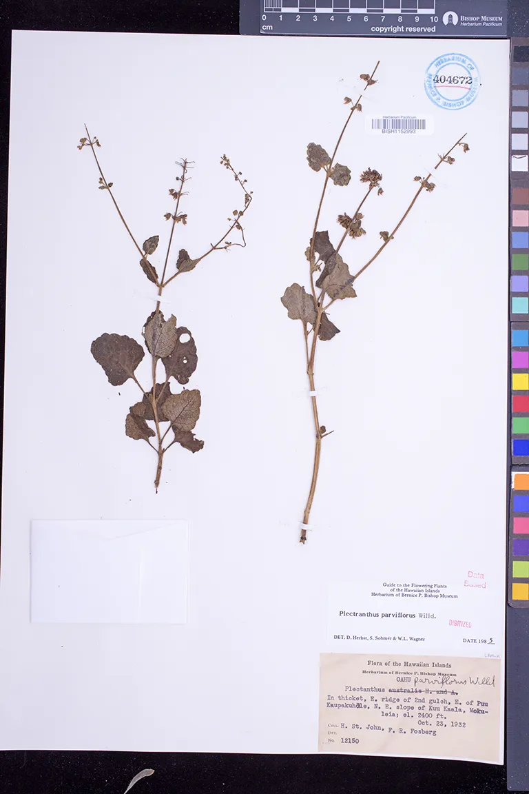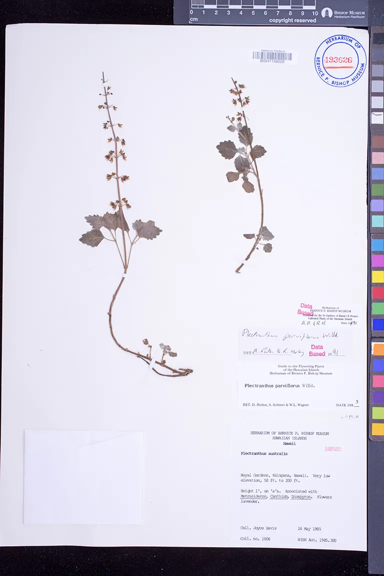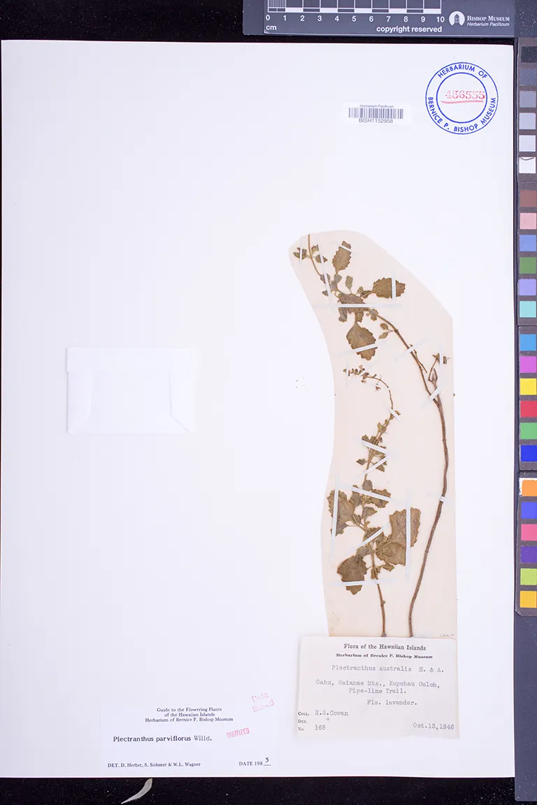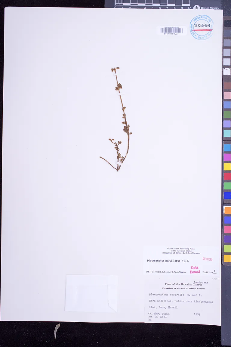 Wagner et al. 1990:827 (Ni, K, O, Mo, L, M, H [as Plectranthus parviflorus]); Paton et al. 2019:21 (Syn. P. parviflorus = C. australis)