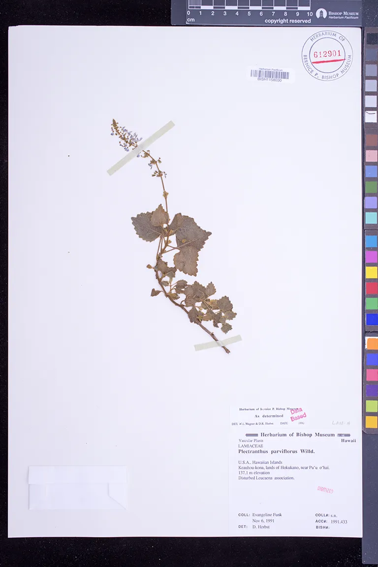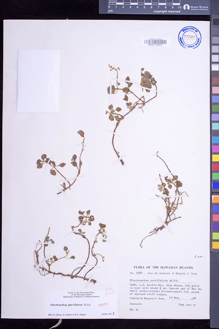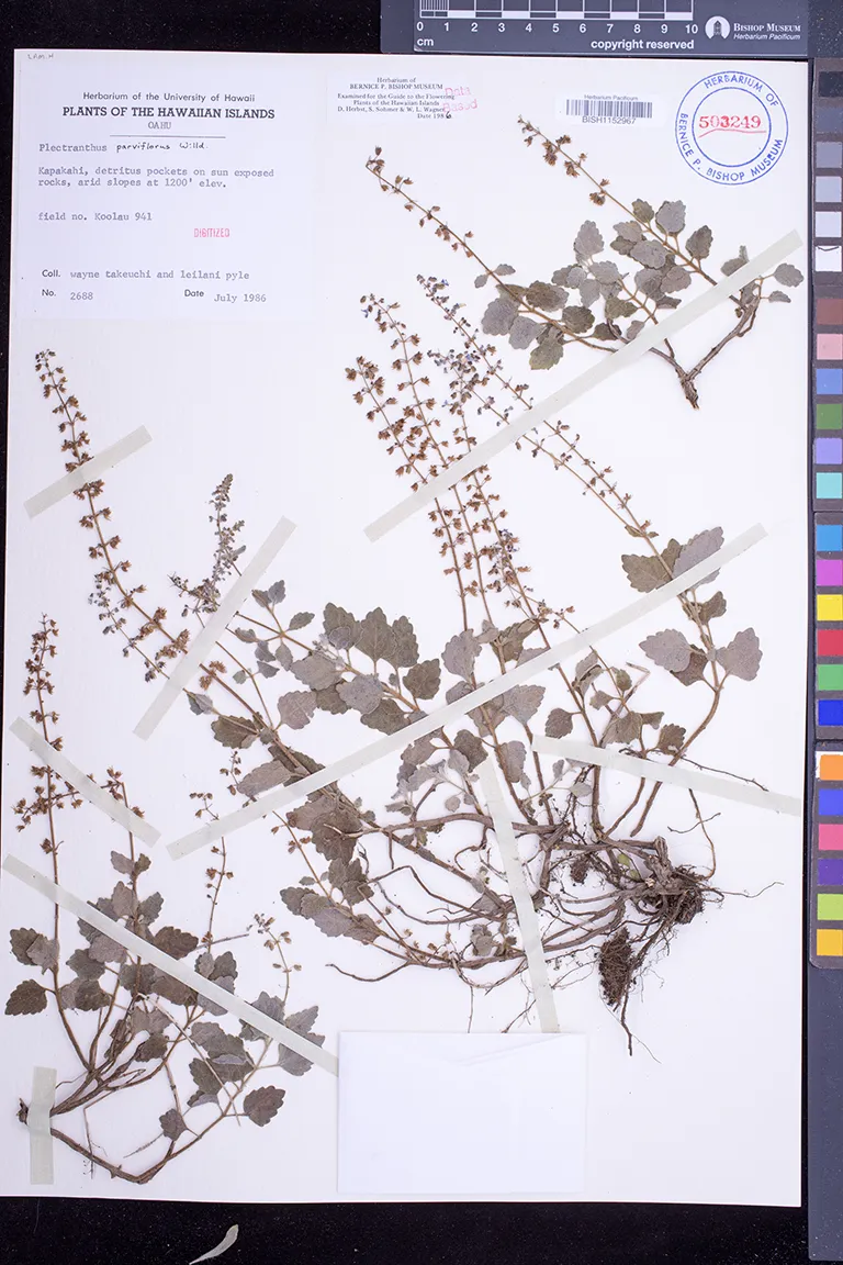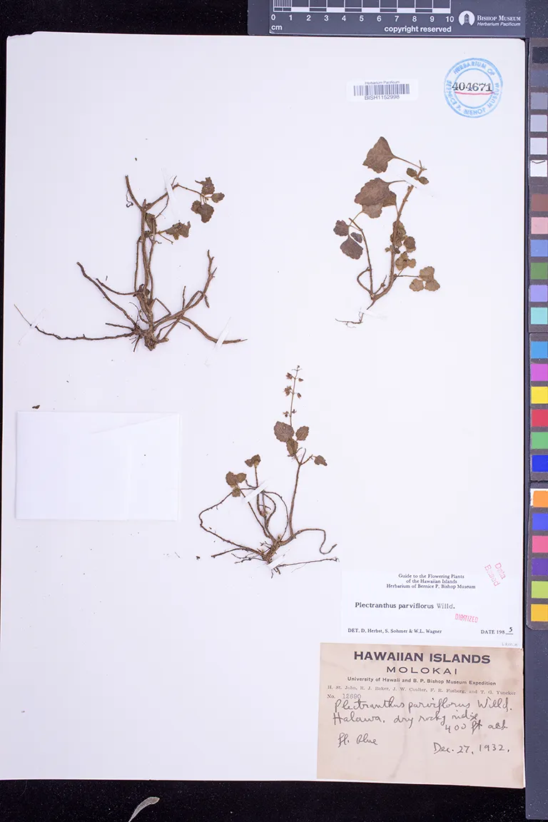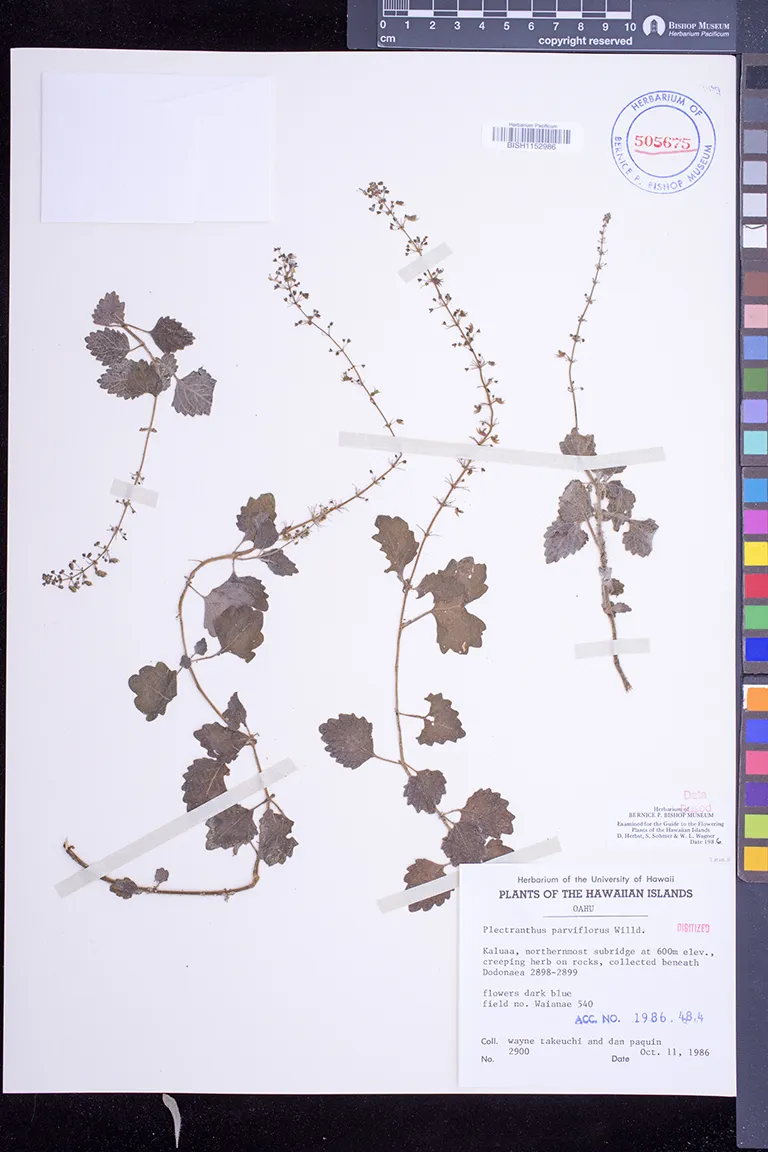 • Plectranthus parviflorus grows quickly and easily from cuttings. Use tip cuttings about 4 inches long with 3 or 4 nodes. NTBG suggests taking the cuttings in the morning. Stick the cutting with at least one node beneath the surface of a well drained propagation medium. Koob recommends coarse sand or vermiculite; NTBG suggests 1 part potting mix to 2 part perlite, or a mix of 1 part potting mix to 1 part fine cinder. NTBG states that rooting hormones are not necessary and that cuttings root in 1 to 3 months. (Koob 1998; NTBG 1994) [Data from Herring, E. C., & Criley, R. A. (2003). The Hawaiian Native Plant Propagation Web Site: Developing a Webbased Information Resource. HortTechnology, 13(3), 545-548. https://www.ctahr.hawaii.edu/hawnprop/]