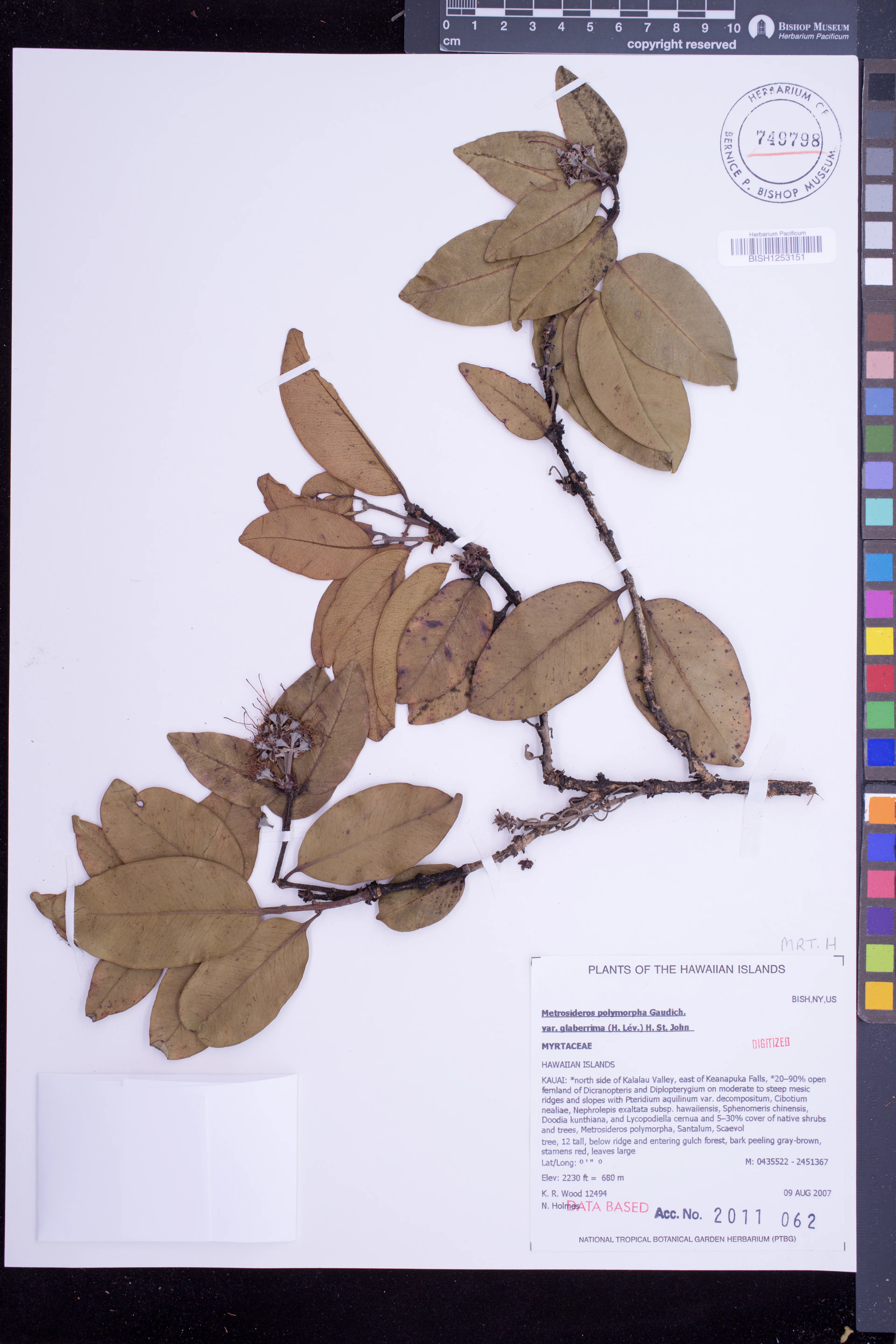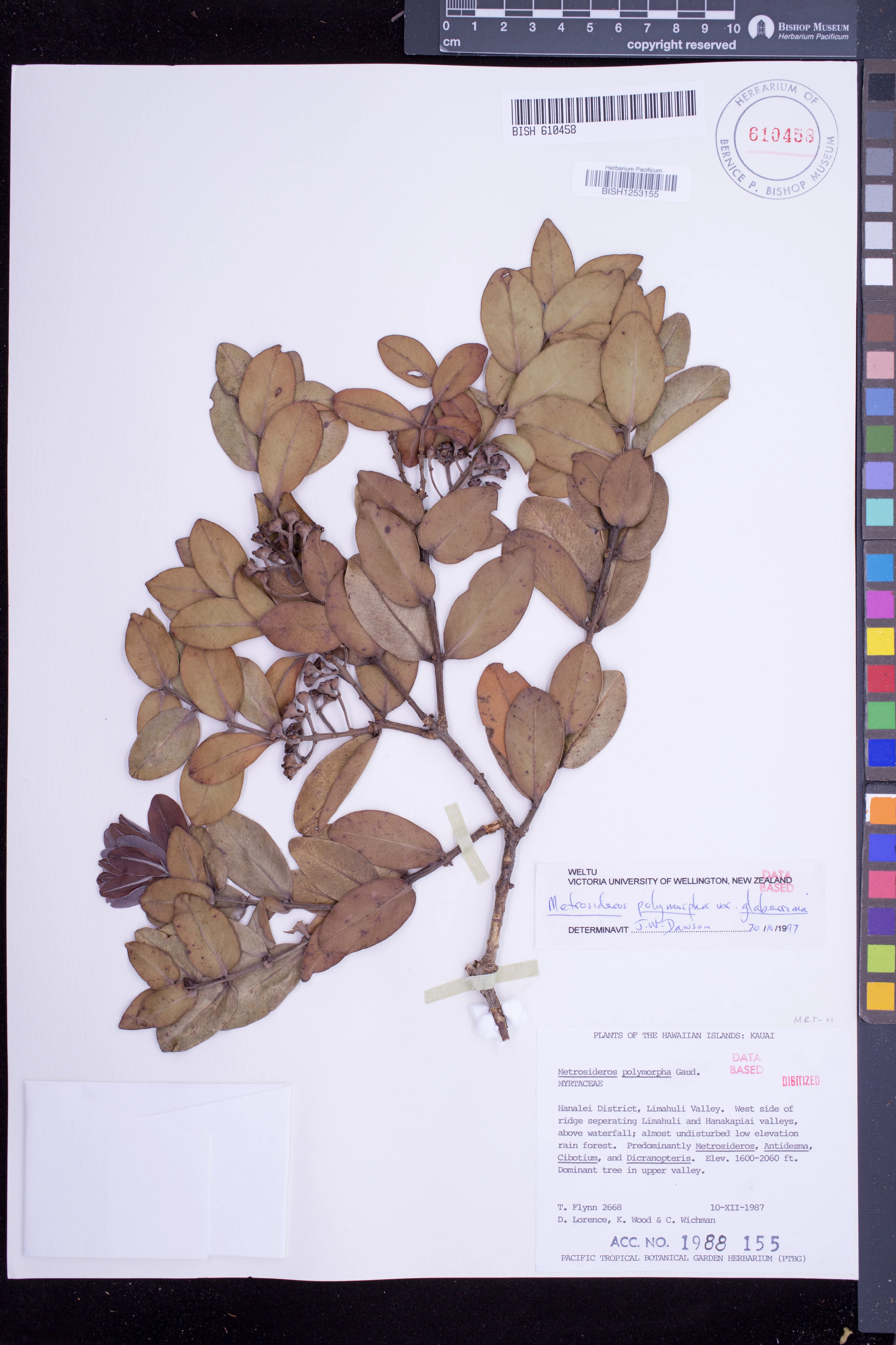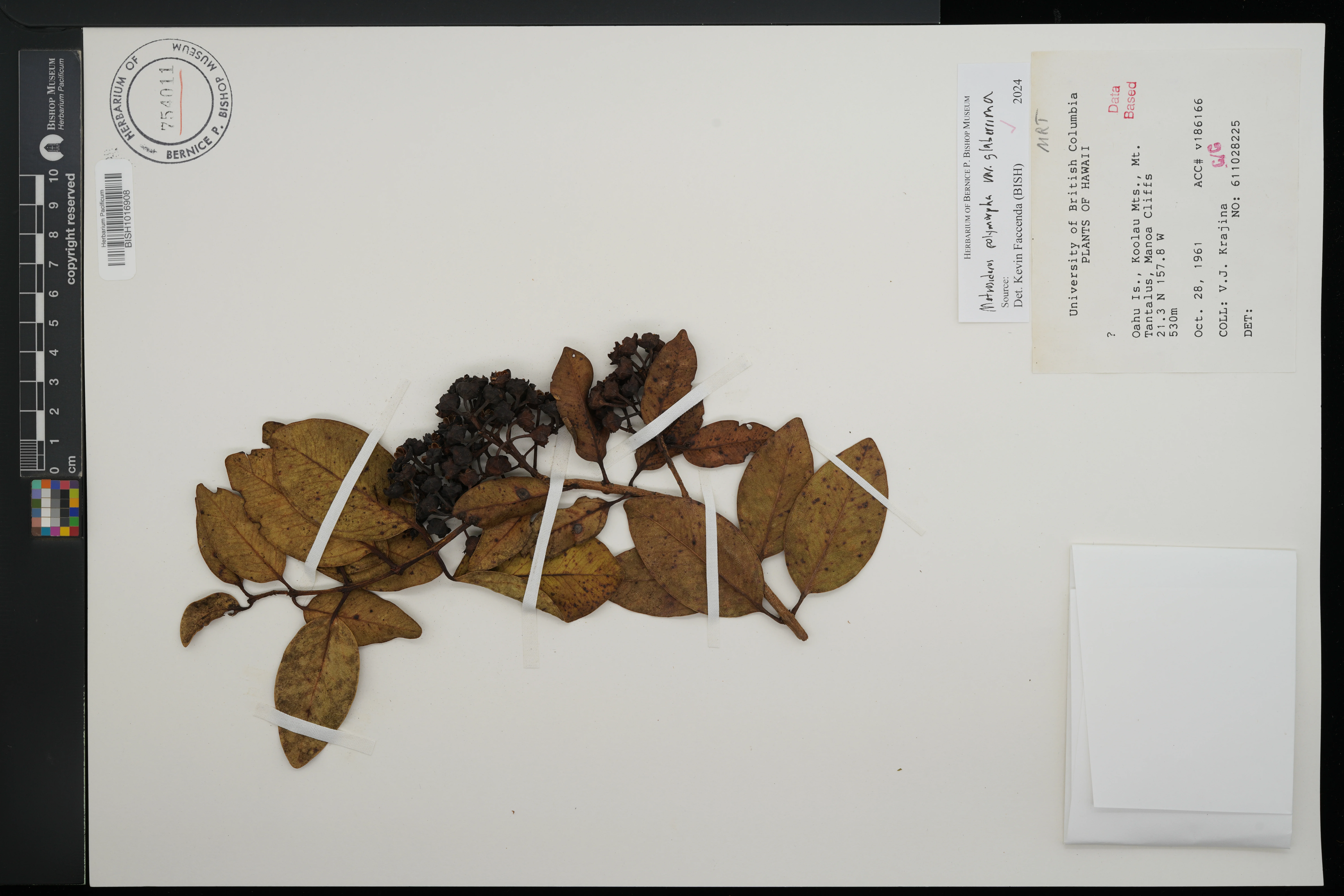 Kawaipapa stream, along stream on wet cliff walls, above Nahikuhana area Metrosideros - Cheirodendron trigynum wet forest with Sadleria spp., Pipturus albidus, Clemontia kakeana, Polyscias oah |