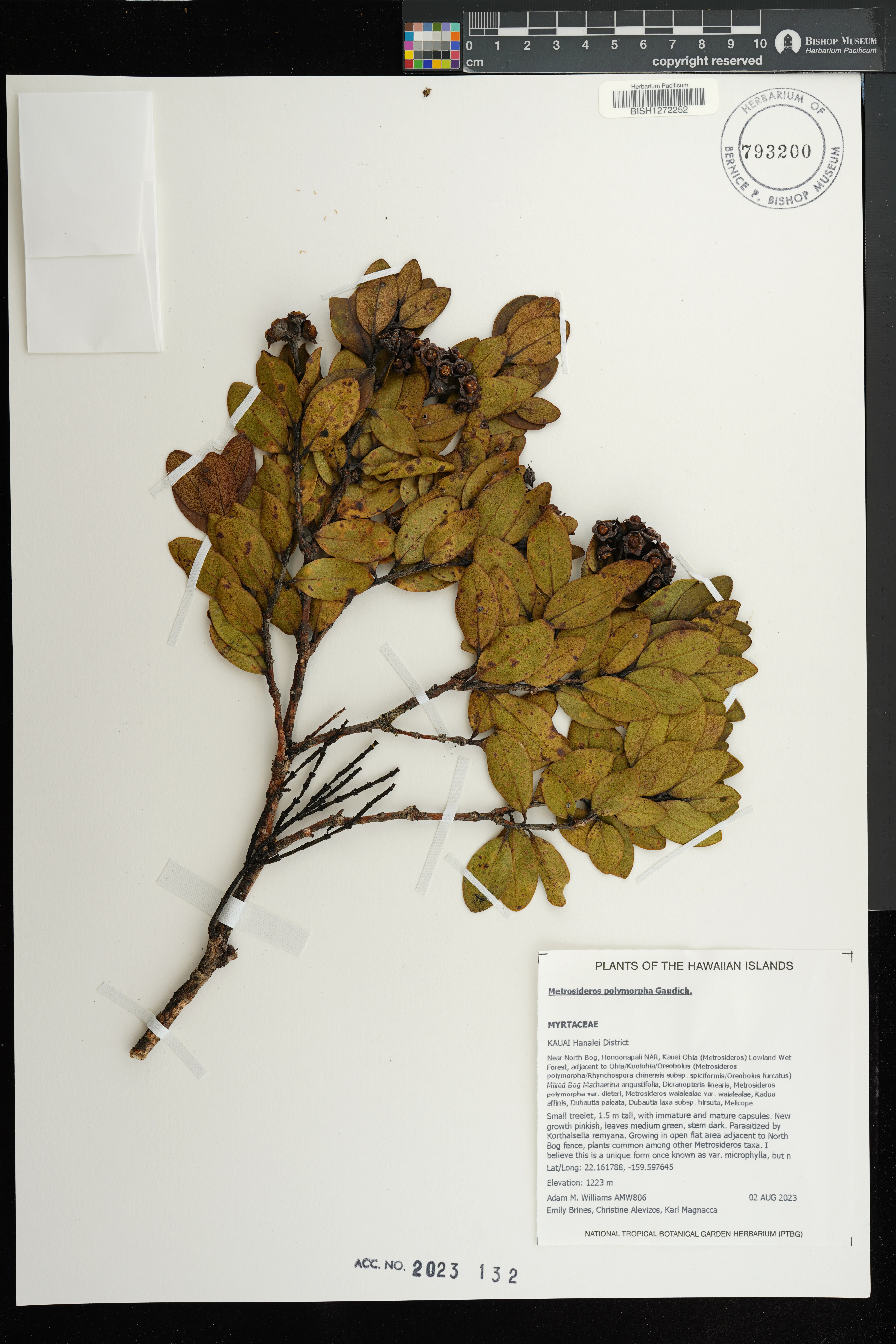 common small trees in Lowland Wet Forest; vegetation: metrosideros, dicranopteris, cheirodendron, diplopterygium, broussaisia, vaccinium, melicope, clermontia, coprosma, kadua, cibotium psidium, tibouchina, clidemia, hedychium |