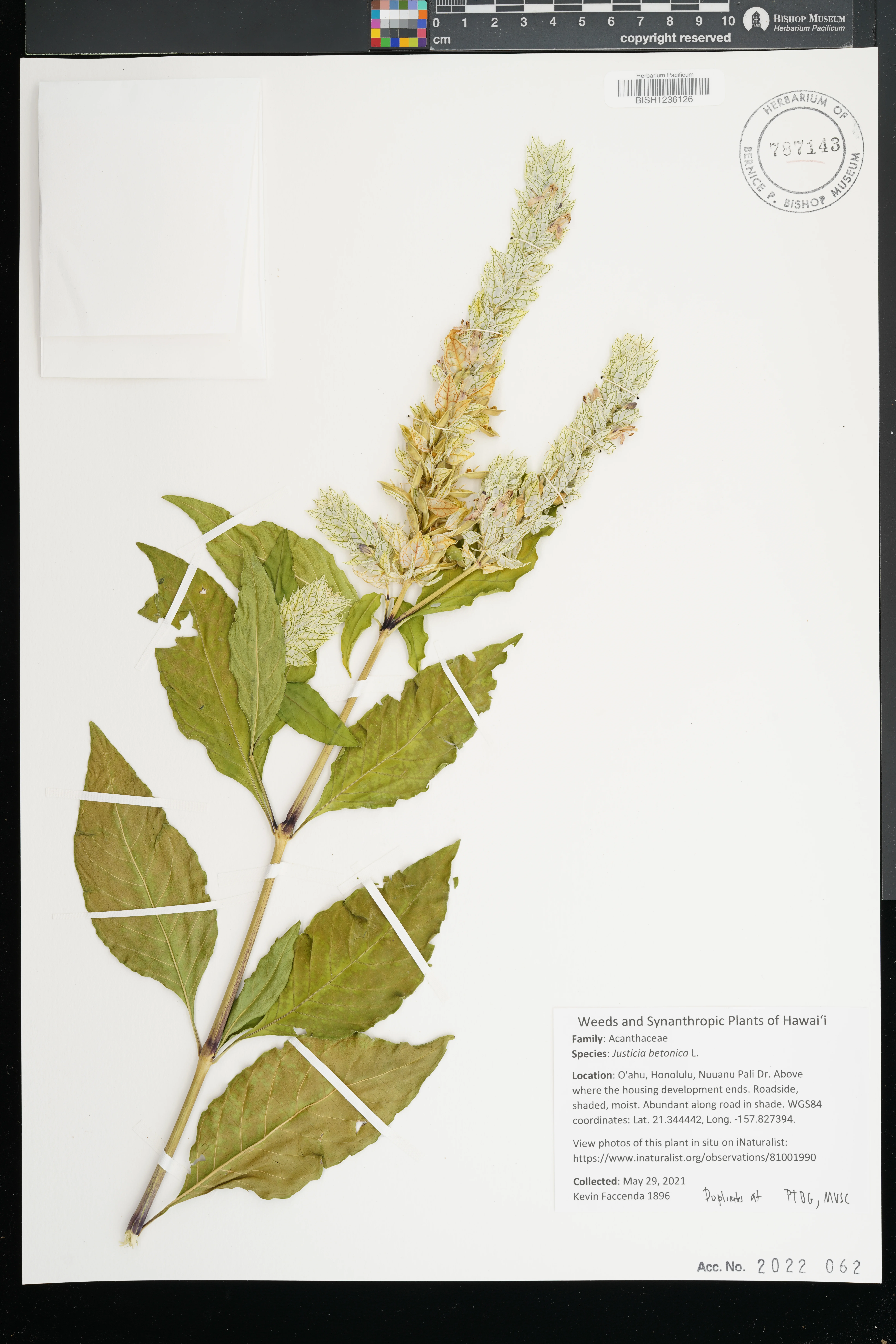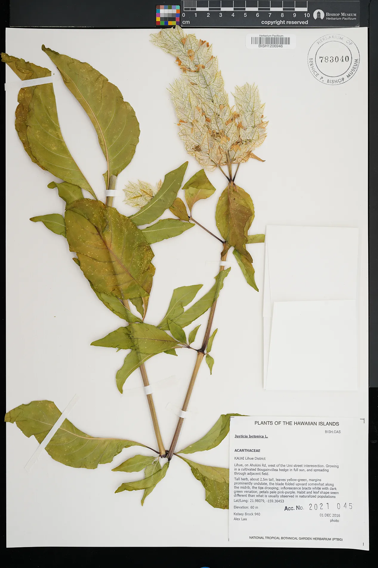 Flowers in axillary and terminal spikes. each inflorescence subtended by 3 white bracts with conspicuous green veins, the large outer bract ovate, ca. 15 mm long, 10 mm wide, the inner 2 about as long, ca. 5 mm wide.