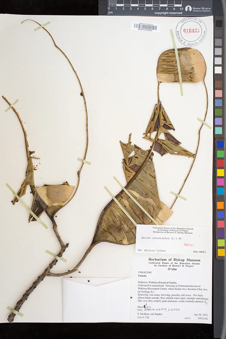 | 2 | Entada polystachya | (L.) DC. | Foster Botanic Garden | PRESERVED_SPECIMEN | Pearsall, G.A. | s.n. | Oahu | BISH | ||
