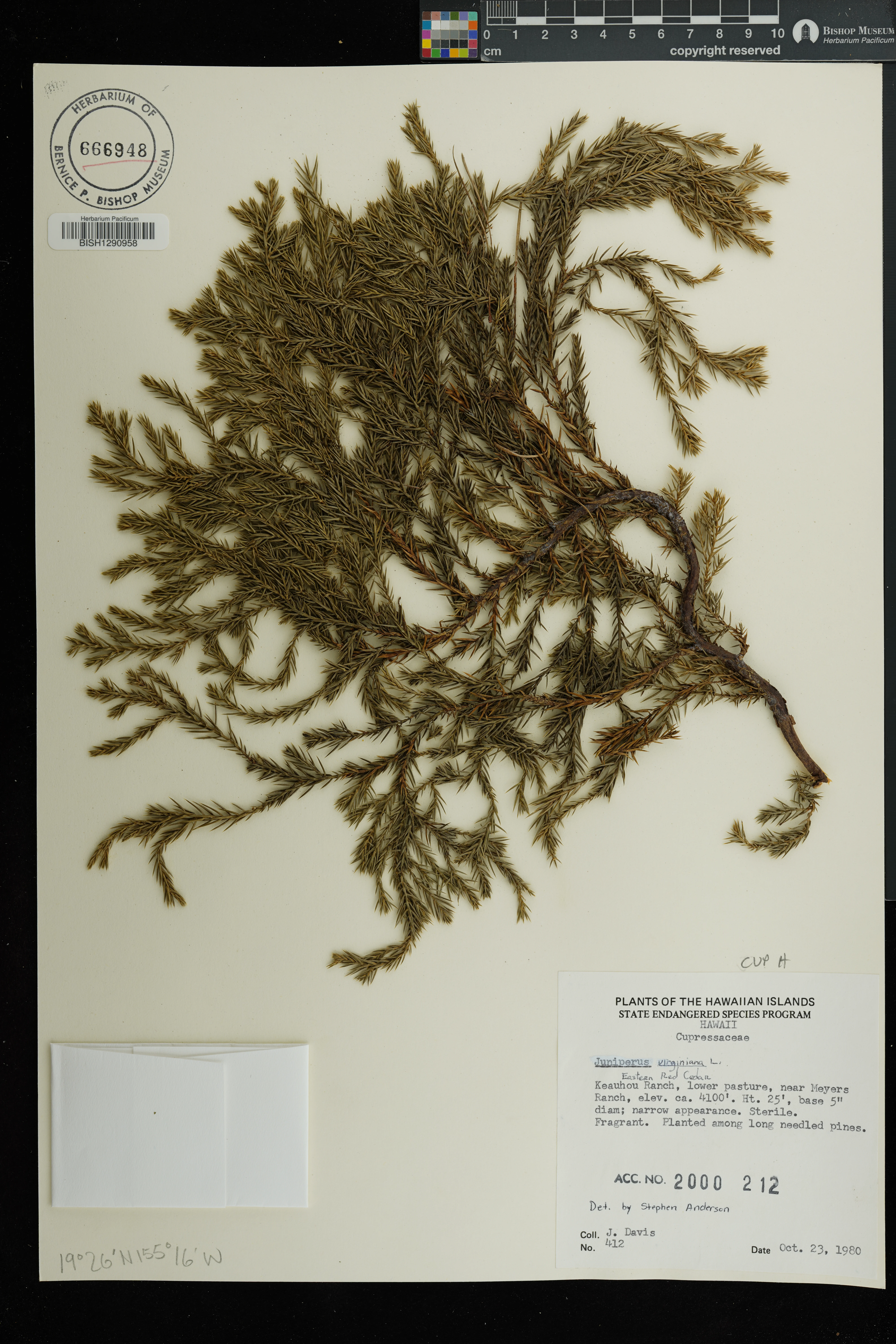 | 2 | Juniperus virginiana | L. | Keauhou Ranch, lower pasture, near Meyers Ranch | Planted among long needled pines. | PRESERVED_SPECIMEN | Davis, J. | Collector Number: 412 | Hawaii | BISH | 10/23/1980 |