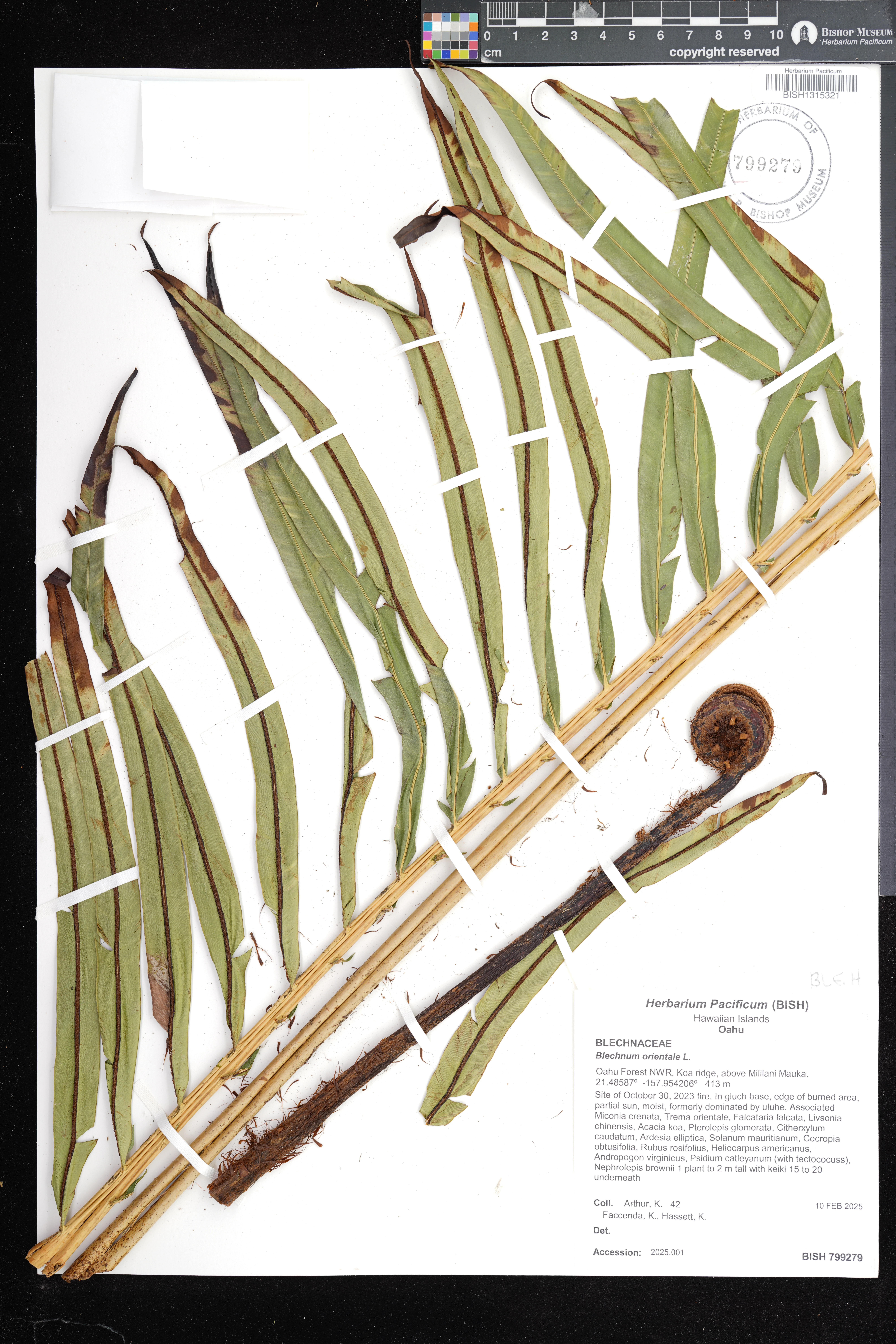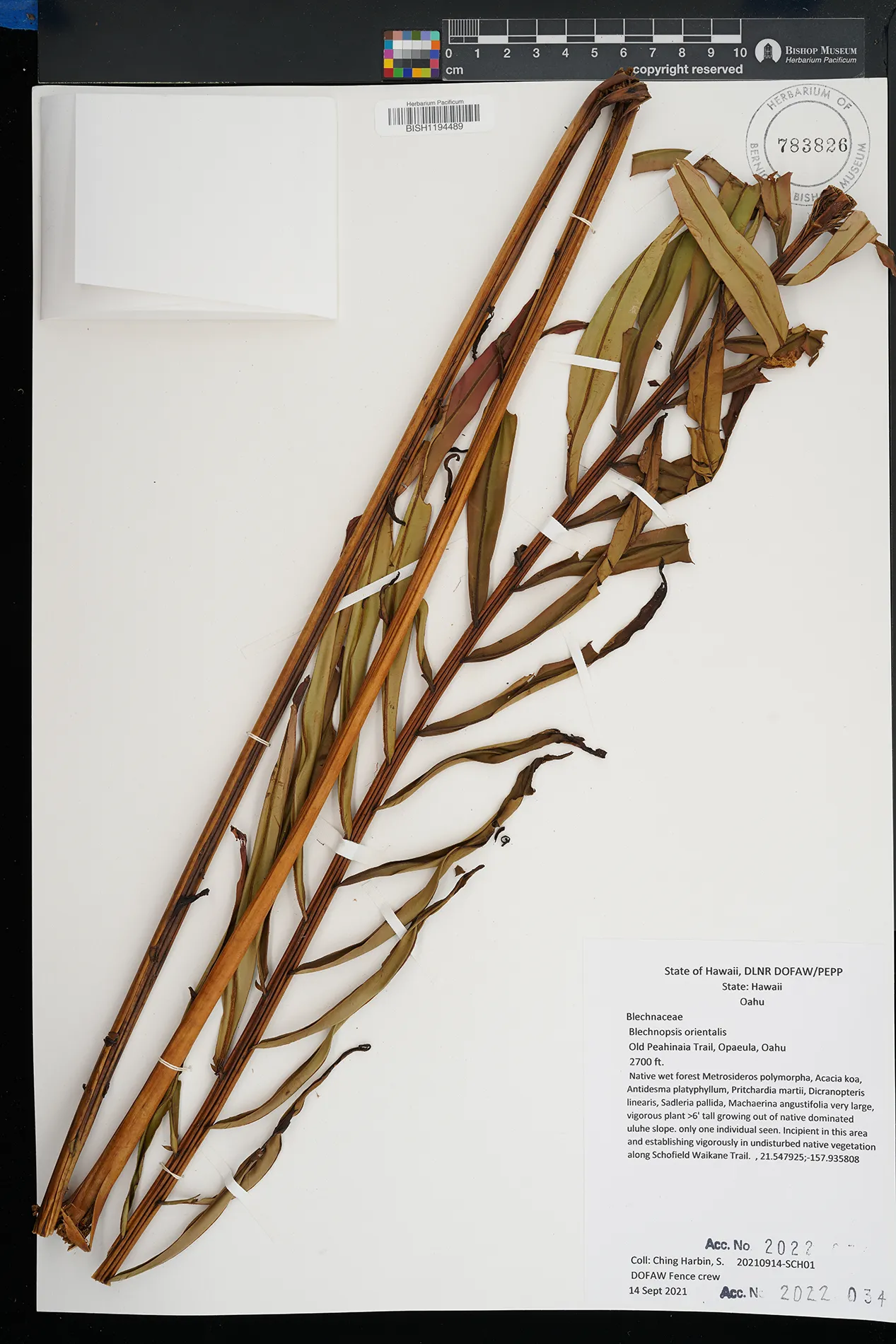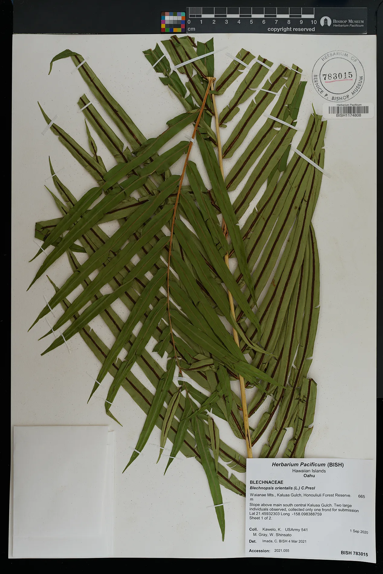 Lau & Frohlich 2012:10 (NEWNAT/O, DESCR [as Blechnum orientale]); Gasper et al. 2016:205/Pteridophyte Phylogeny Group 2016:583 (Syn. Blechnum orientale = Blechnopsis orientalis)