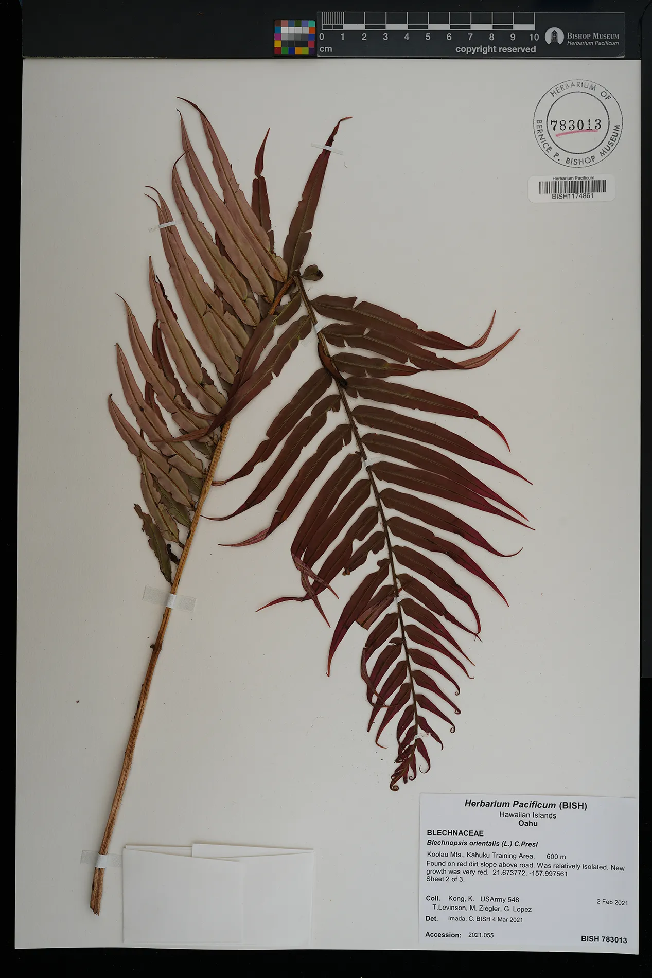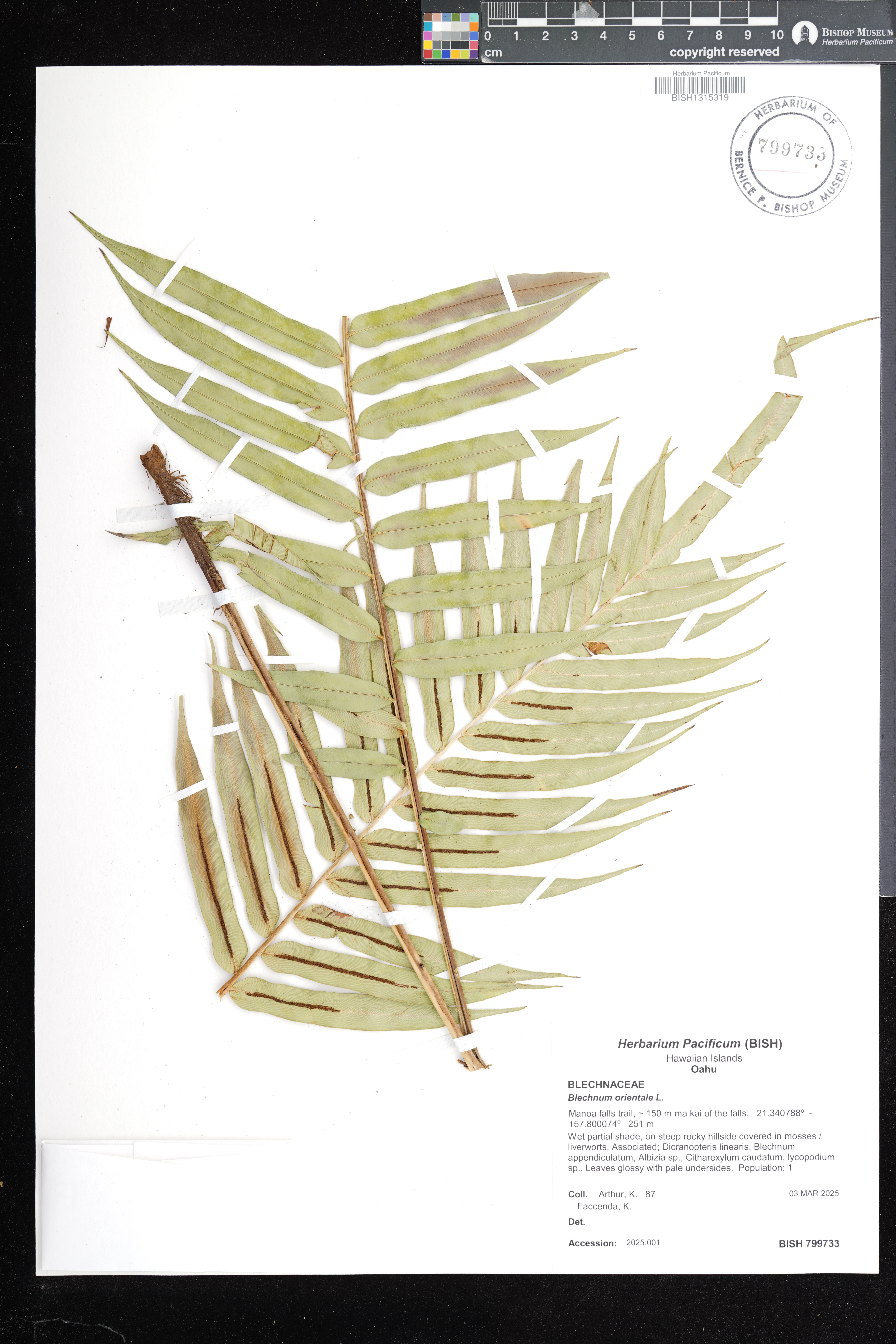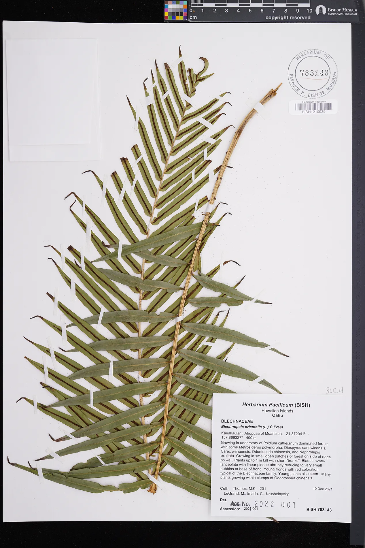 Lau & Frohlich 2012:10 (NEWNAT/O, DESCR [as Blechnum orientale]); Gasper et al. 2016:205/Pteridophyte Phylogeny Group 2016:583 (Syn. Blechnum orientale = Blechnopsis orientalis)
