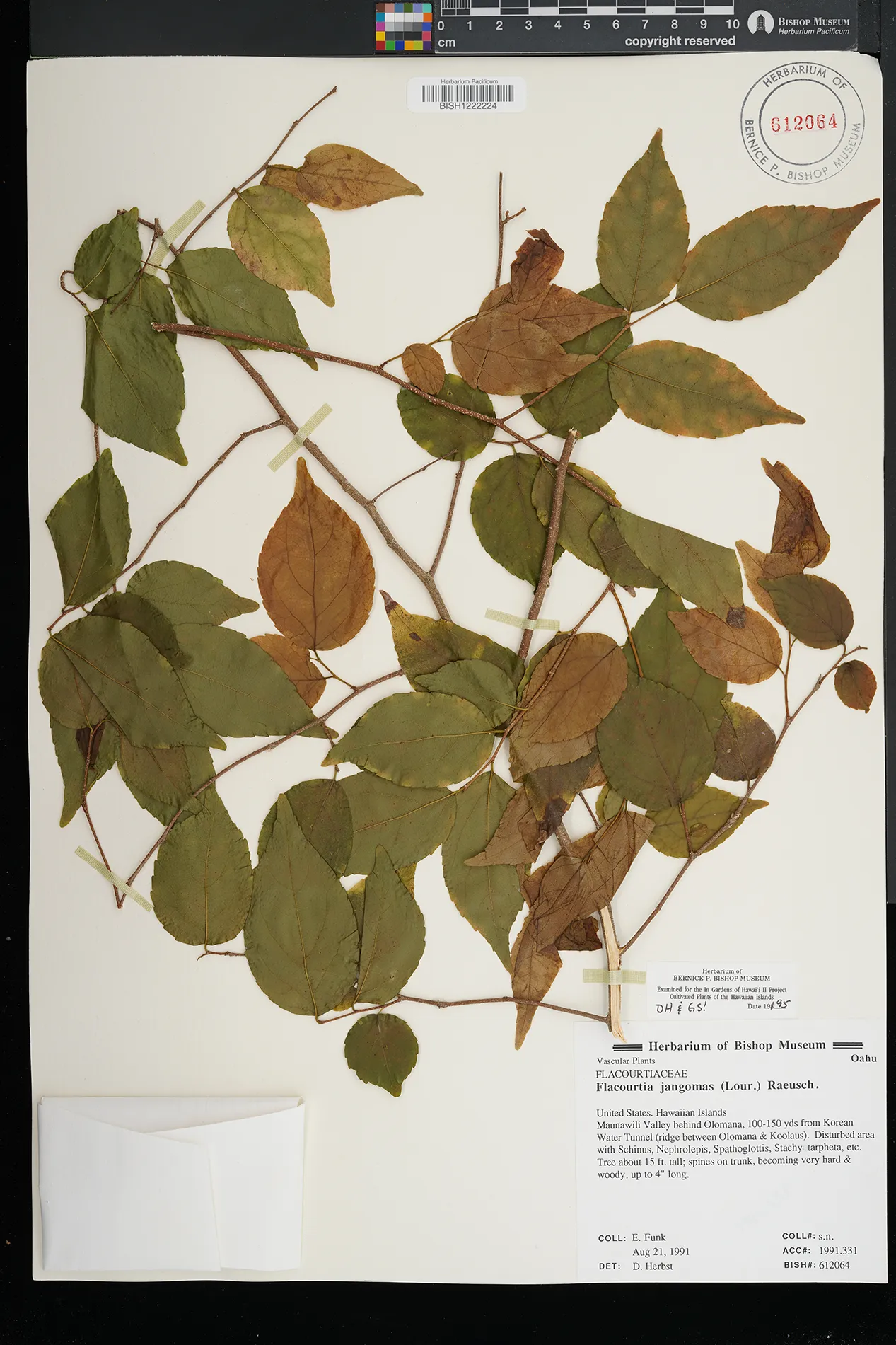 | 12 | Flacourtia jangomas | (Lour.) Raeusch. | Waimea Arboretum | PRESERVED_SPECIMEN | Miller, J.S. Merello, M. | Collector Number: 7866 | Oahu | BISH | 7/31/1992 | |