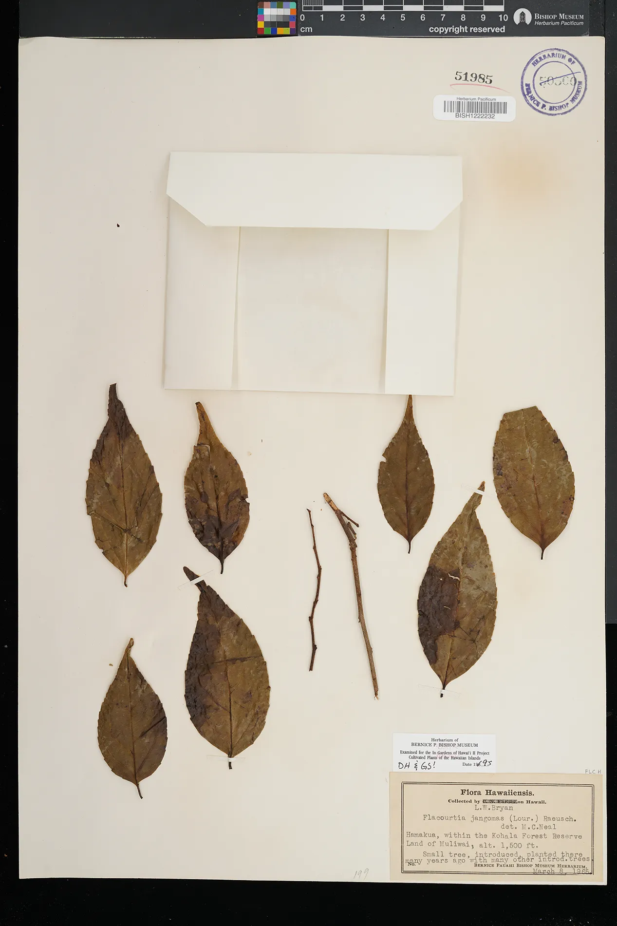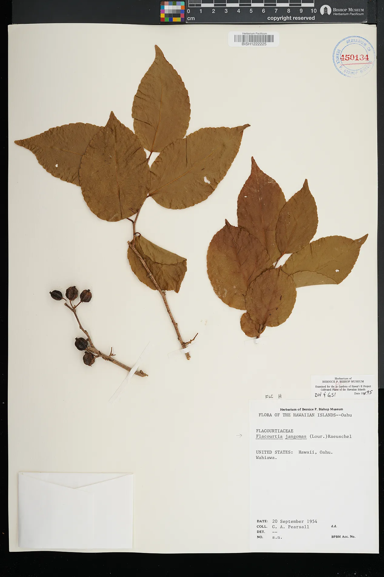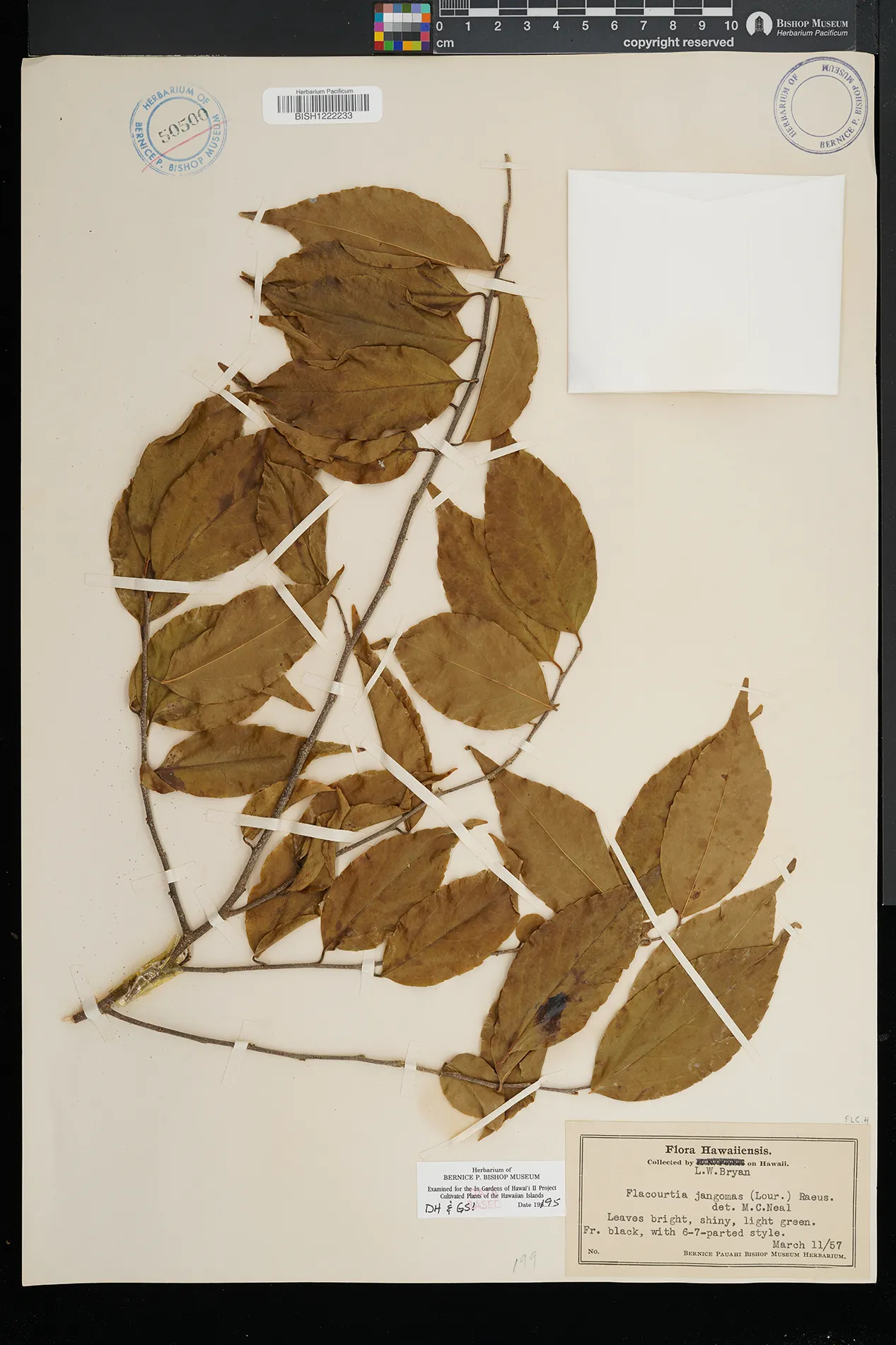 | 22 | Flacourtia jangomas | (Lour.) Raeusch. | Hawaii | PRESERVED_SPECIMEN | Bryan, L.W. | s.n. | Hawaii | BISH | 3/11/1957 | |